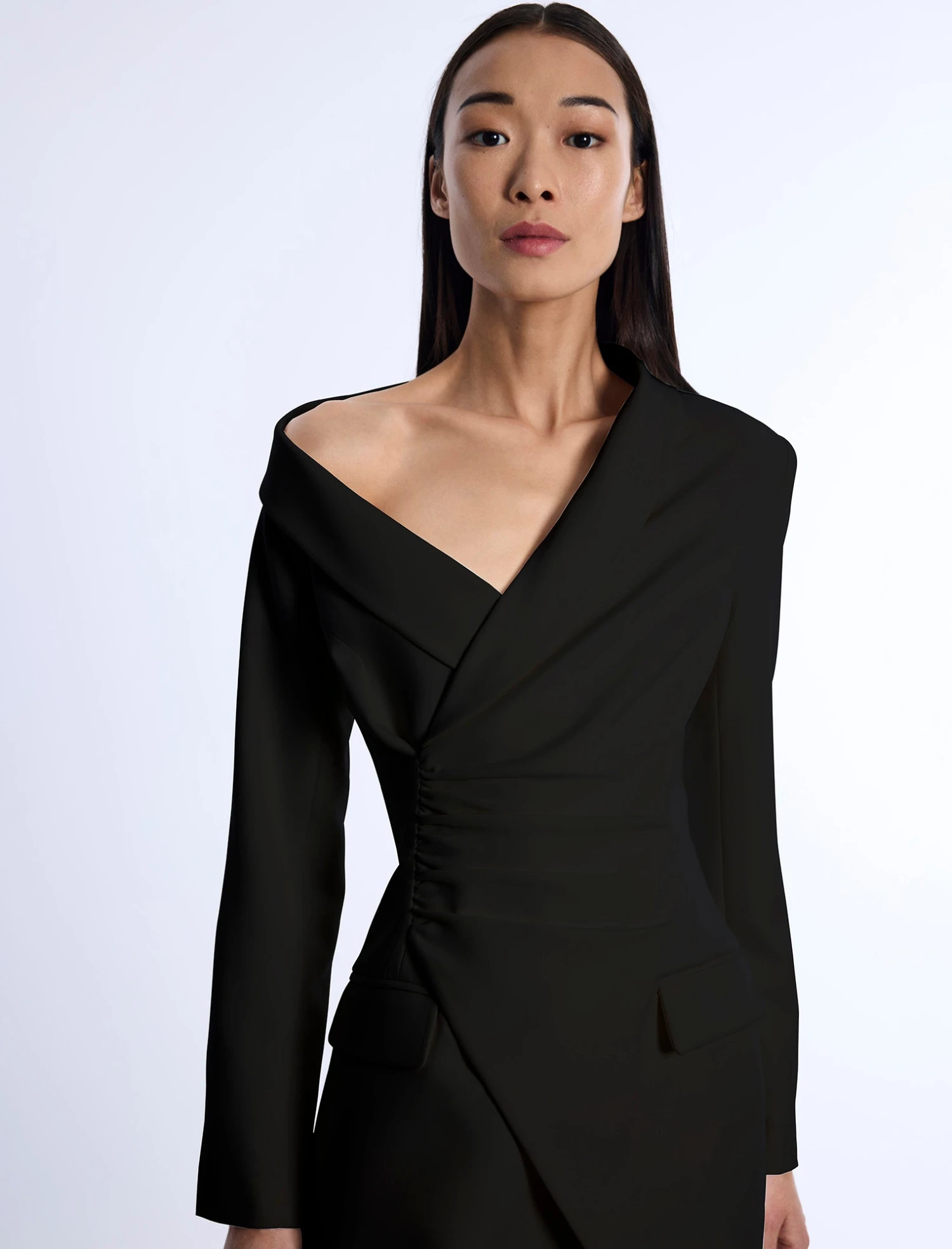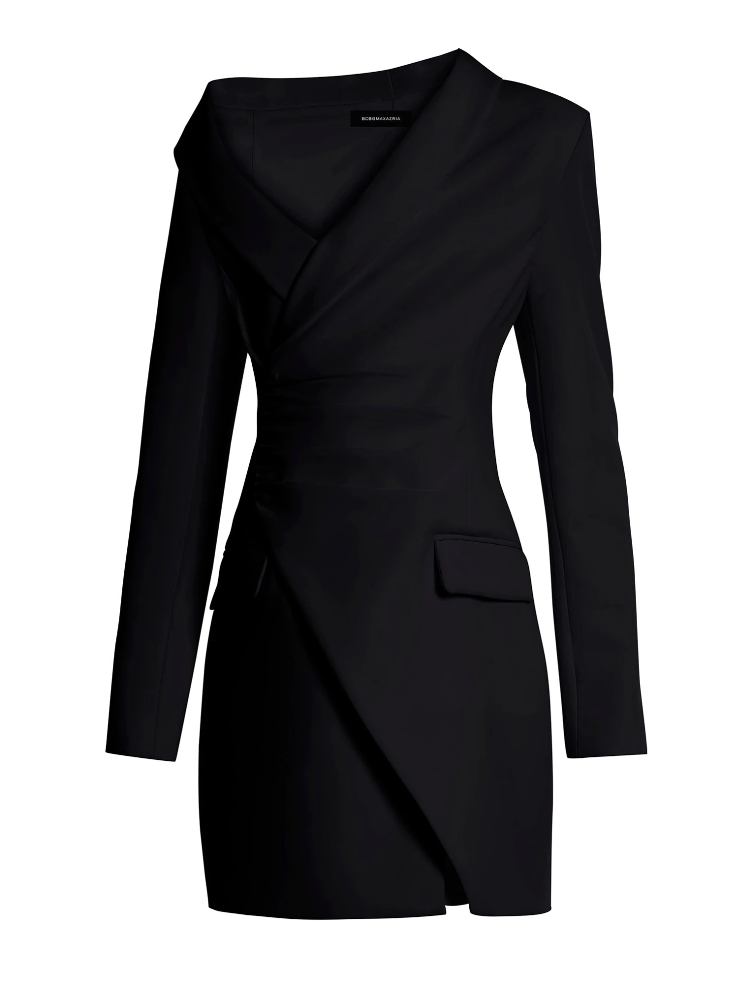 Sophisticated mini dress crafted from smooth, structured fabric for a modern, polished look. Topped with an asymmetrical off-the-shoulder neckline and subtle ruching detail. Done in a long-sleeve, tailored mini silhouette with sleek flap pockets. Finished with a concealed back zipper and front summary closure.