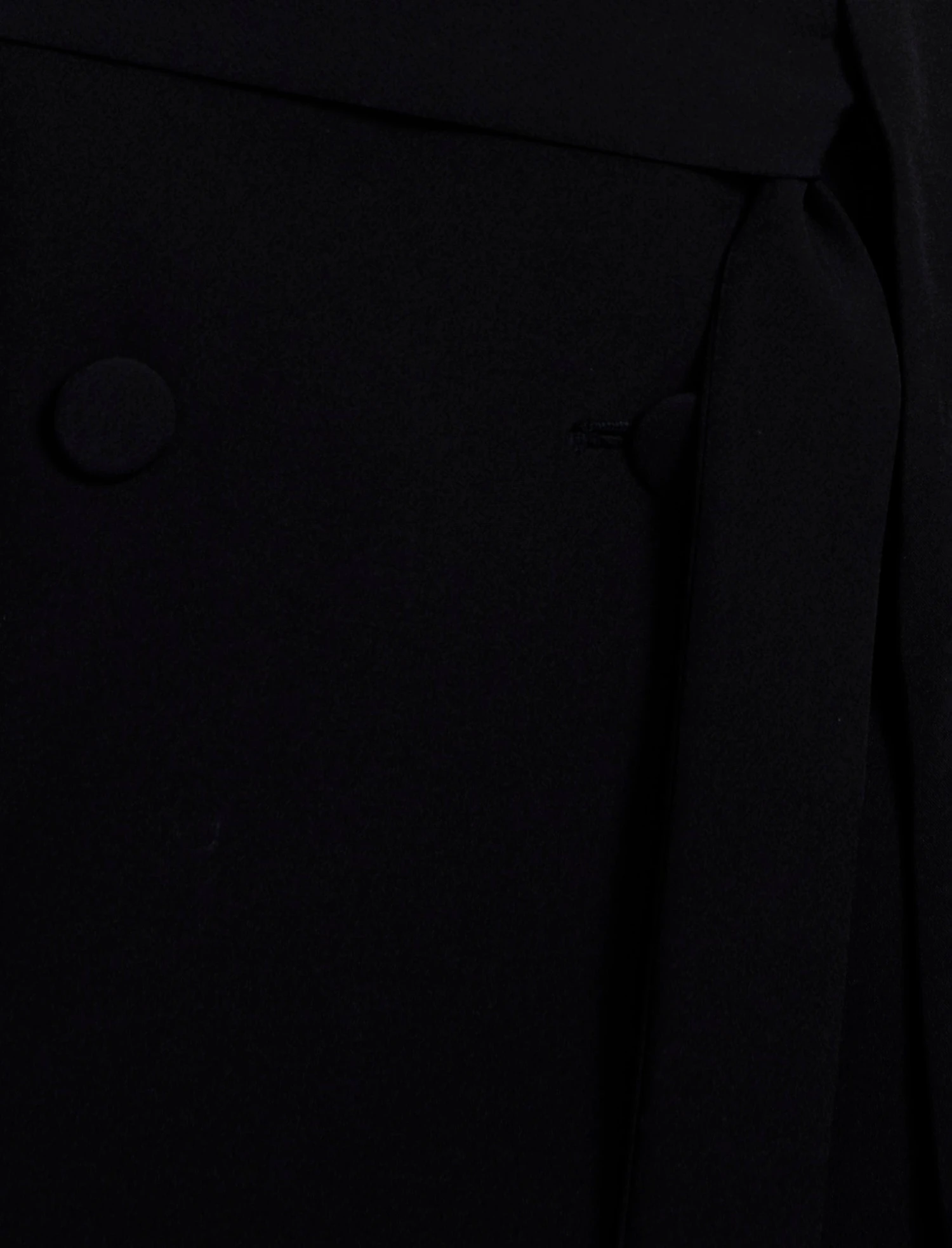 Features a sharp notched collar, double-breasted front, and flap pockets for a polished finish. Cinched at the waist with a self-tie belt to balance the strong shoulder line with a feminine silhouette. Designed to hit at the hip—layer it over sheer lace or fluid trousers.