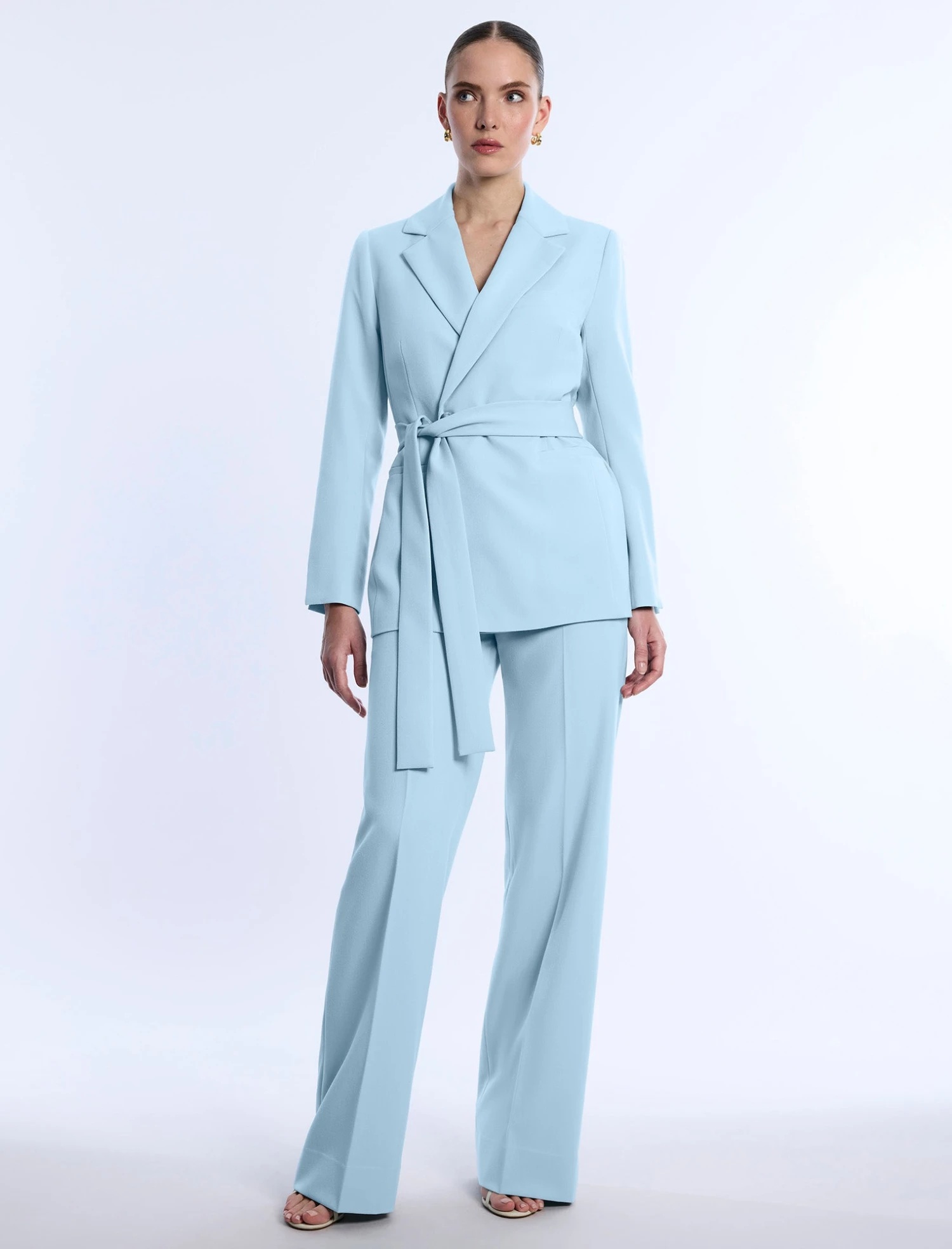Belted blazer crafted from premium fabric in a soft pastel hue. Topped with a notched lapel collar and wrap front. Done in a tailored silhouette with a self-tie belt for versatile styling. Finished with clean lines and structured tailoring.