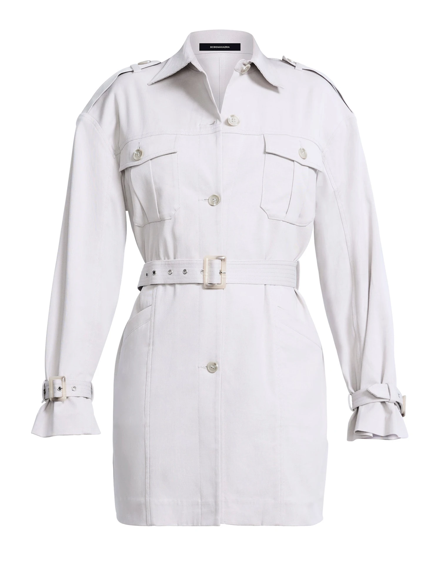 Belted mini dress crafted from structured fabric in a soft neutral hue. Topped with a pointed collar and flap pockets for a utilitarian touch. Done in a long-sleeve, tailored mini silhouette with a cinched waist. Finished with a front summary closure, belted detail, and adjustable cuffs.