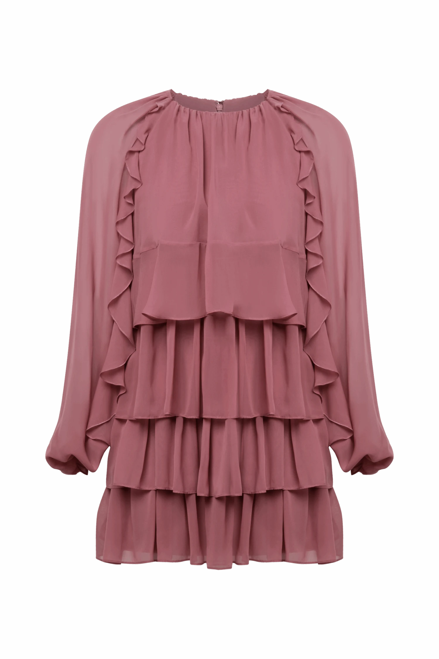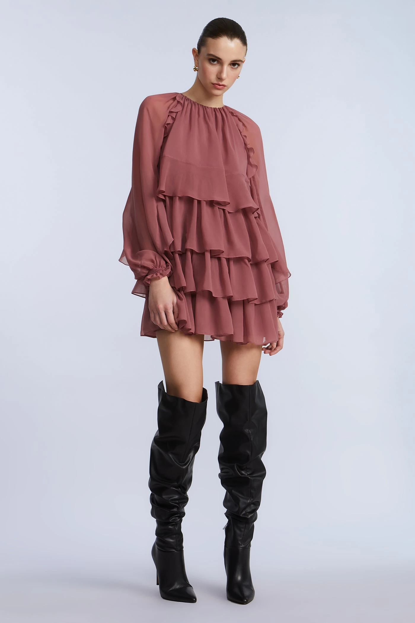 Tiered chiffon mini dress with ruffle detailing at the sleeves and neckline. Designed with voluminous long sleeves and a softly gathered silhouette that floats with movement. Perfect for date nights, rooftop drinks, or fall getaways.