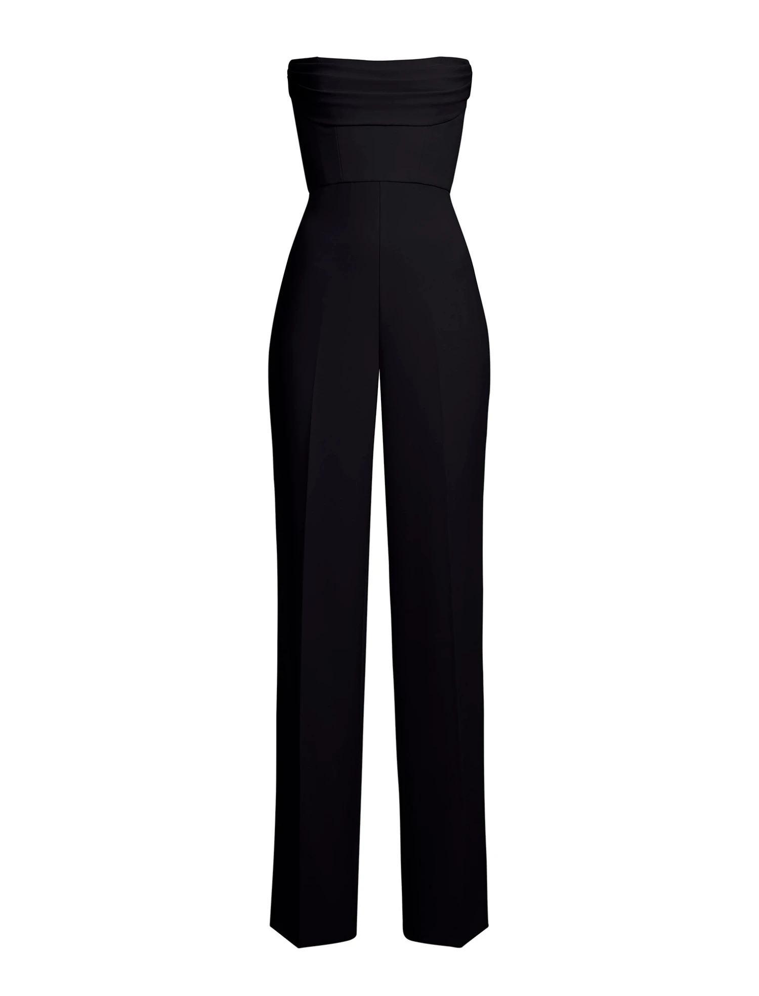 Strapless wide-leg jumpsuit crafted from smooth stretch fabric for a sleek, sculpted fit.