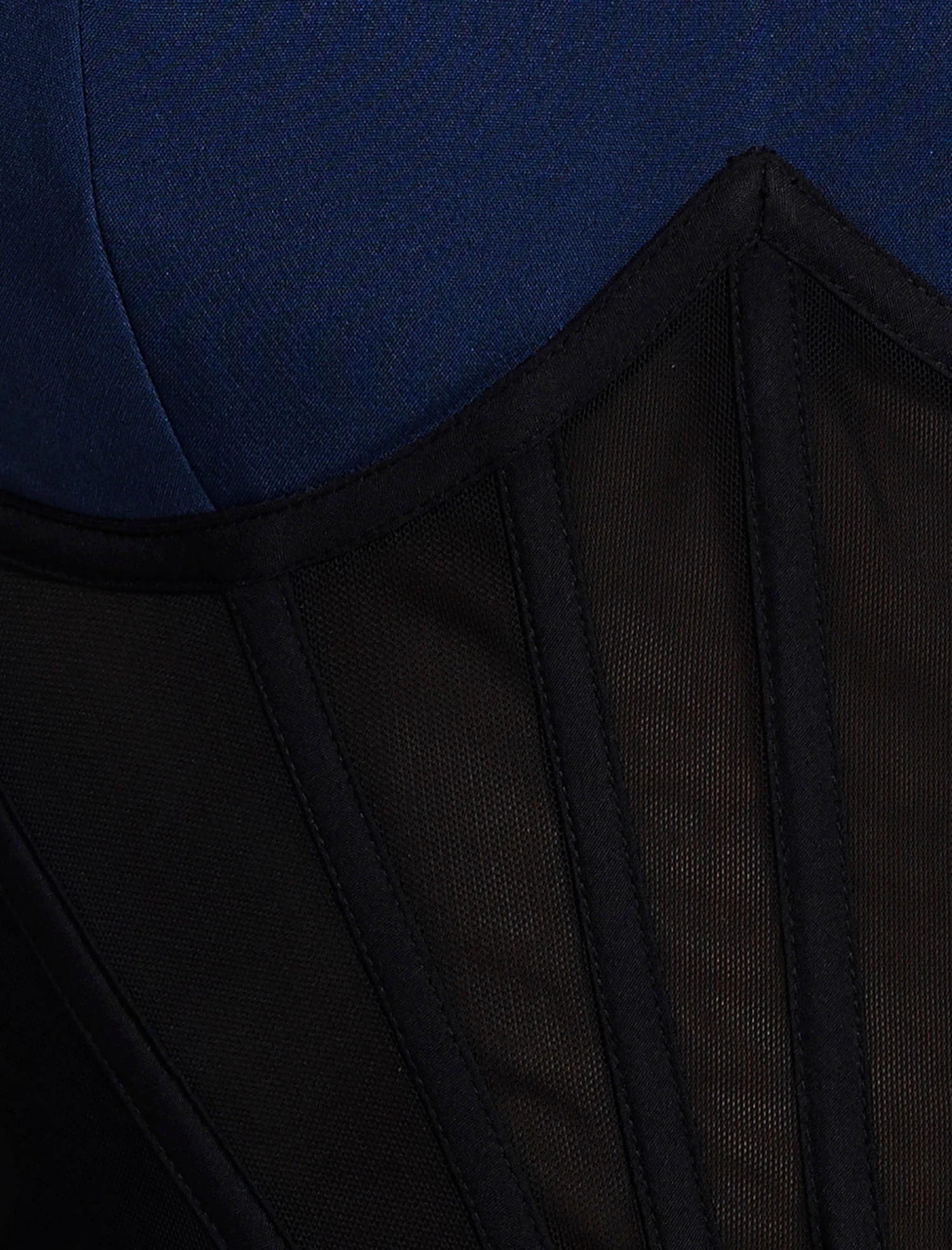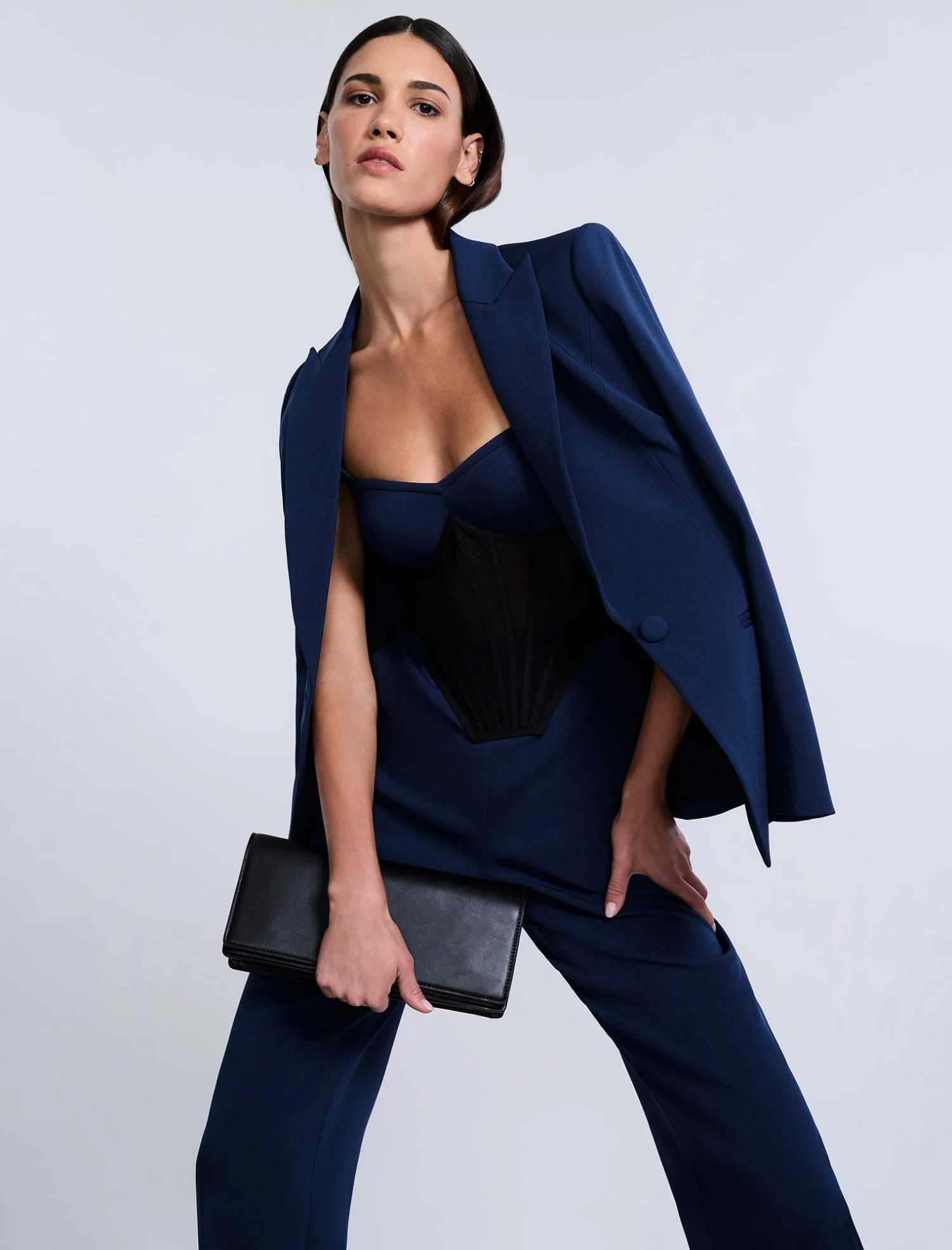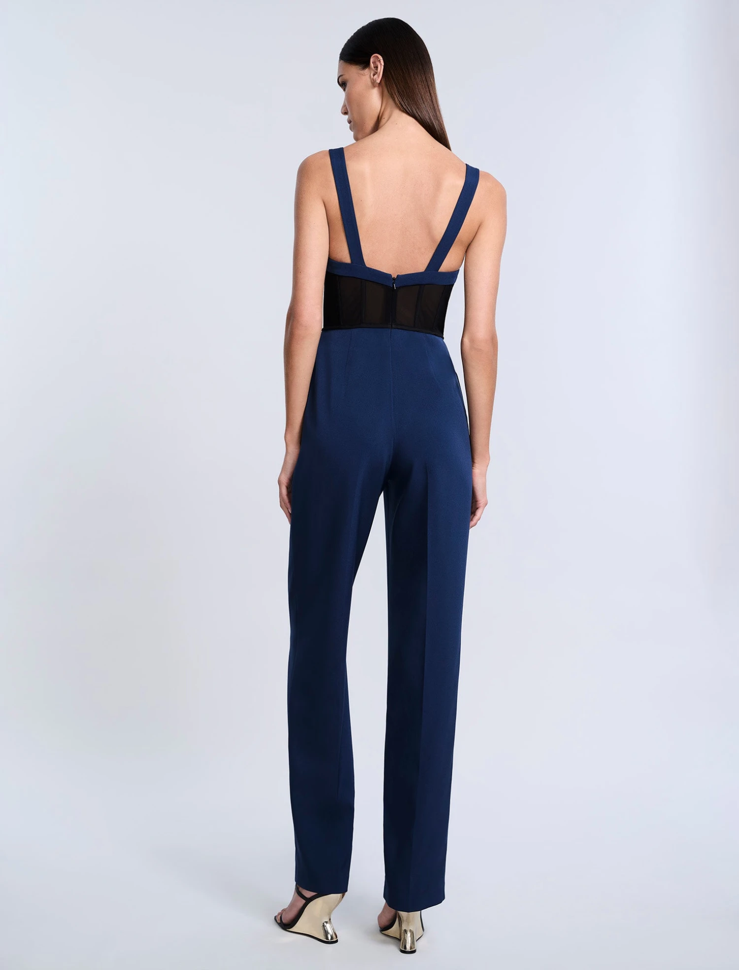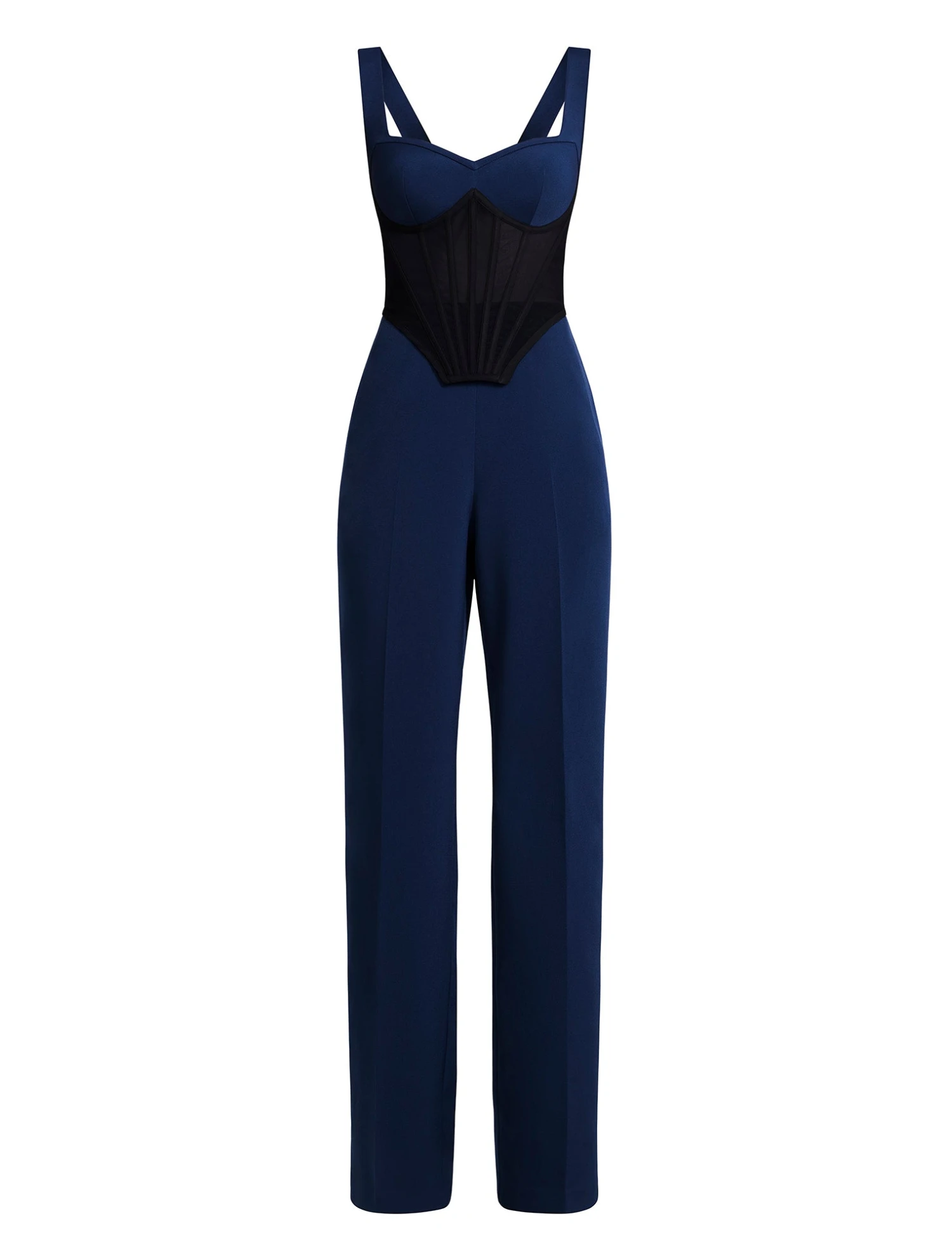 Fitted bustier jumpsuit with a sculpted sweetheart neckline and contrast mesh corset panel. Features wide straps, a tailored straight-leg silhouette, and back zip closure—part femme fatale, part boss energy.