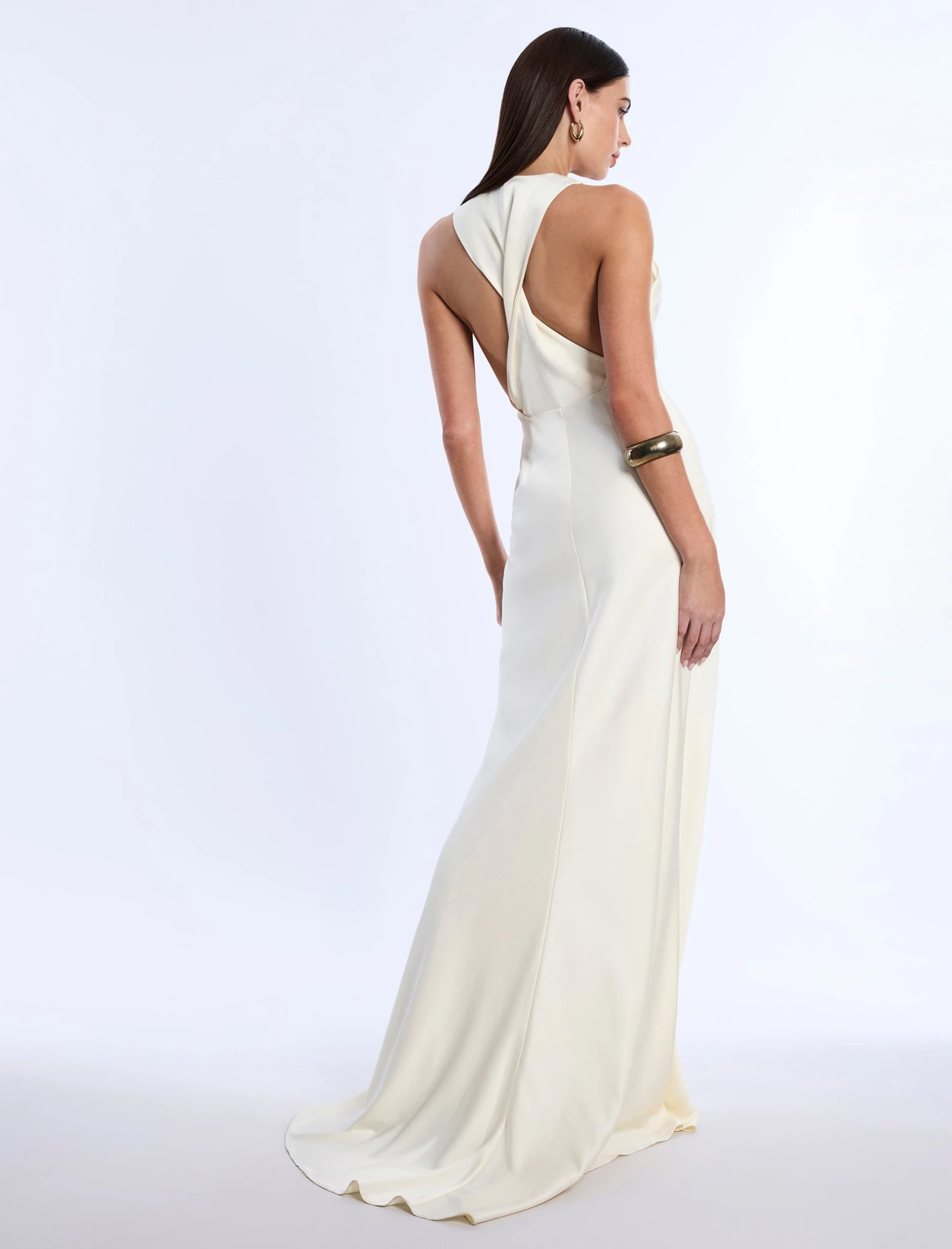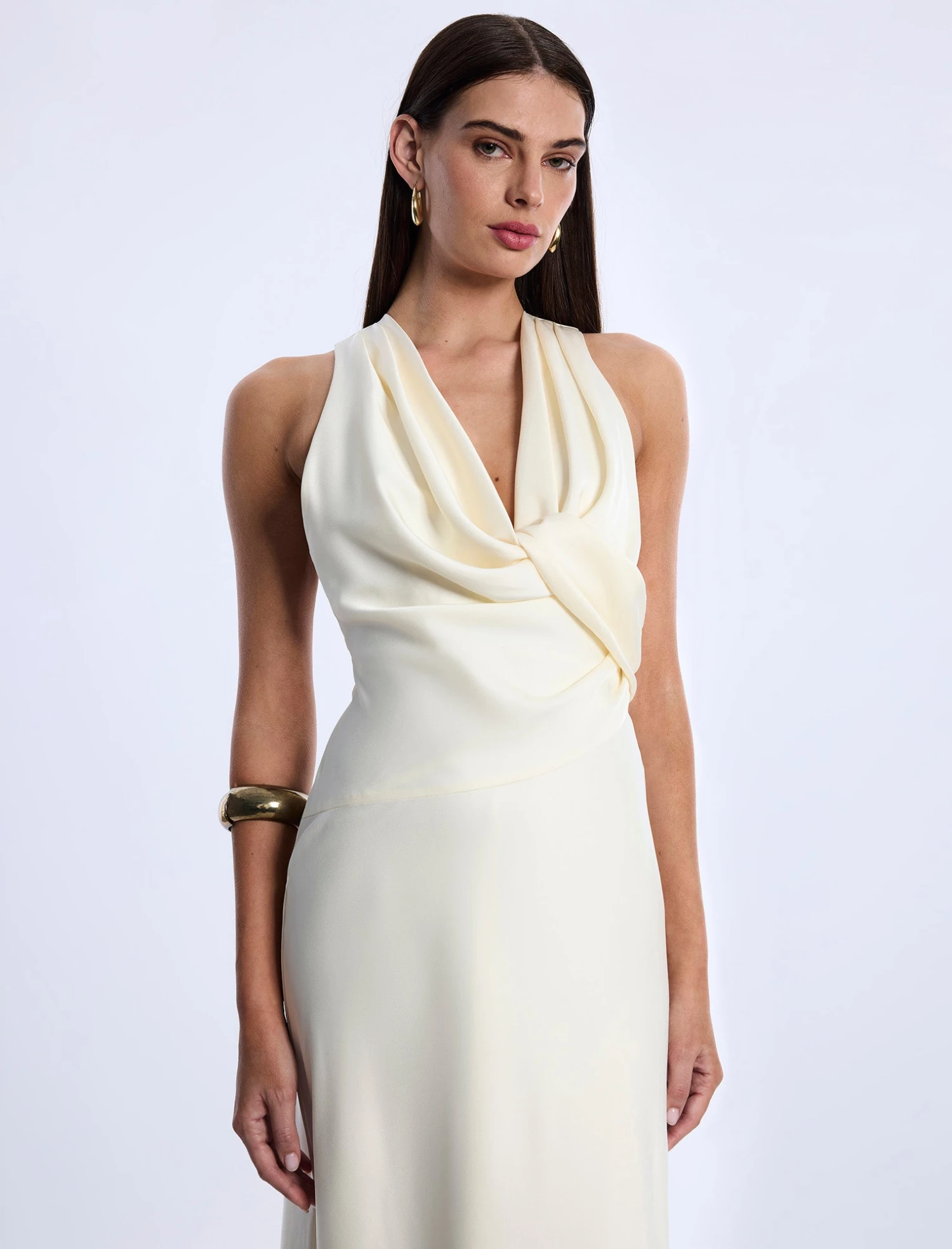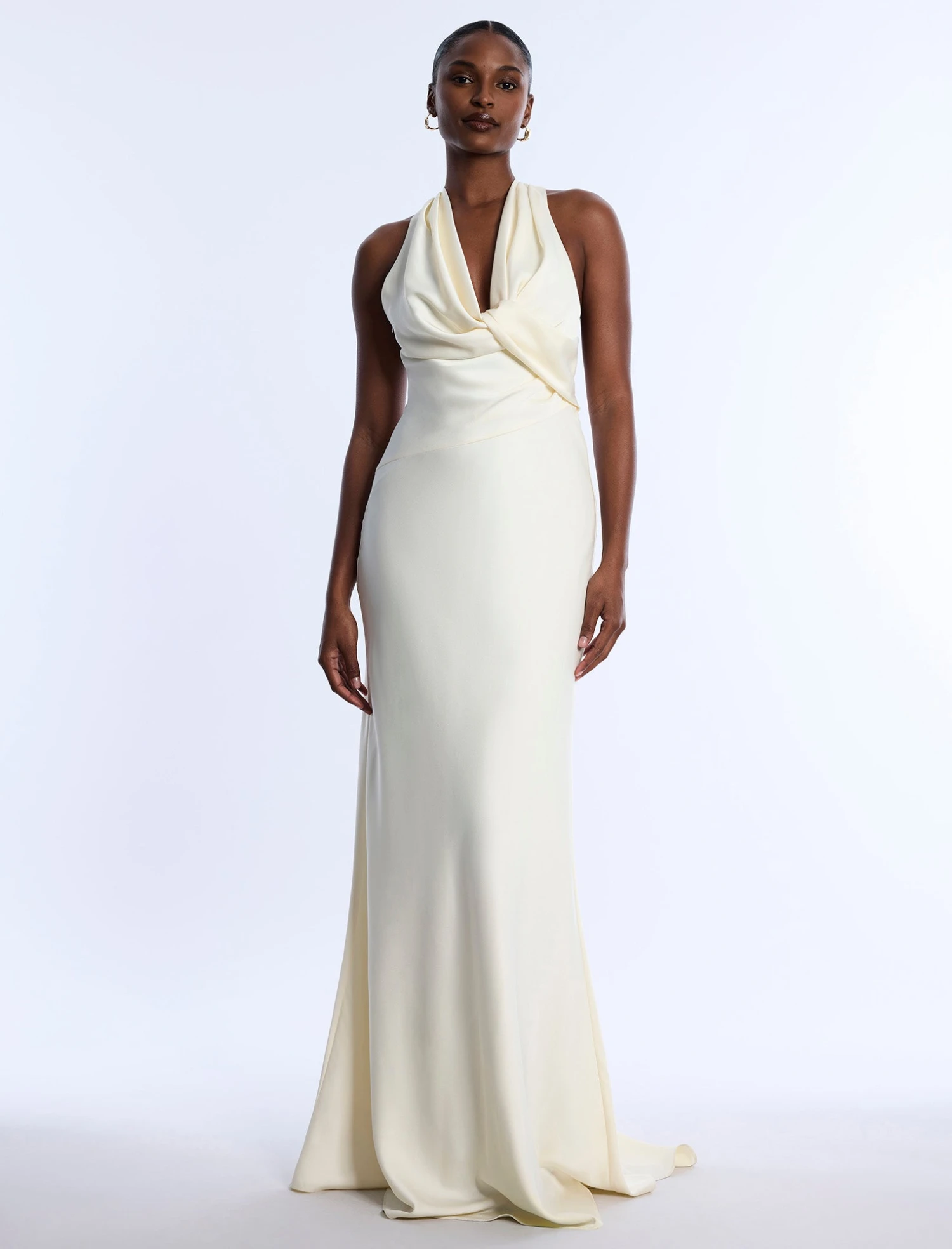 Elegant evening gown crafted from luxurious satin in a soft jasmine hue. Topped with a draped halter neckline and twist-front detail. Done in a floor-length silhouette with a striking open back. Finished with a concealed back zipper closure.