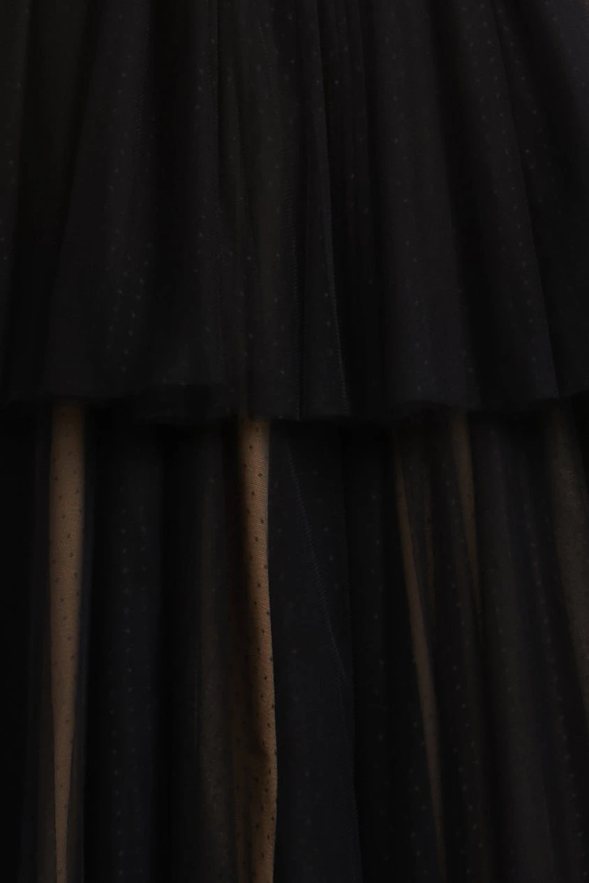 Sheer dotted tulle one-shoulder gown with a sculpted bodice and tiered skirt. Framed with velvet piping and finished with a soft drape that wraps across the bust. A standout for gala season, black tie affairs, or winter weddings.