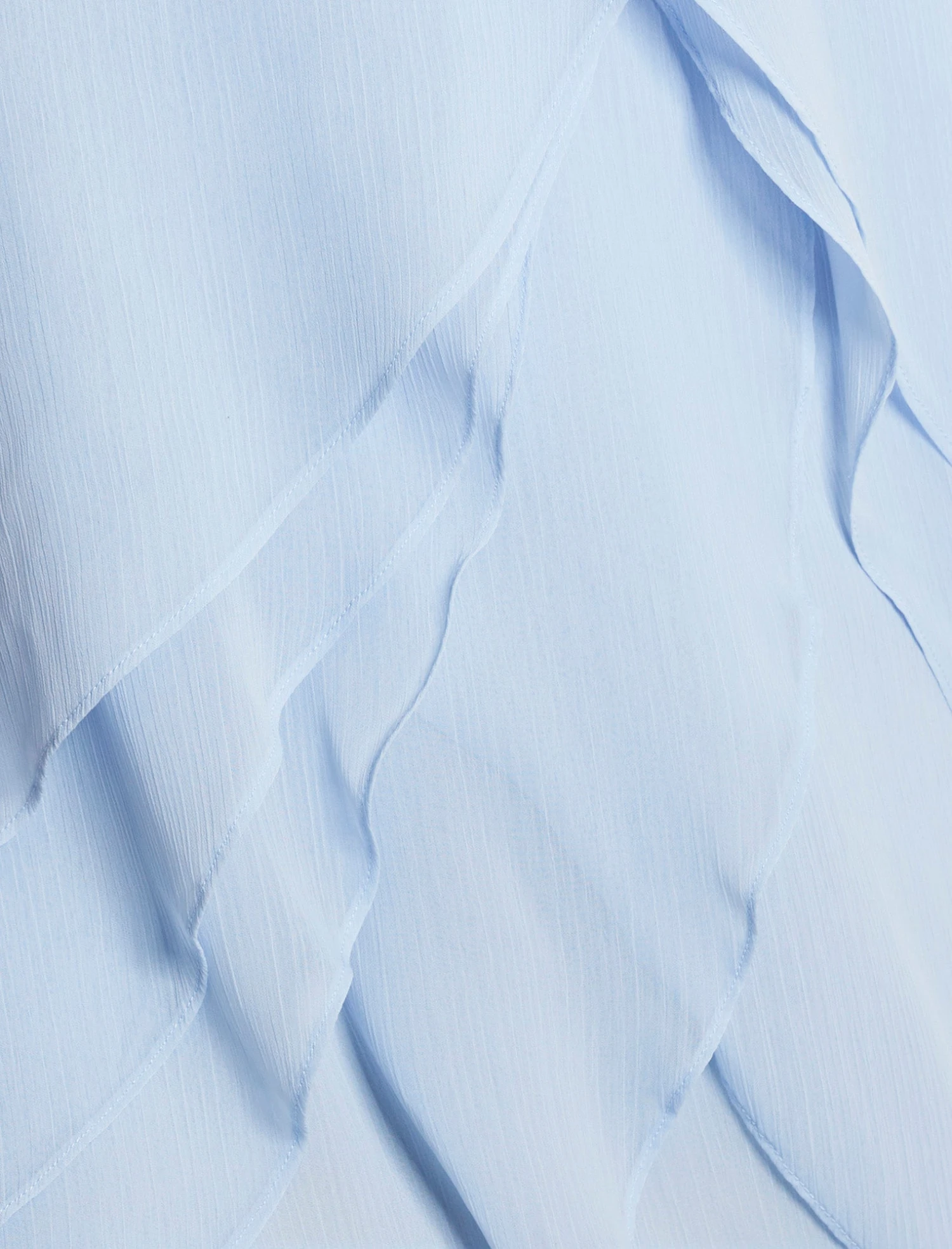 Asymmetric high-low chiffon dress in a soft cloud blue, designed with cascading ruffles that flow with every step. Features subtle sequin embellishment along the neckline and a fluid one-shoulder silhouette. A dreamy pick for rehearsal dinners, summer soirées, or rooftop celebrations.