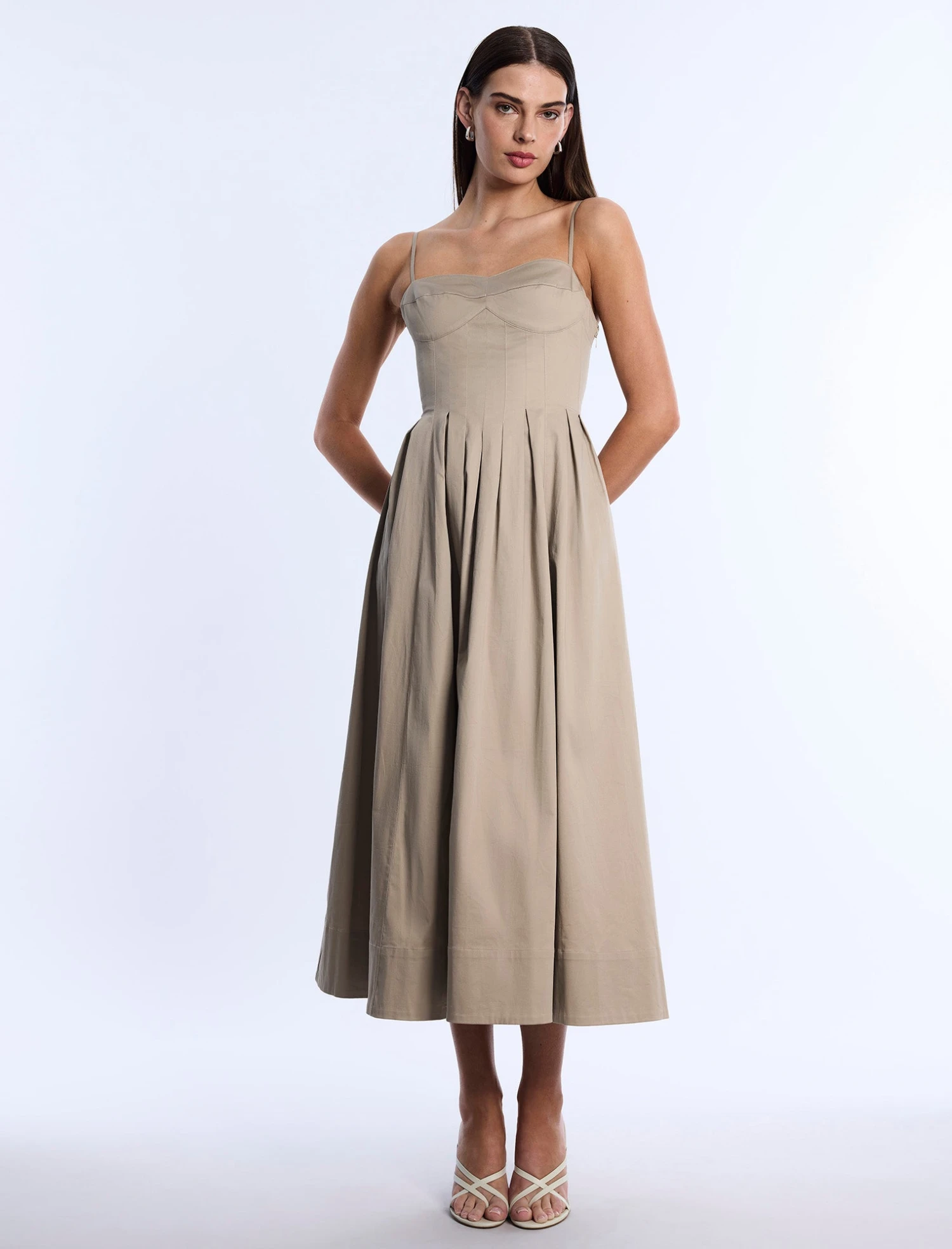 Romantic midi dress crafted from crisp cotton poplin with a structured, corset-style bodice. Topped with a sweetheart neckline and delicate adjustable straps. Designed with a pleated A-line skirt that falls to a mid-calf length. Finished with boning detail and a back zipper closure.