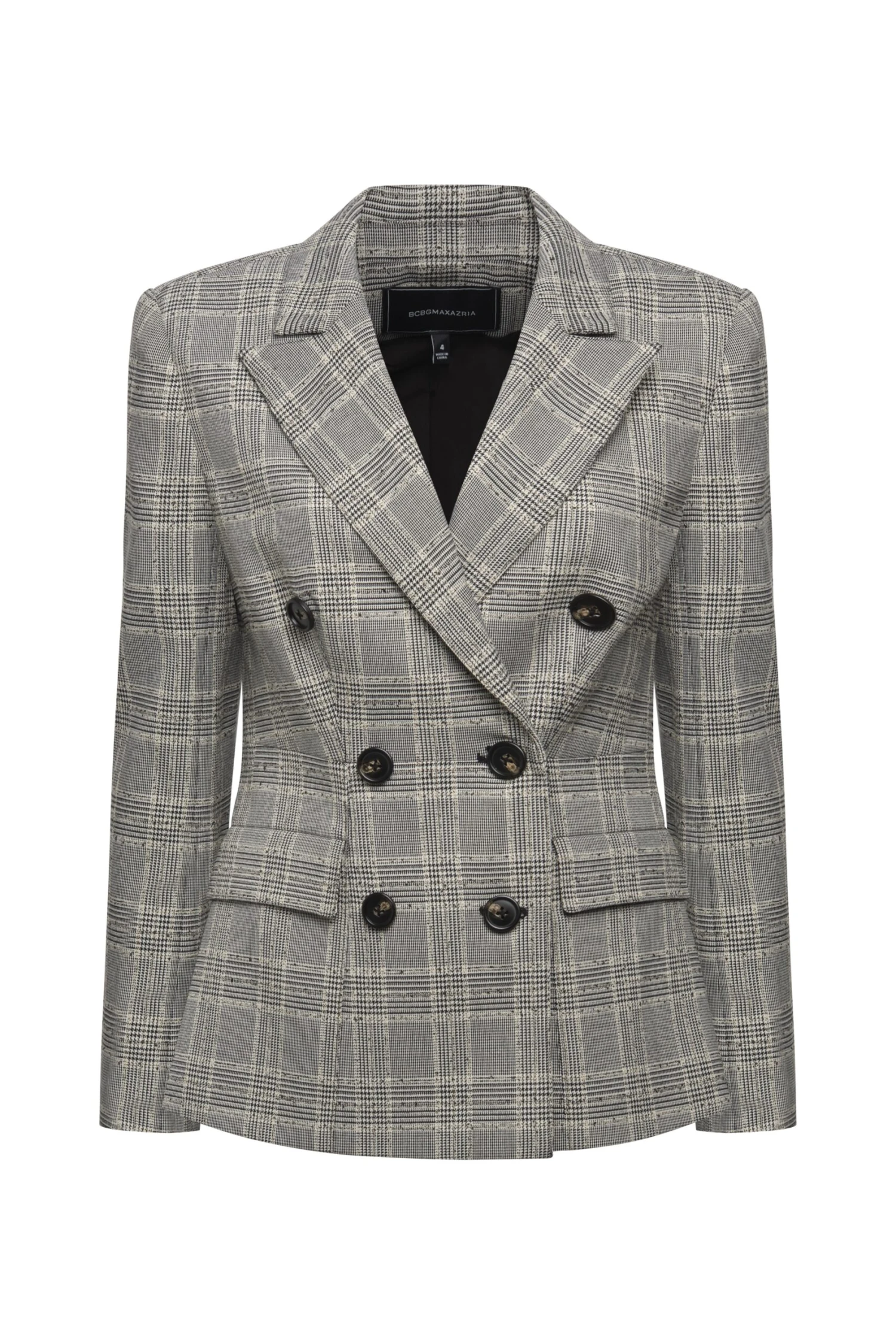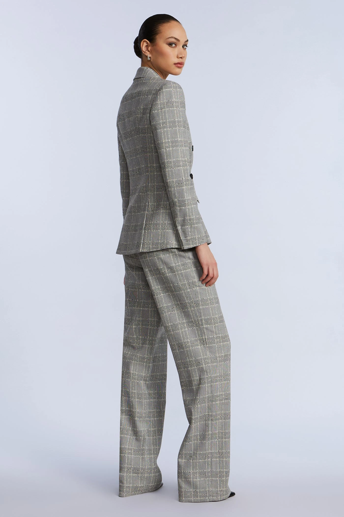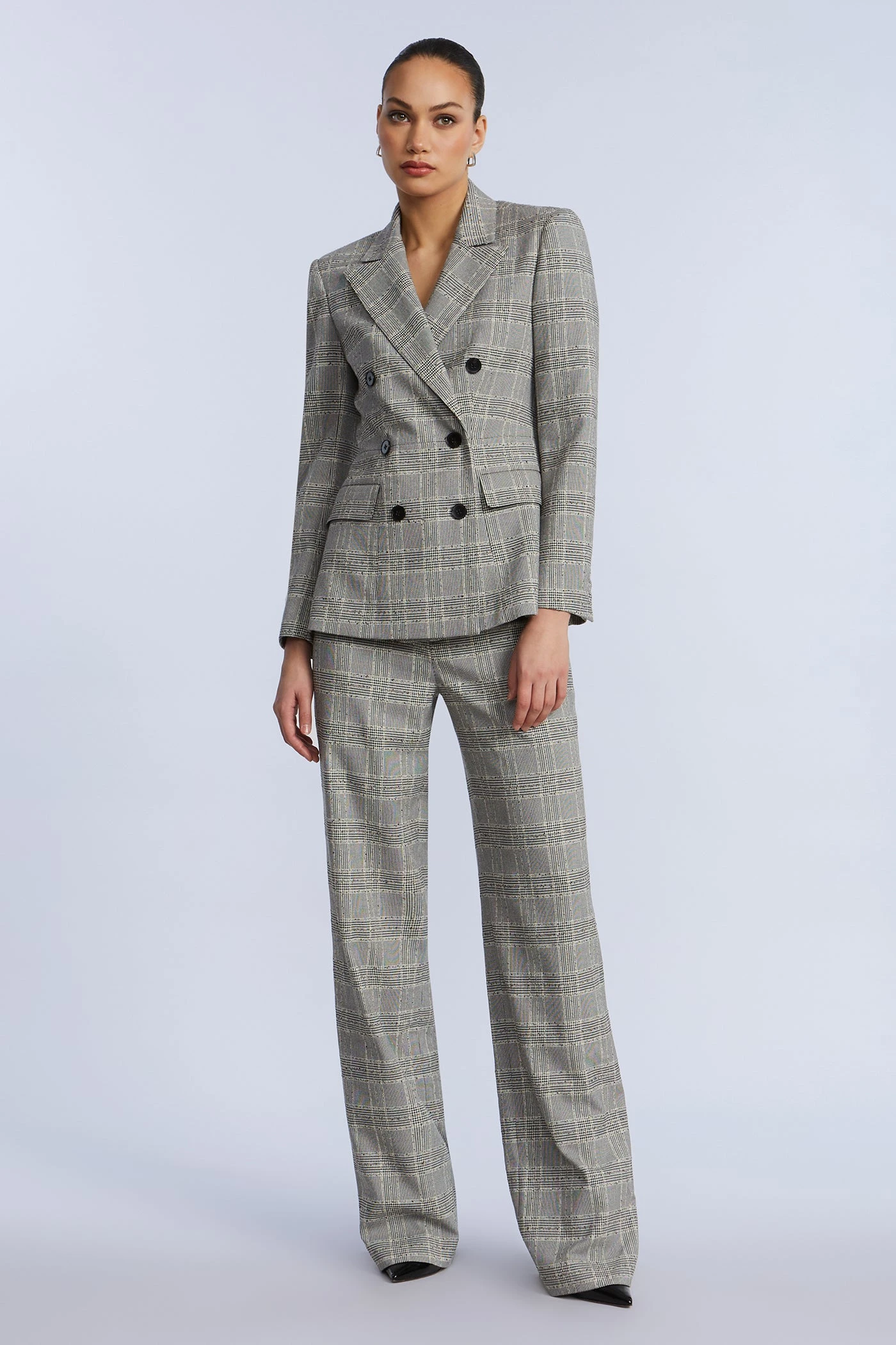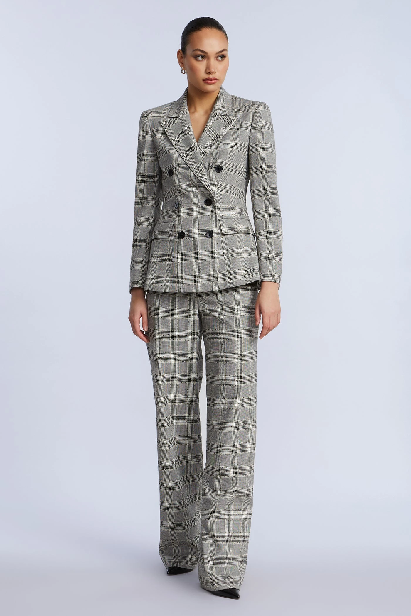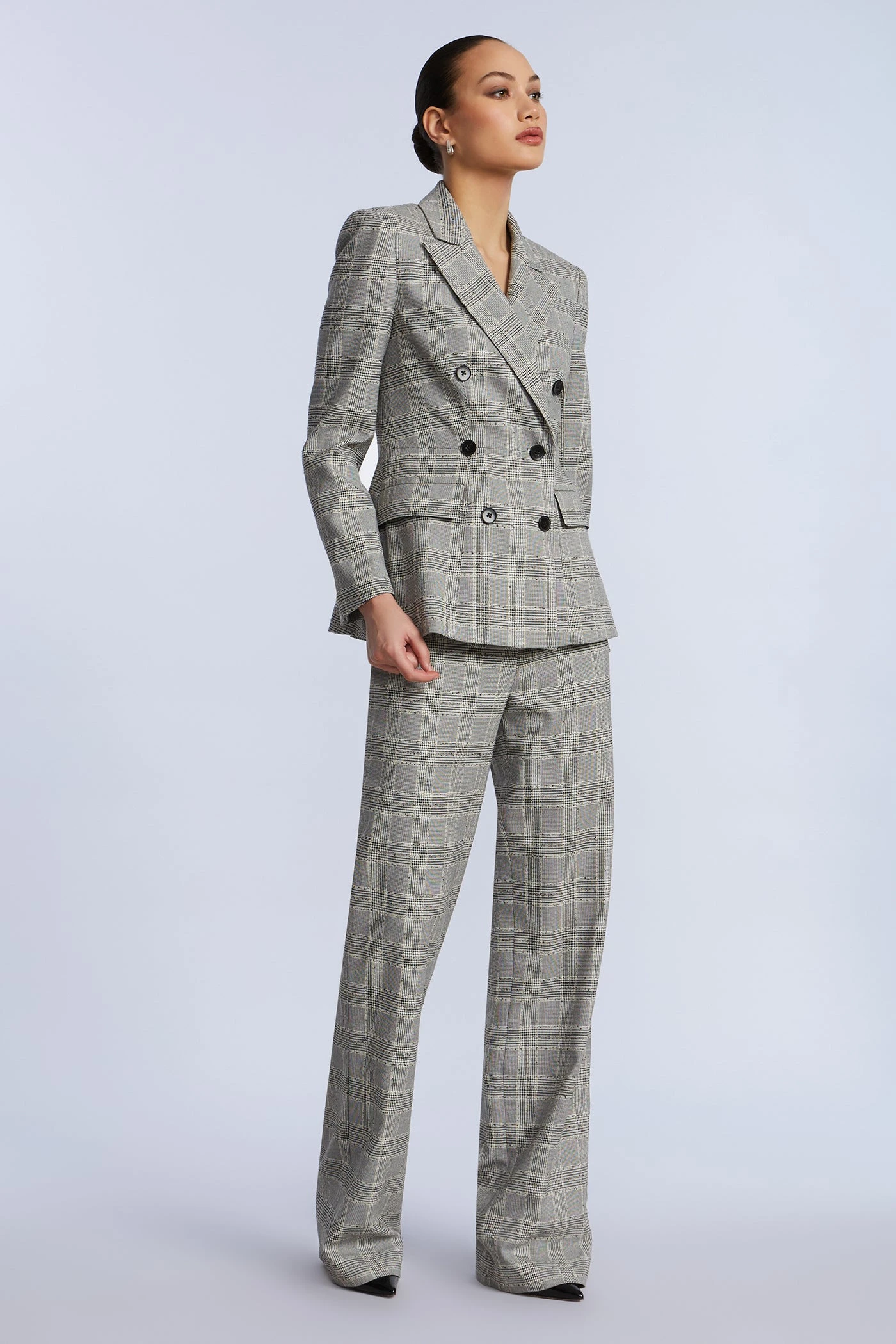 Tailored plaid blazer with a sharply structured shoulder and peak lapel. Cut in a polished double-breasted silhouette with classic black summarys and flap pockets. Wears well with the matching trouser or mini—your call.