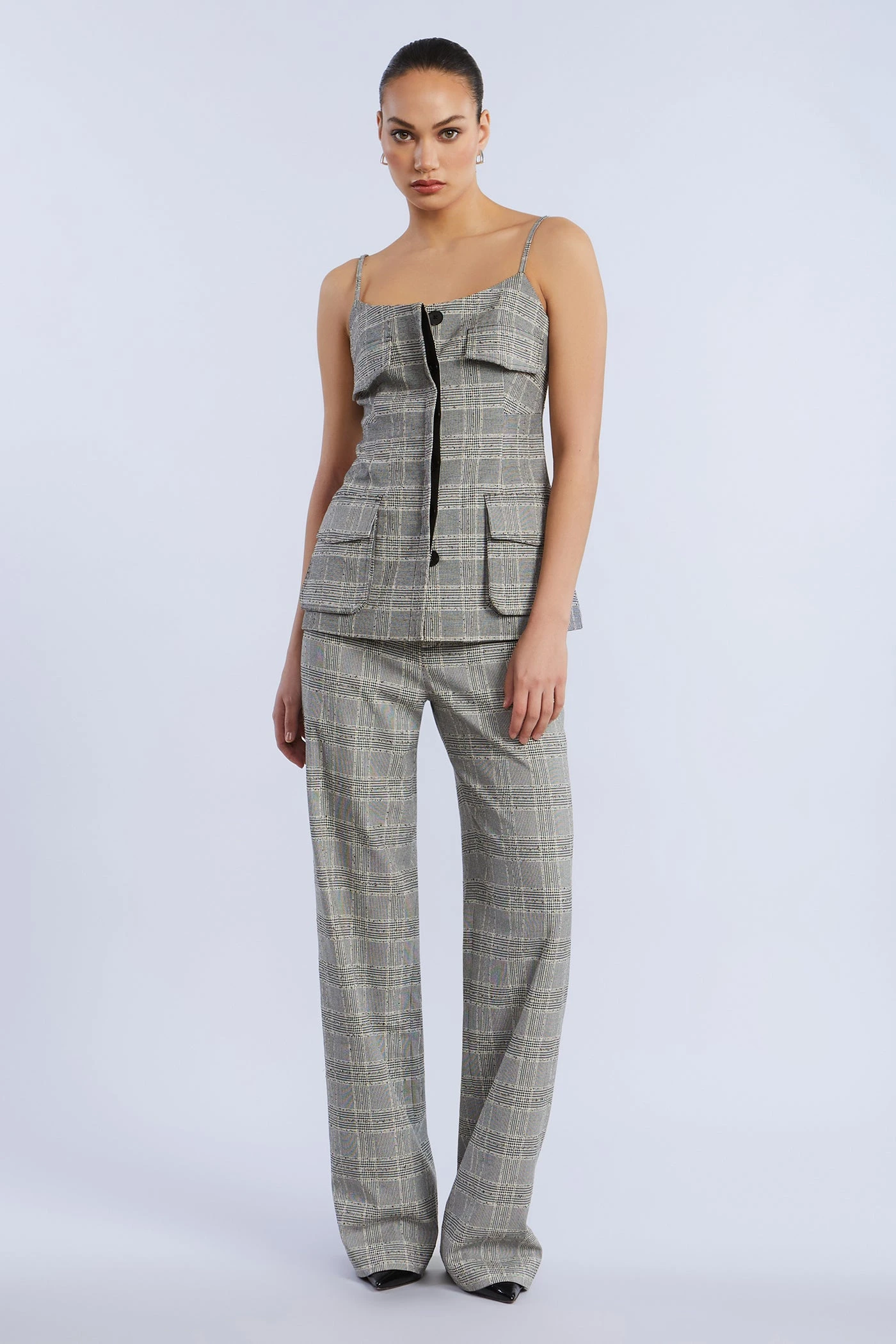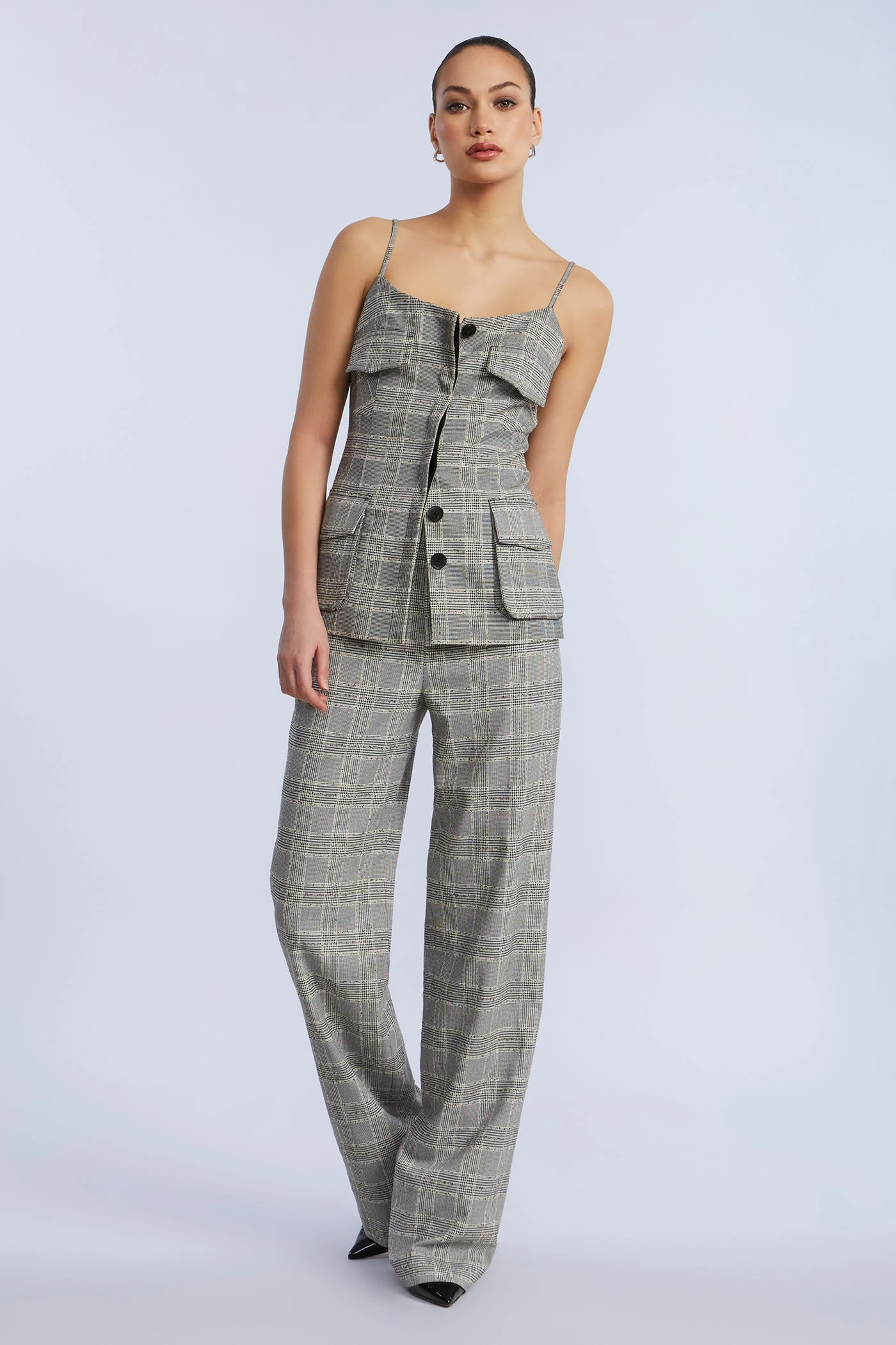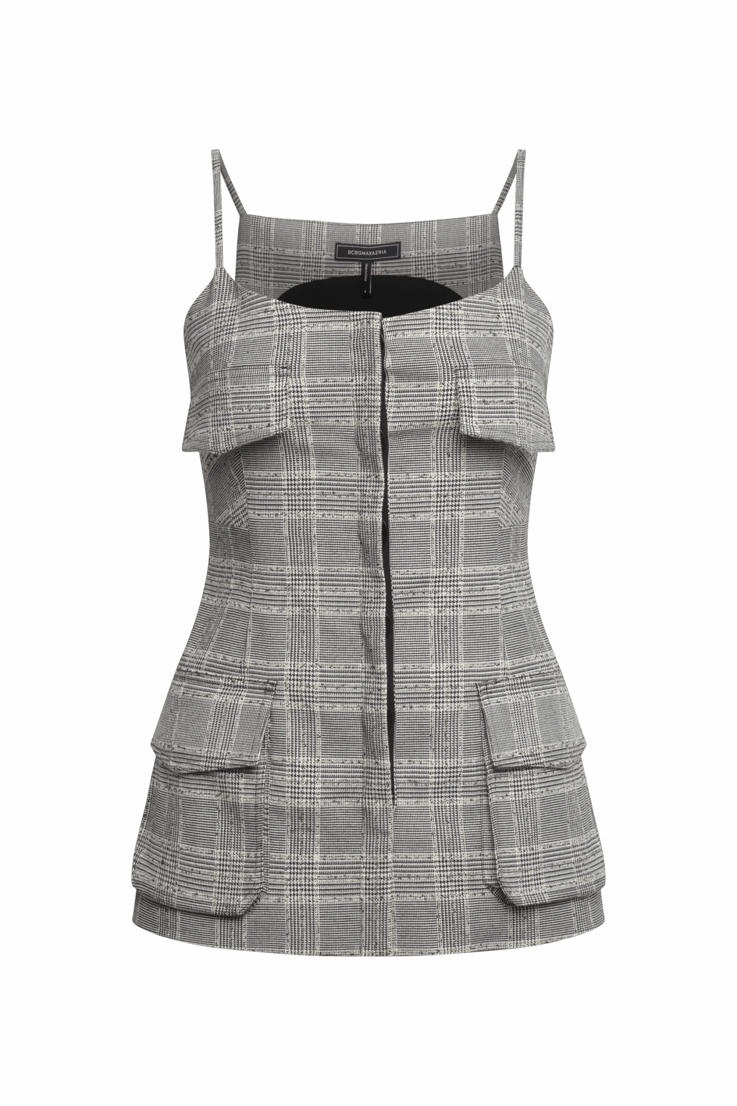Textured plaid bustier top with oversized flap pockets and petite shoulder straps. Tailored through the bodice with a center-front placket and subtle stretch. Pair it with the matching pant or break it up with denim.