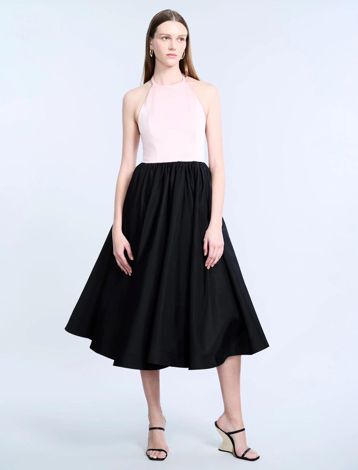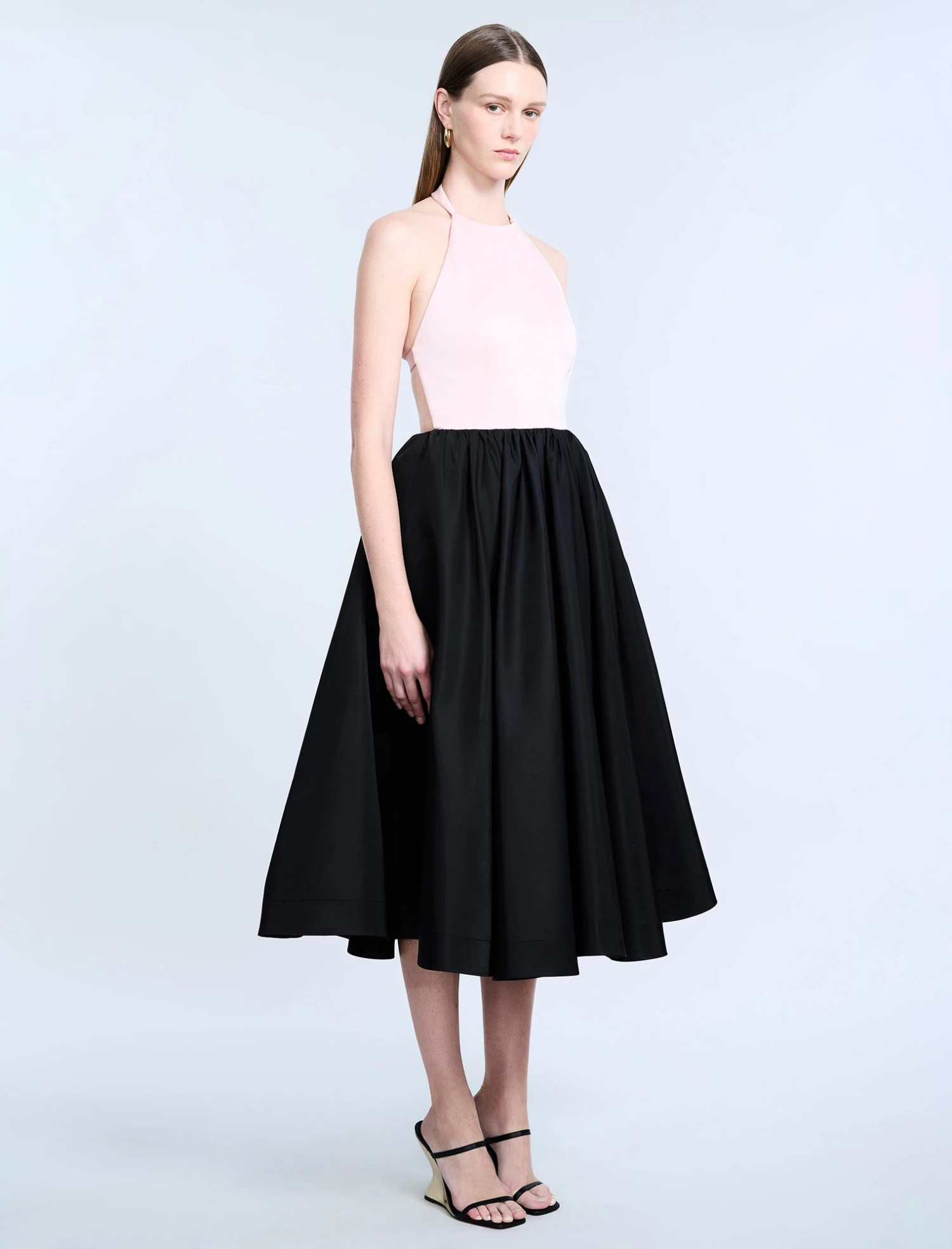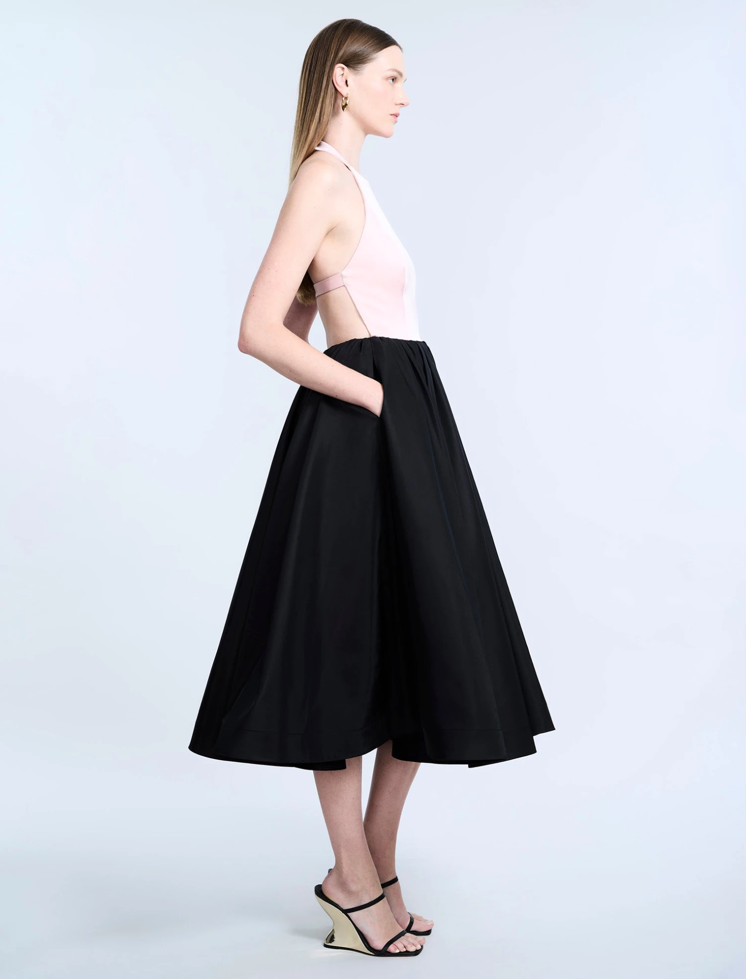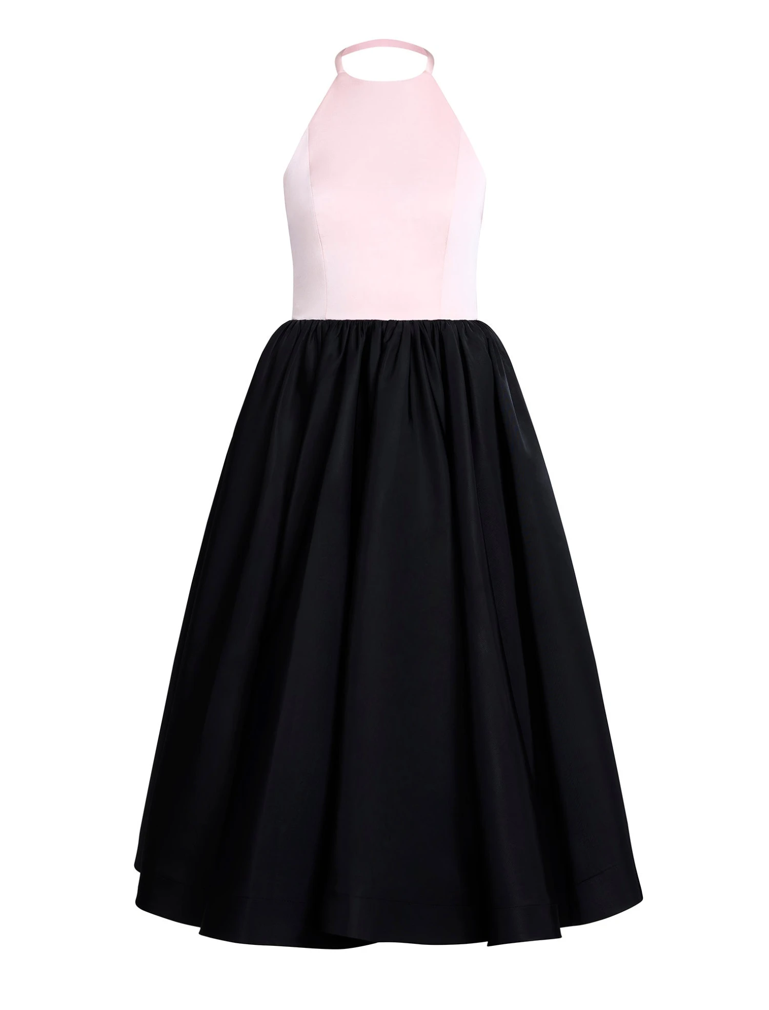 Statement halter dress with modern contrast appeal. This bold midi dress features a structured halter bodice in soft blush satin contrasted by a voluminous black taffeta skirt. The open back and gathered waistline add drama, while side pockets keep it grounded in functionality. A standout option for weddings, summer soirées, and gallery nights.