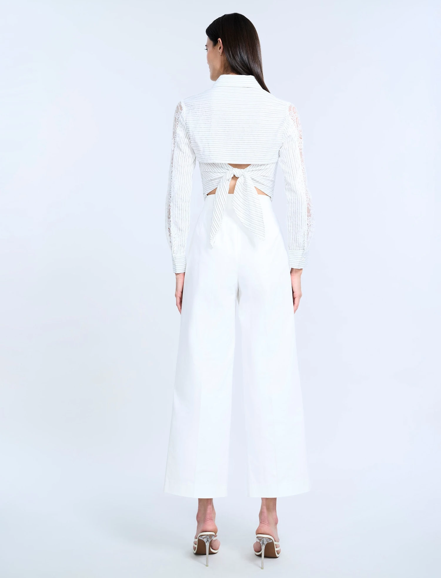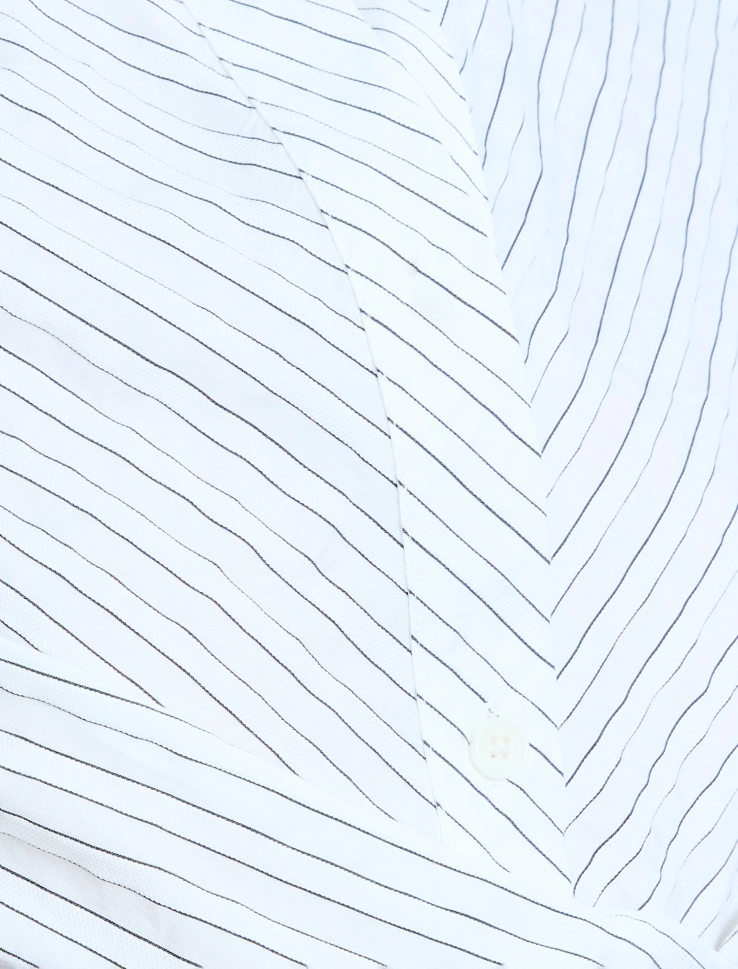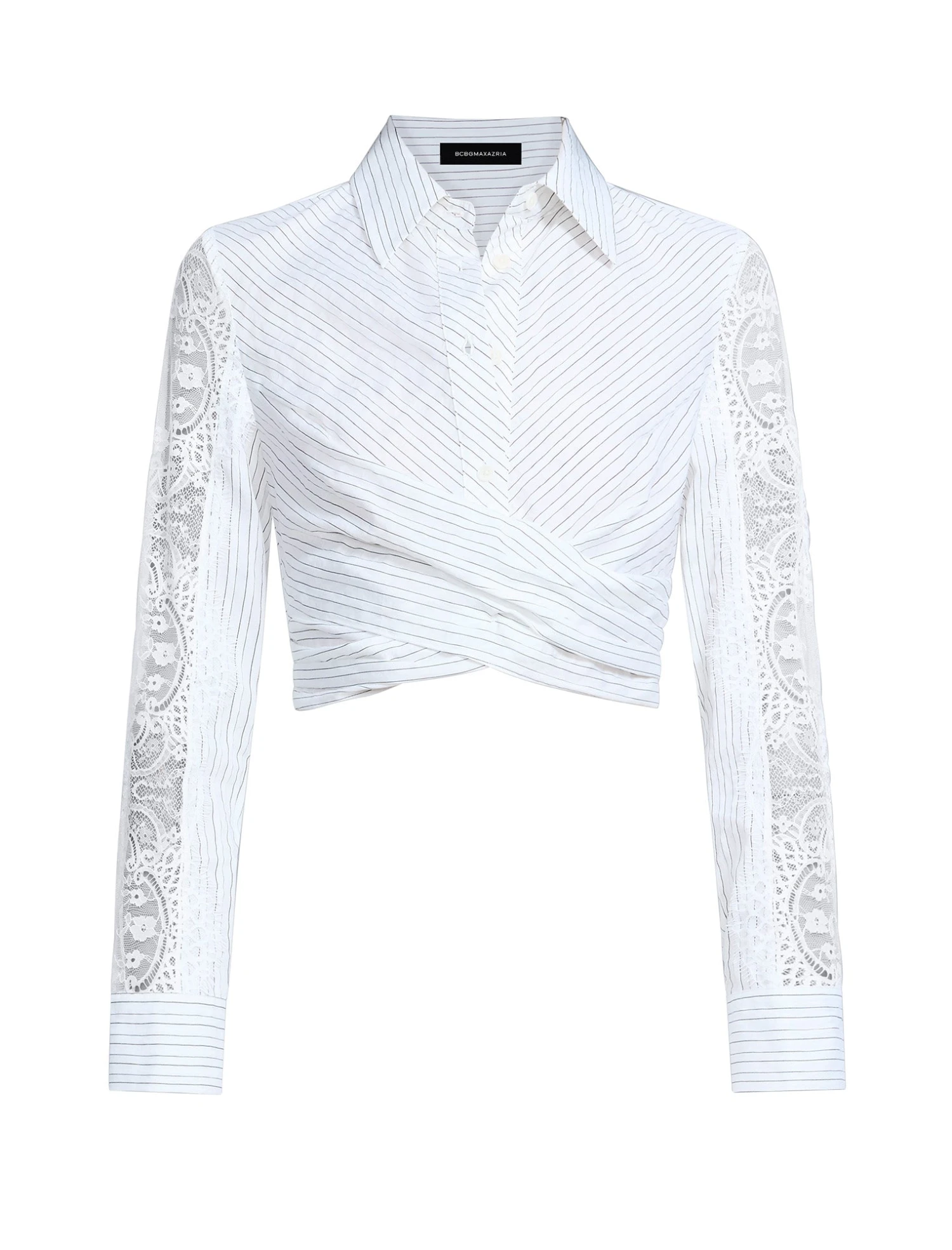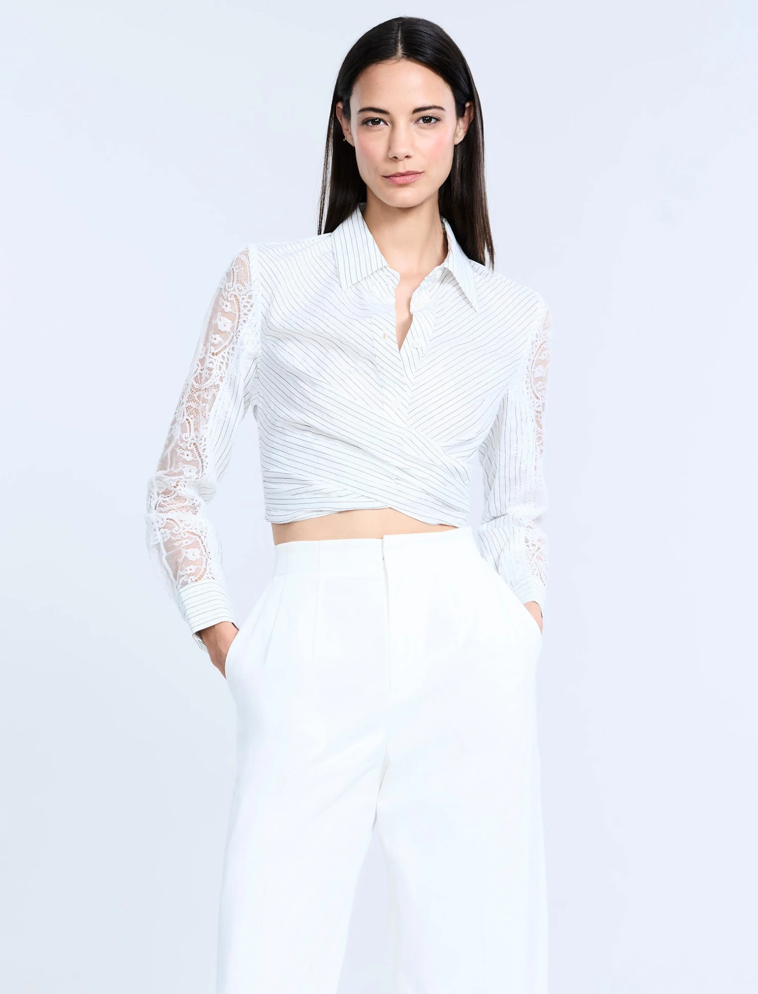 Cropped poplin shirt crafted from lightweight striped shirting with sheer embroidered lace sleeves. Designed with a crossover front and waist-defining wrap that ties at the back. A polished statement layer that balances structure and romance.