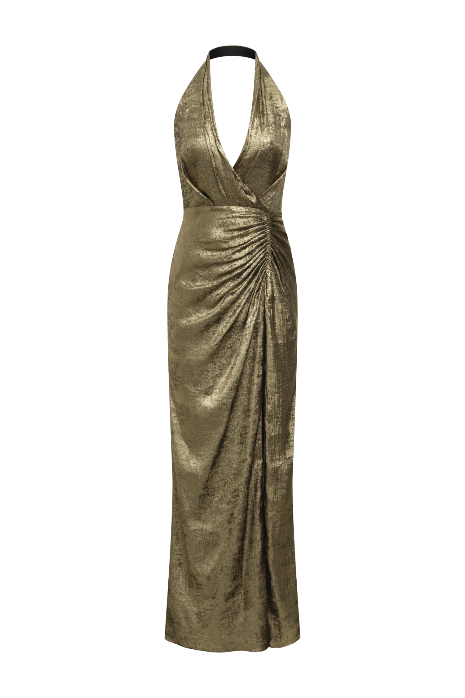 Metallic textured jersey gown with a deep draped neckline and ruched wrap-effect waist. Designed with a high slit and halter straps that cross at the back. Complete with a concealed zipper—perfect for holiday galas and red carpet nights.