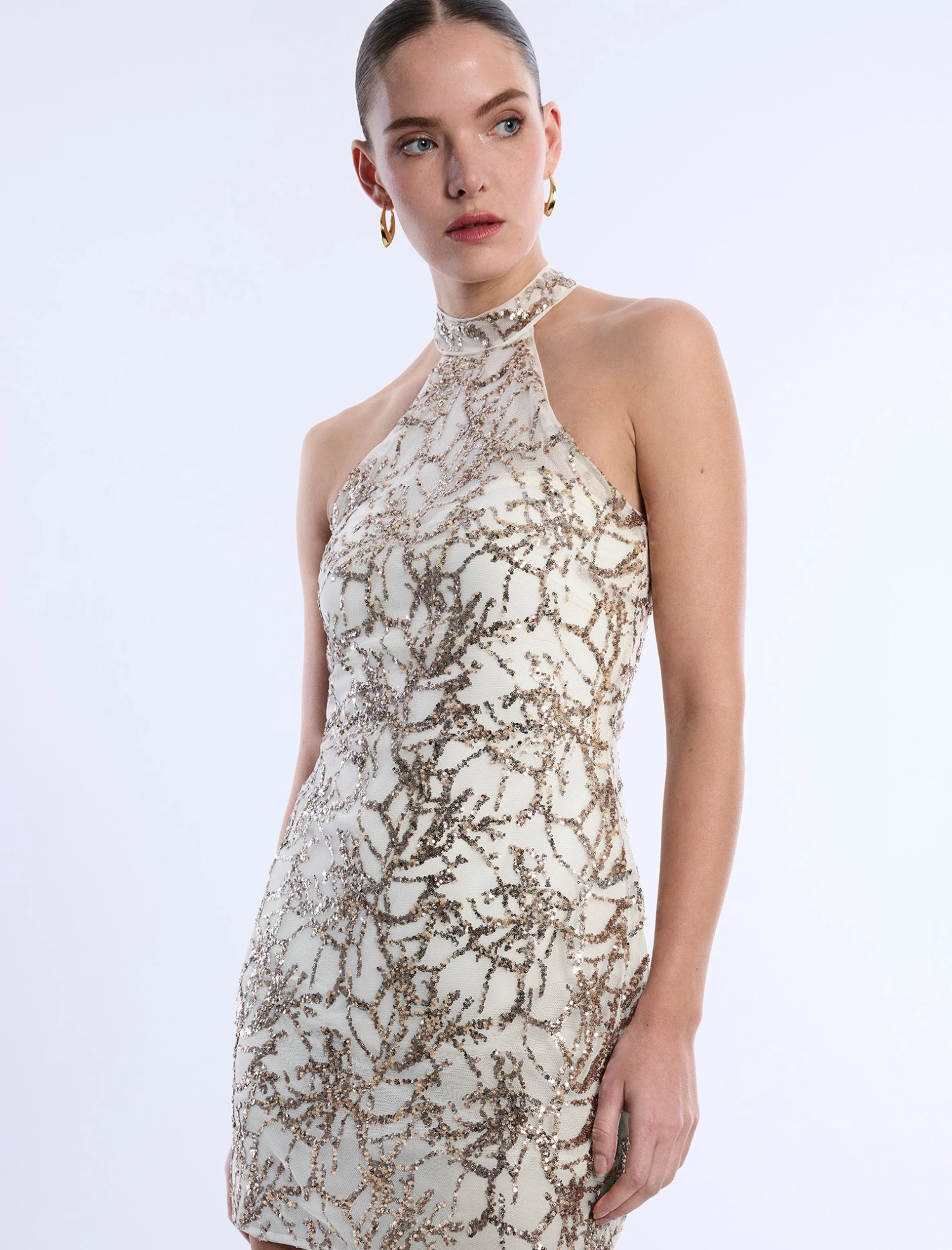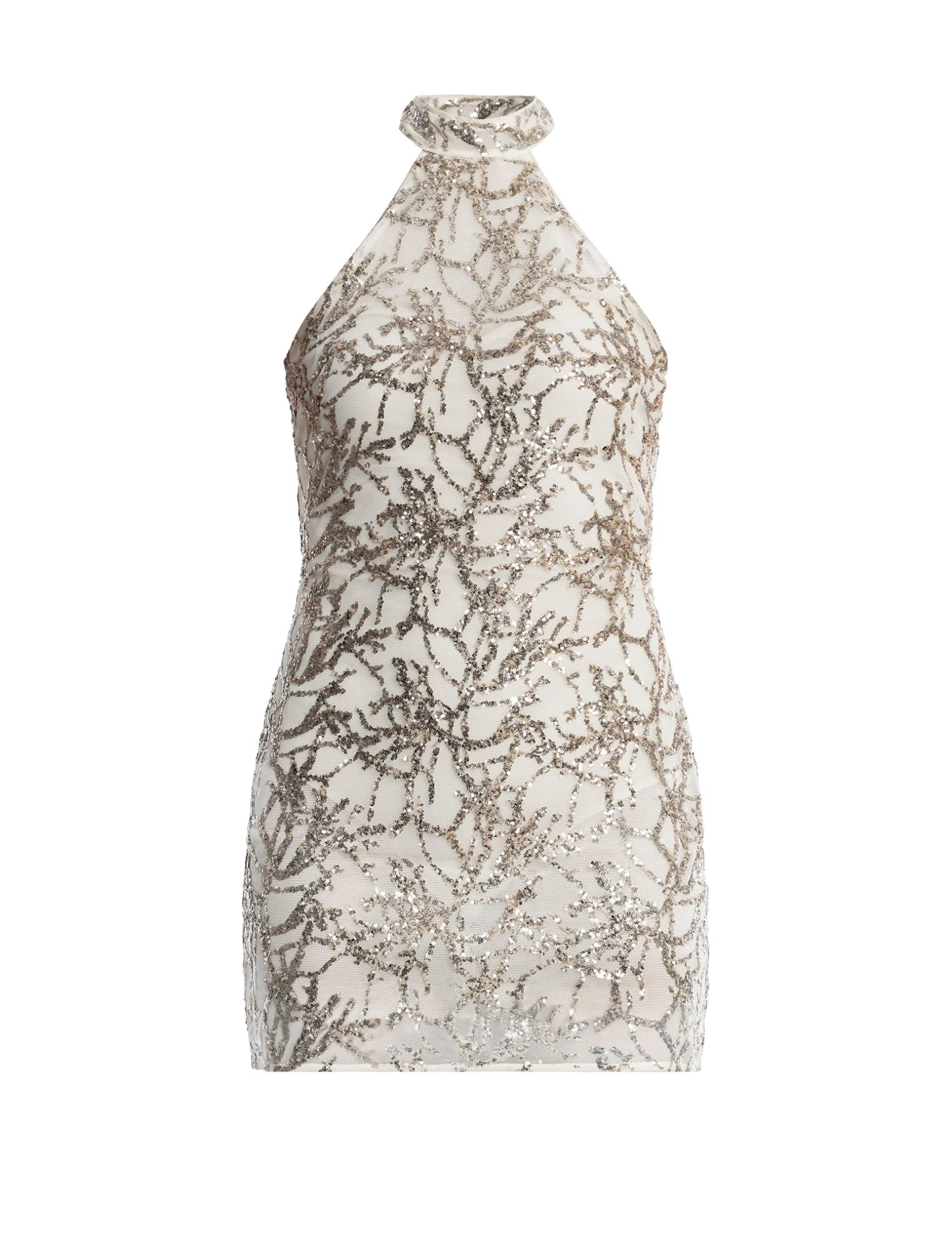 Stunning halter mini dress embellished with shimmering sequins in a nature-inspired pattern. Topped with a high neckline and sheer mesh overlay. Done in a fitted, mini silhouette for a chic, sophisticated look. Finished with a concealed back closure.