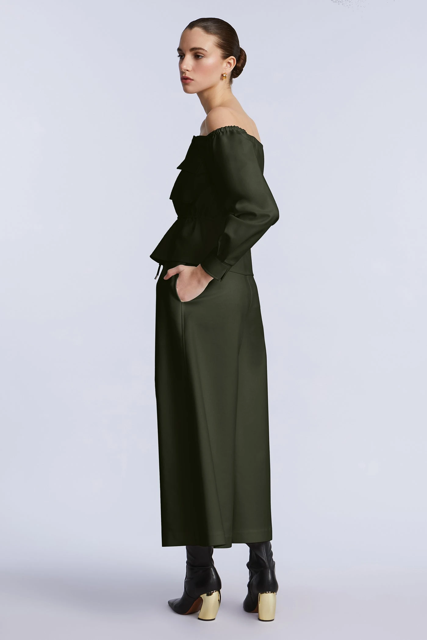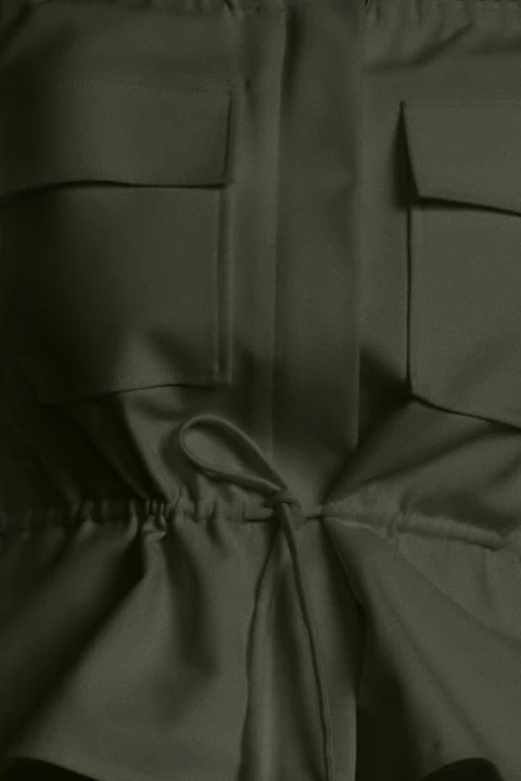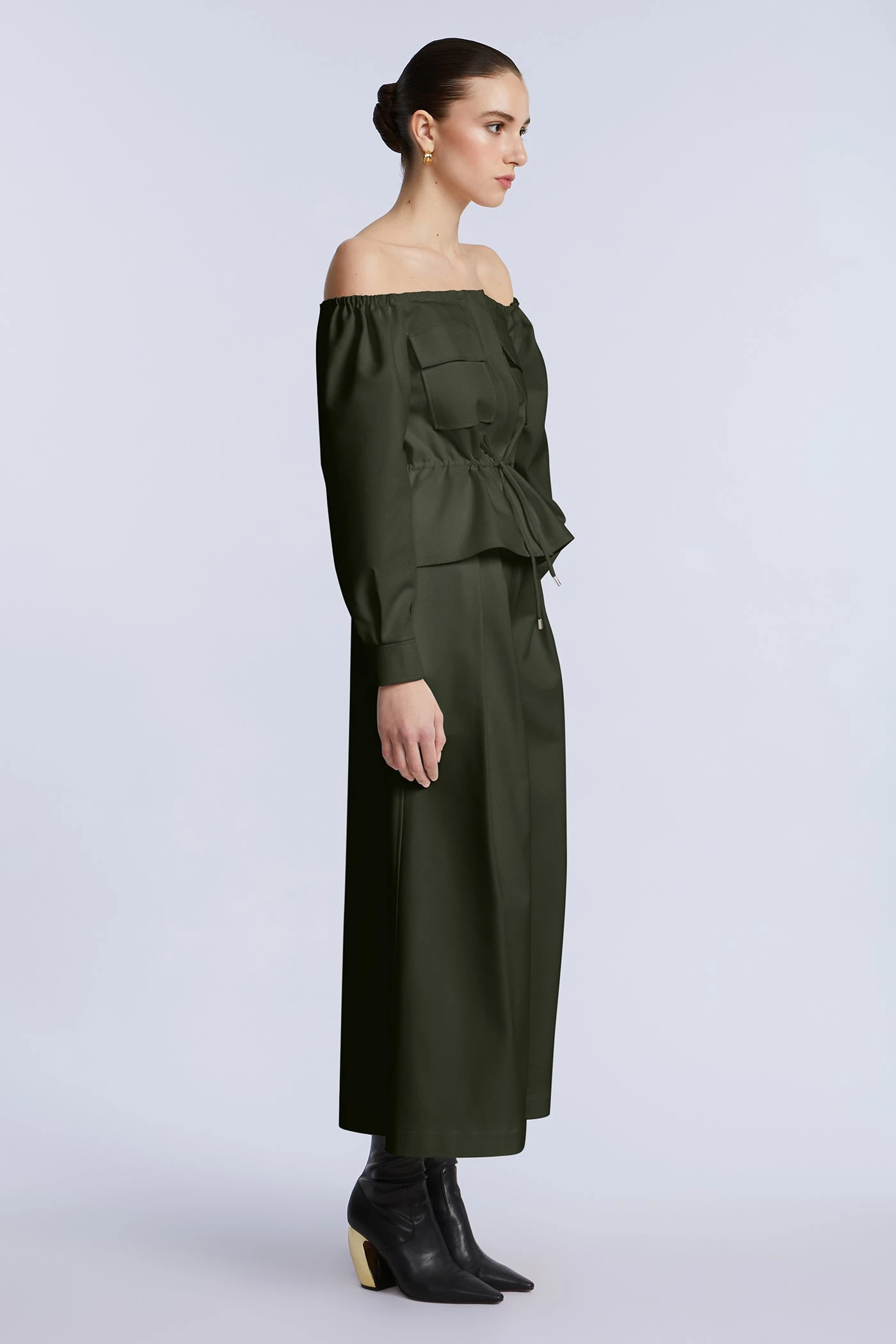 Off-shoulder top cut in cotton sateen with utility patch pockets and a gathered peplum waist. The drawcord cinches the shape while long sleeves finish in tailored cuffs. Secured with a front zip—wear it tucked, tied, or on its own.