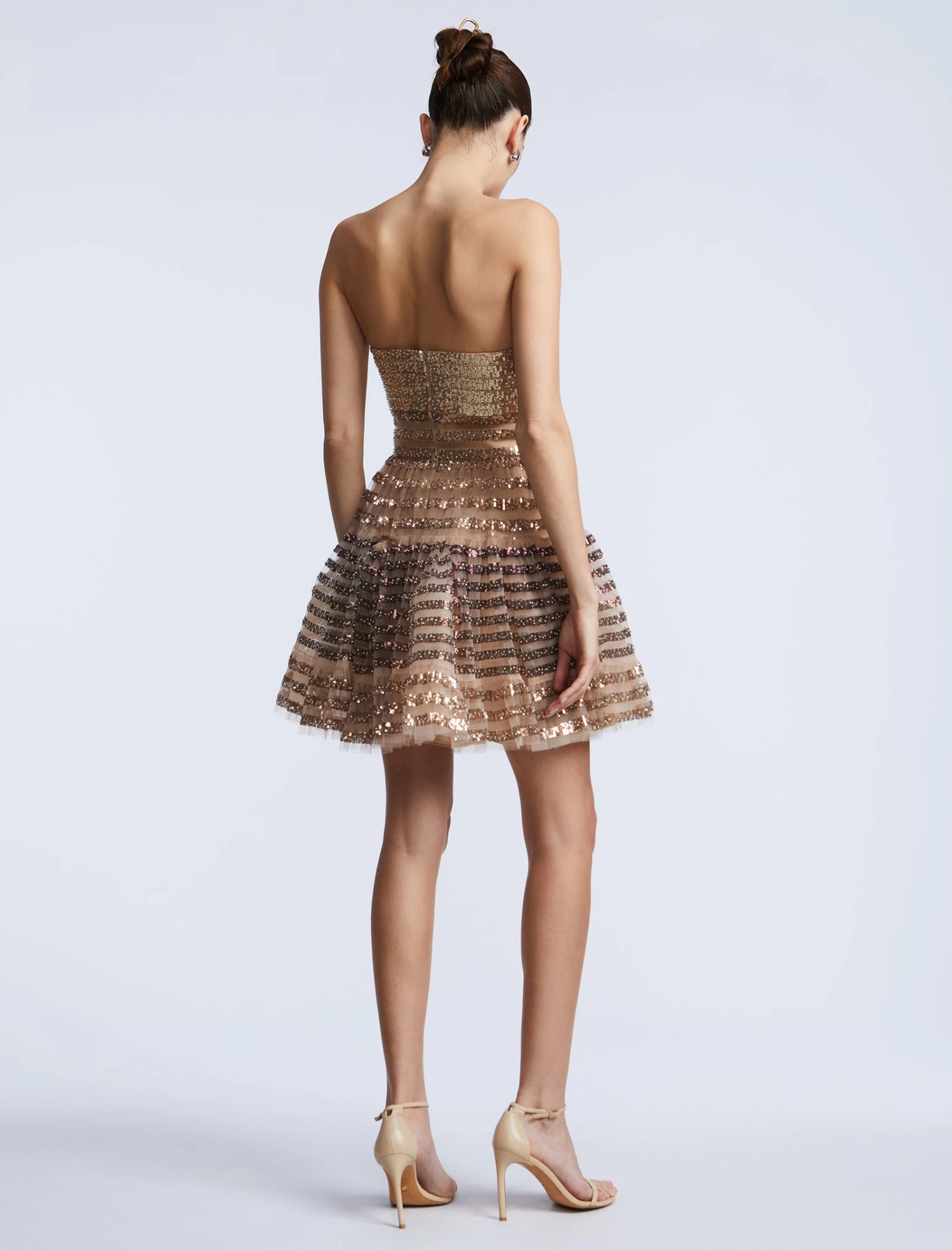 Strapless mini dress adorned with tonal sequins and sheer tulle striping. Designed with a sculpted bustier bodice and voluminous flared skirt for playful movement. A back zipper keeps it polished—perfect for birthday dinners and dance floor moments.