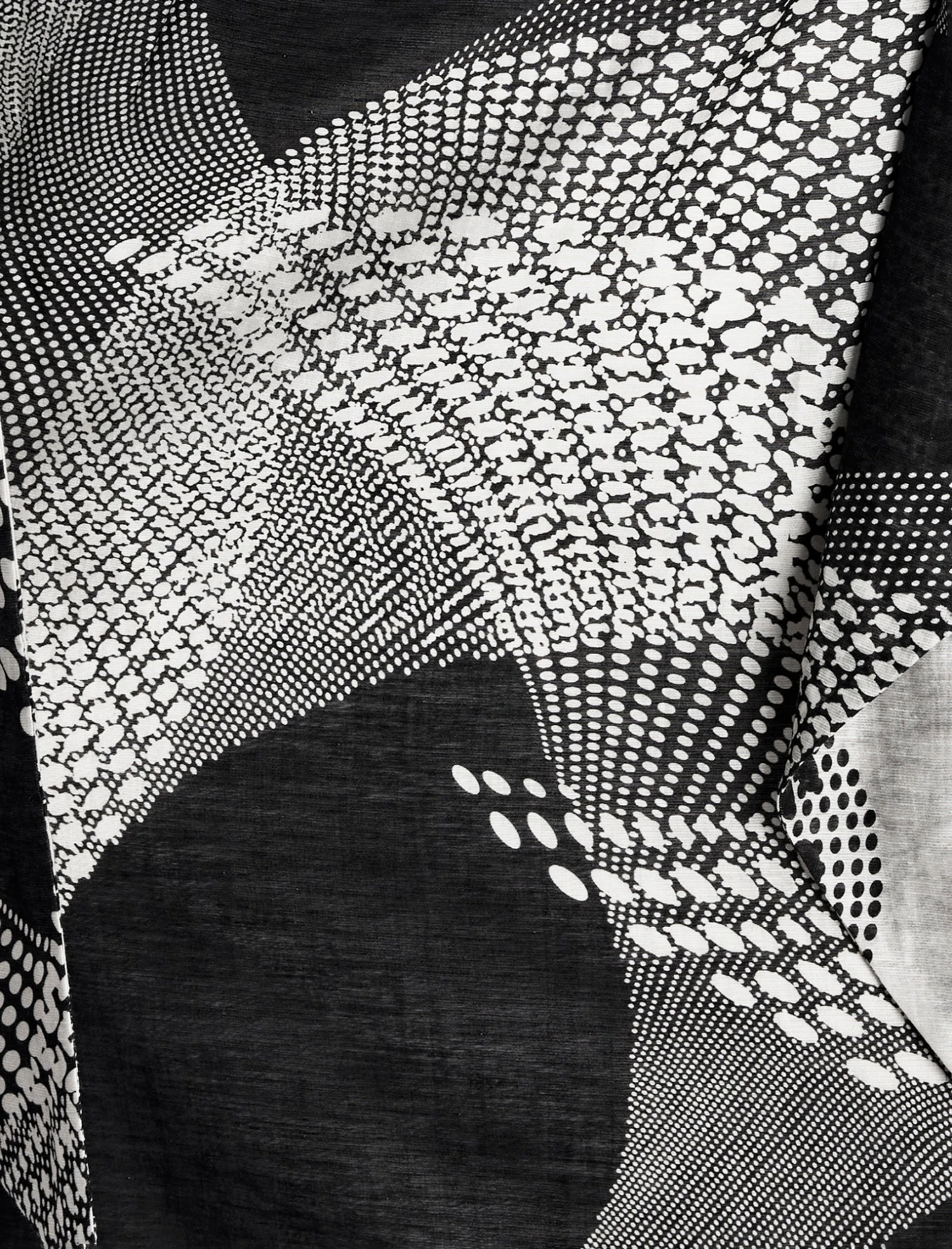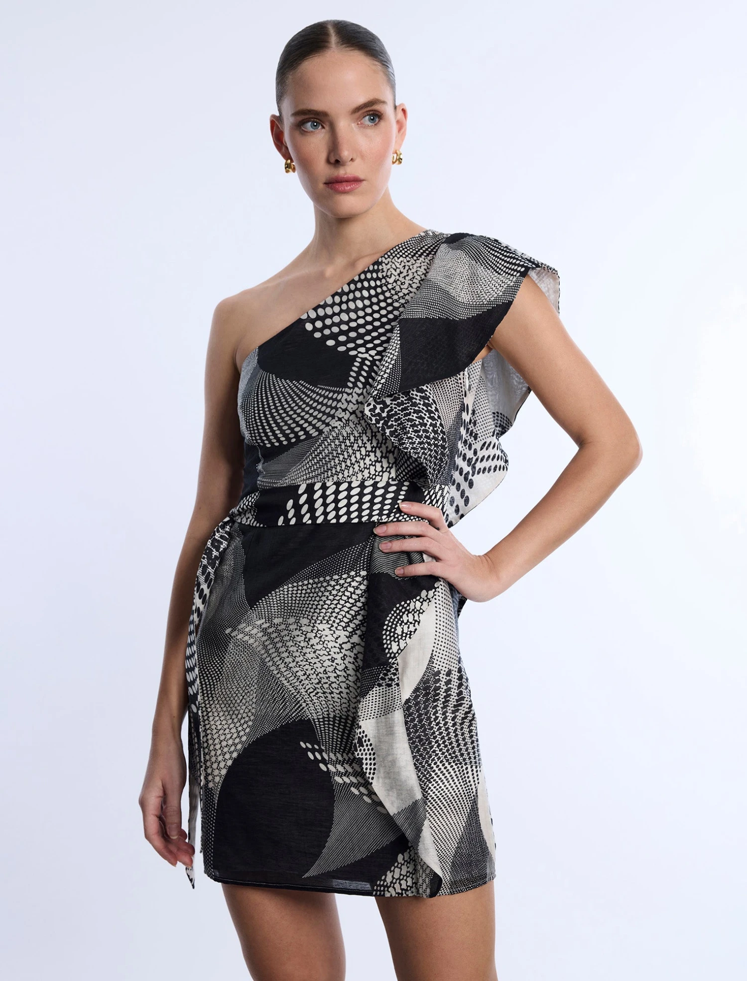 Playful one-shoulder mini dress crafted from lightweight fabric with an abstract monochrome print. Topped with a cascading ruffle detail along the neckline. Done in a cinched-waist, mini silhouette for a bold, artistic vibe. Finished with a concealed side zipper closure.