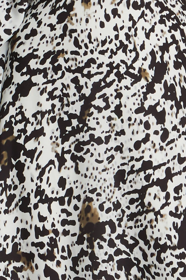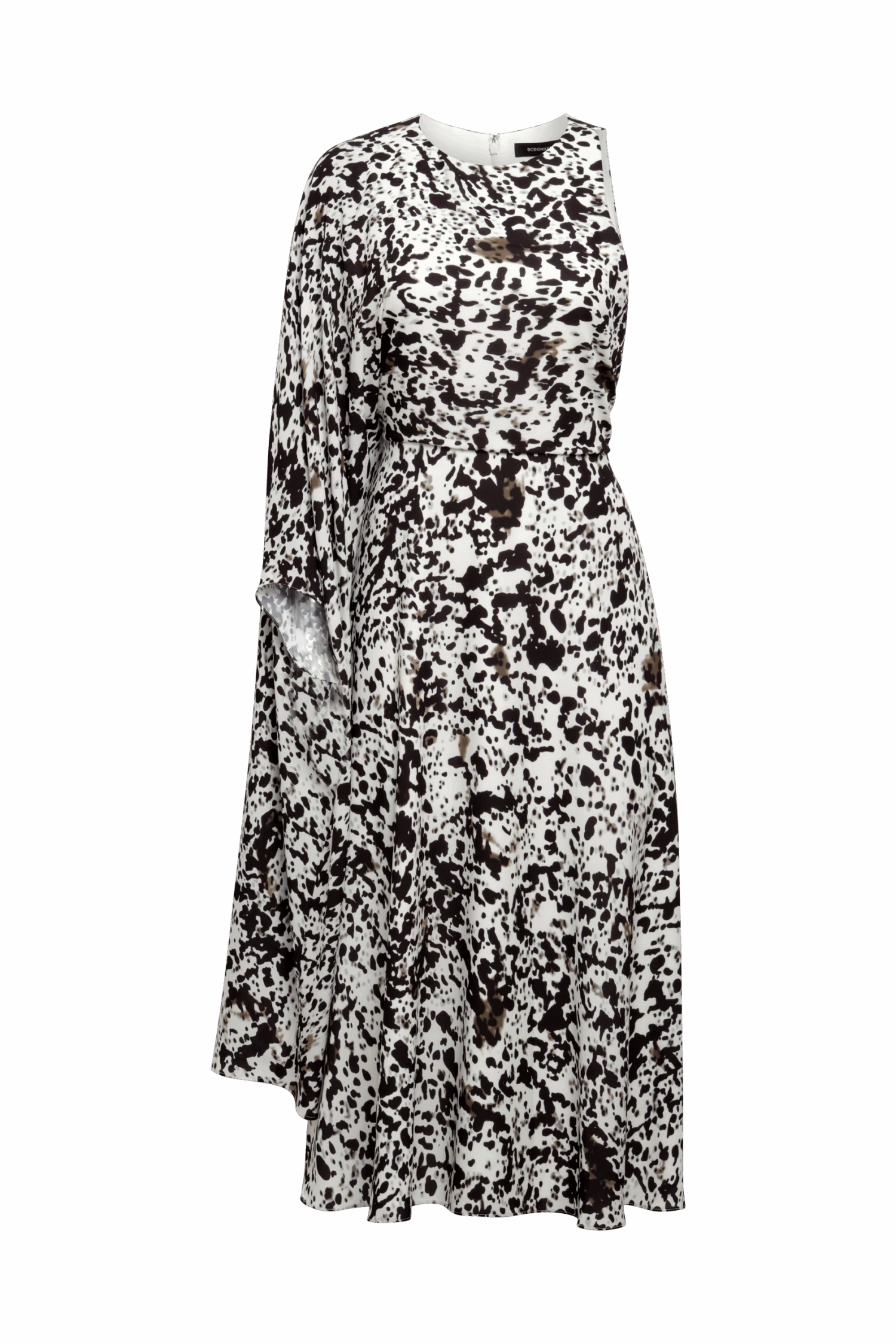 Printed matte jersey midi in a black and ivory abstract motif. Designed with an asymmetric one-shoulder neckline and draped long sleeve, it cinches at the waist and falls into a softly pleated A-line skirt. An easy statement for city weddings, art openings, or afternoon cocktails.