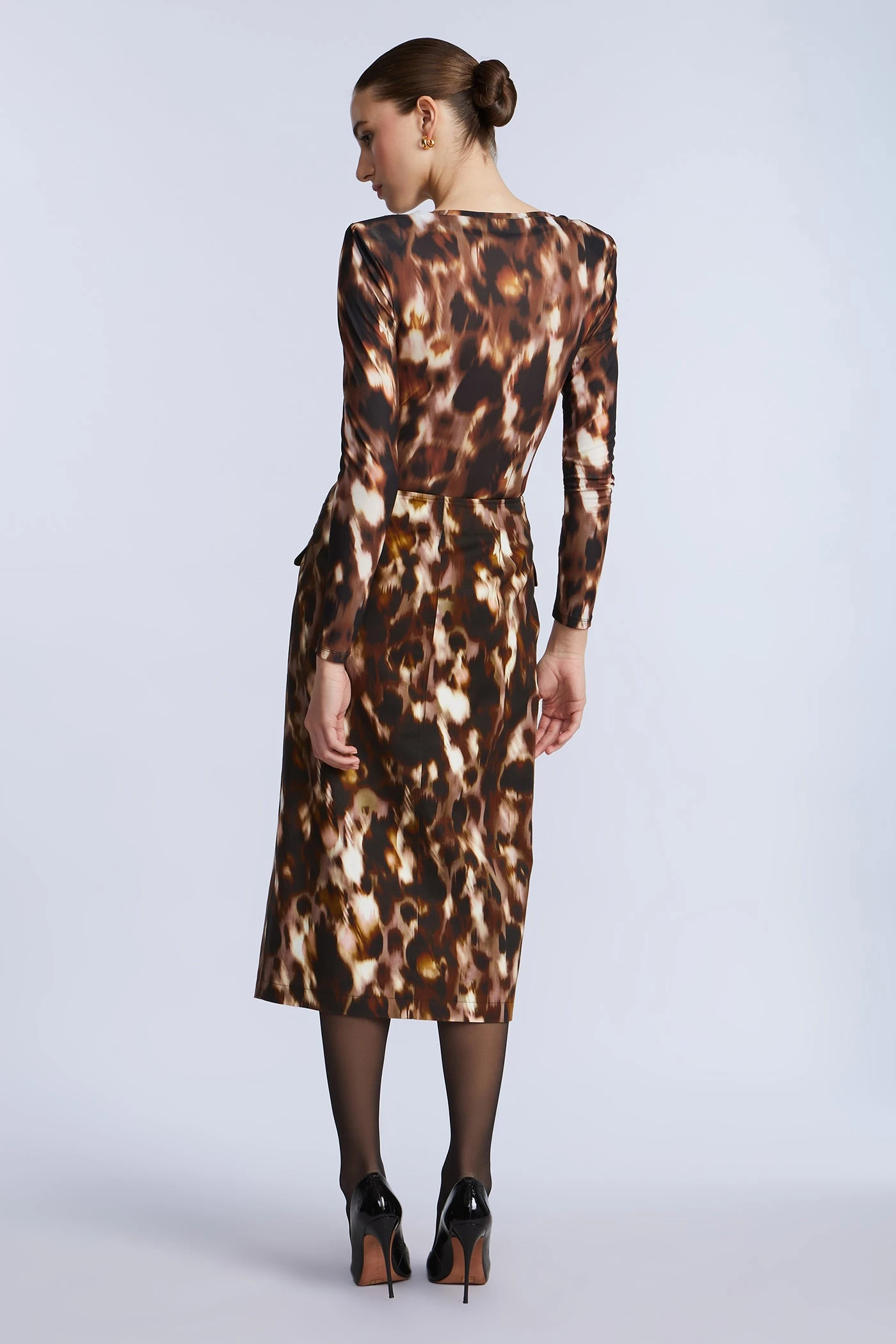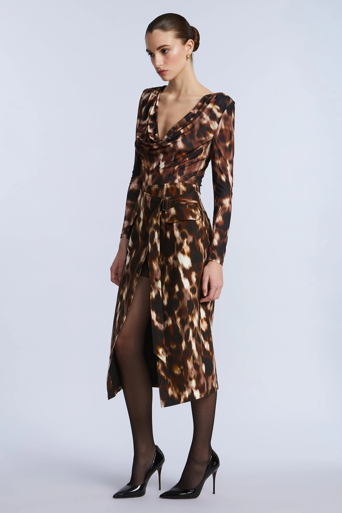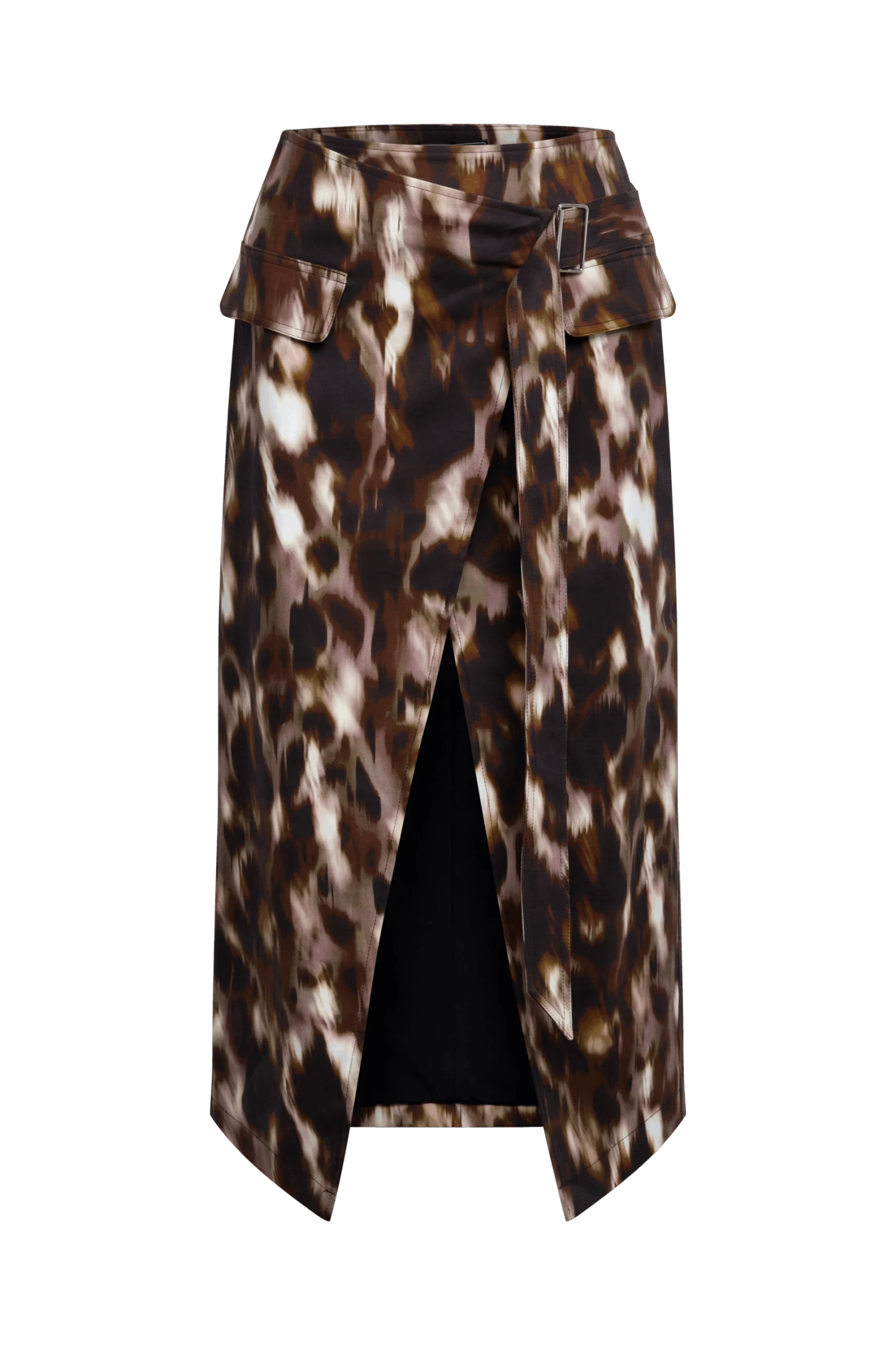 Printed satin skirt with a wrap-style front and adjustable tie belt. Finished with oversized cargo pockets and a sharp slit for a dose of drama. Pair it with the matching bodysuit or keep it simple—your call.