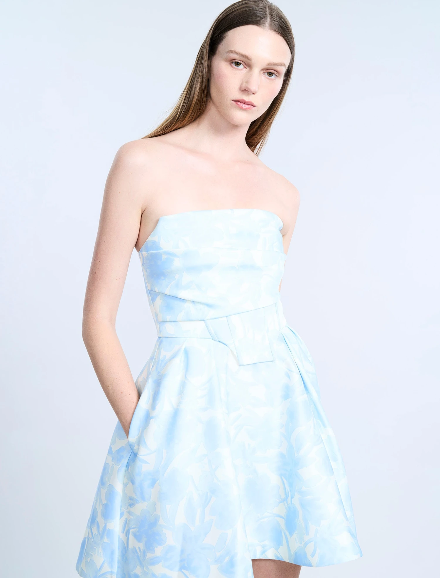 Strapless mini dress crafted from structured floral jacquard in a pale blue tonal print. Features a clean straight neckline, a tailored waistband detail, and a softly flared skirt for a flattering silhouette. Designed with side pockets and a concealed back zip—feminine, fresh, and ready for summer occasions.