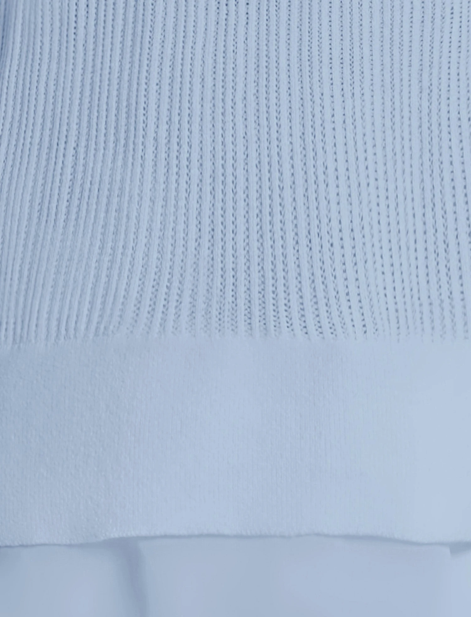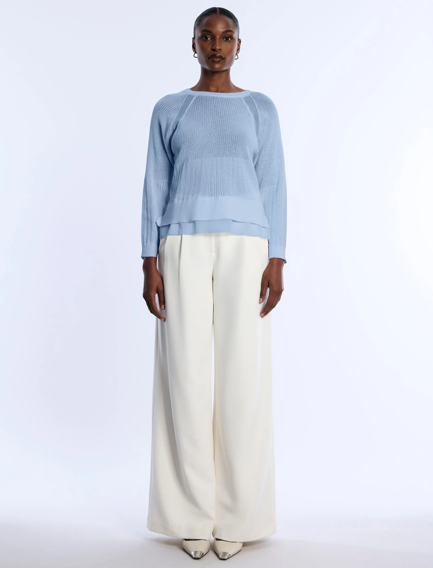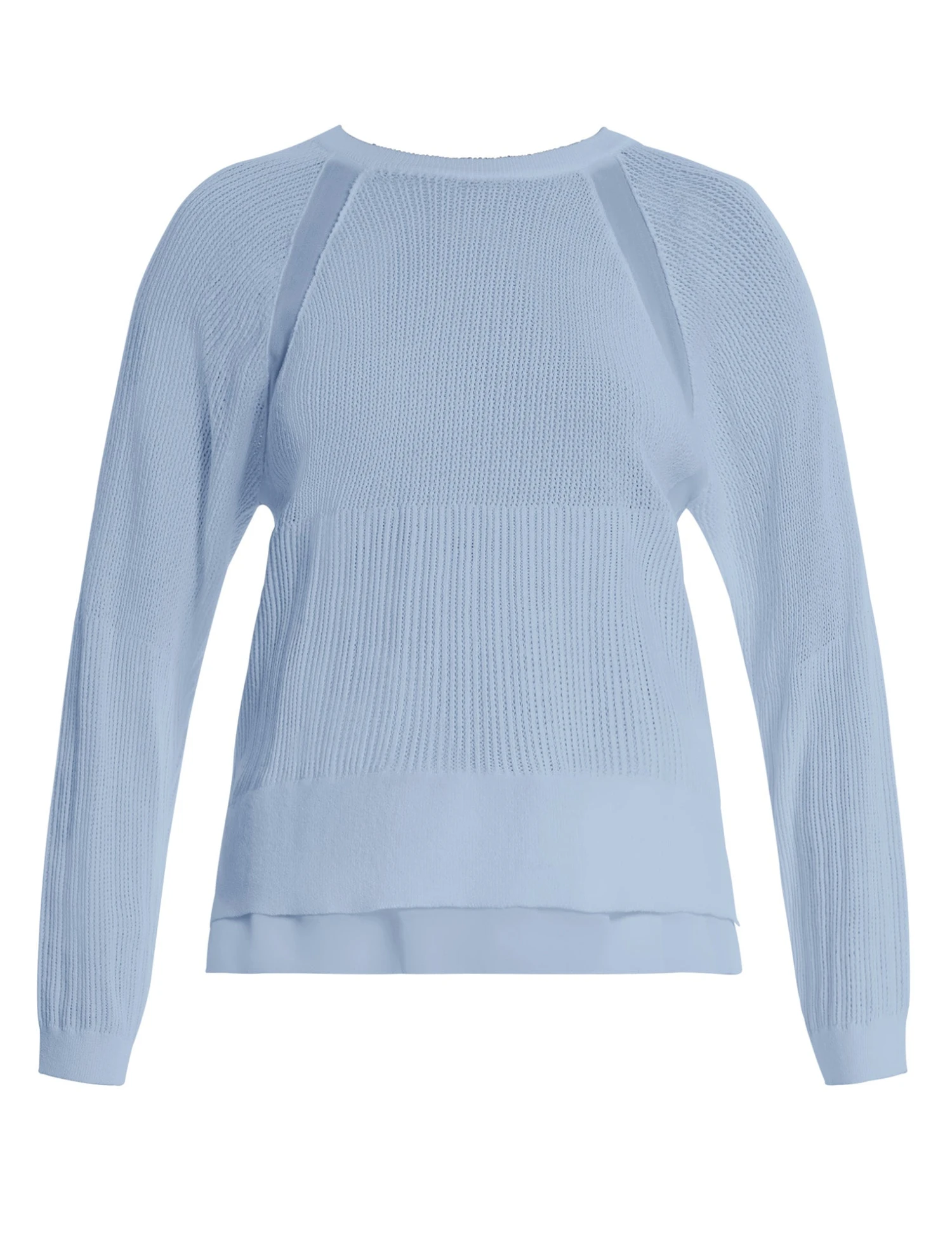 Lightweight knit sweater crafted with a semi-sheer texture in a serene cloud hue. Topped with raglan sleeves and subtle panel details. Done in a relaxed silhouette with a layered hem for added dimension. Finished with a refined, effortless drape.