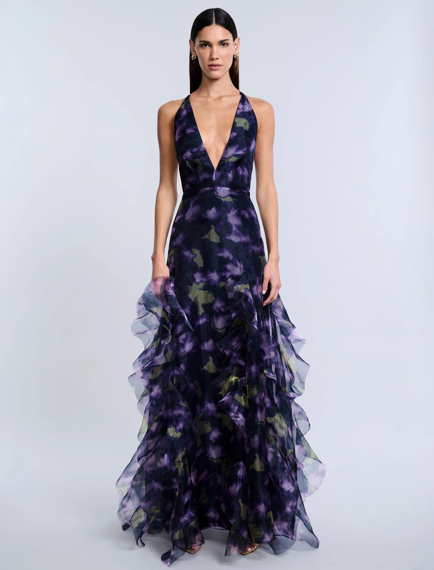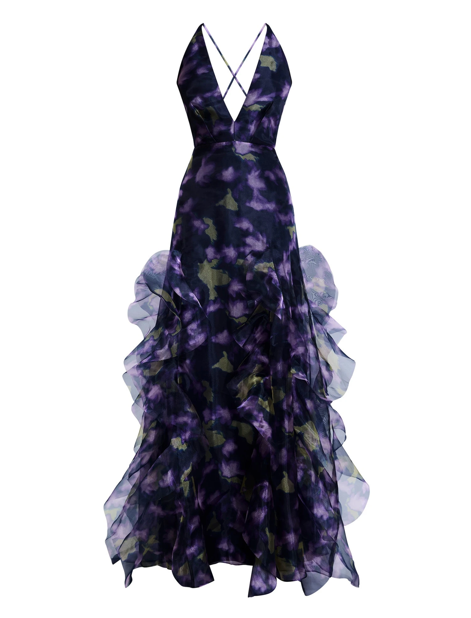 Printed organza gown with a plunging halter neckline and low crisscross back. Features a full-length A-line silhouette with sculptural ruffles and allover painterly florals. Finished with a concealed back zipper—ideal for weddings, galas, and garden soirées.