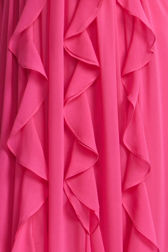Flamenco-inspired halter gown in bright pink chiffon, detailed with sculpted ruching and cascading ruffle trims. Designed with an adjustable tie at the neck and a front slit, the full-length silhouette floats with movement. A playful pick for destination weddings, milestone birthdays, or a gala that calls for a little twirl.