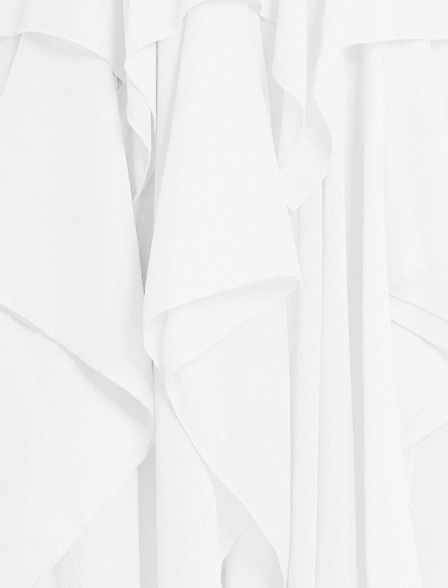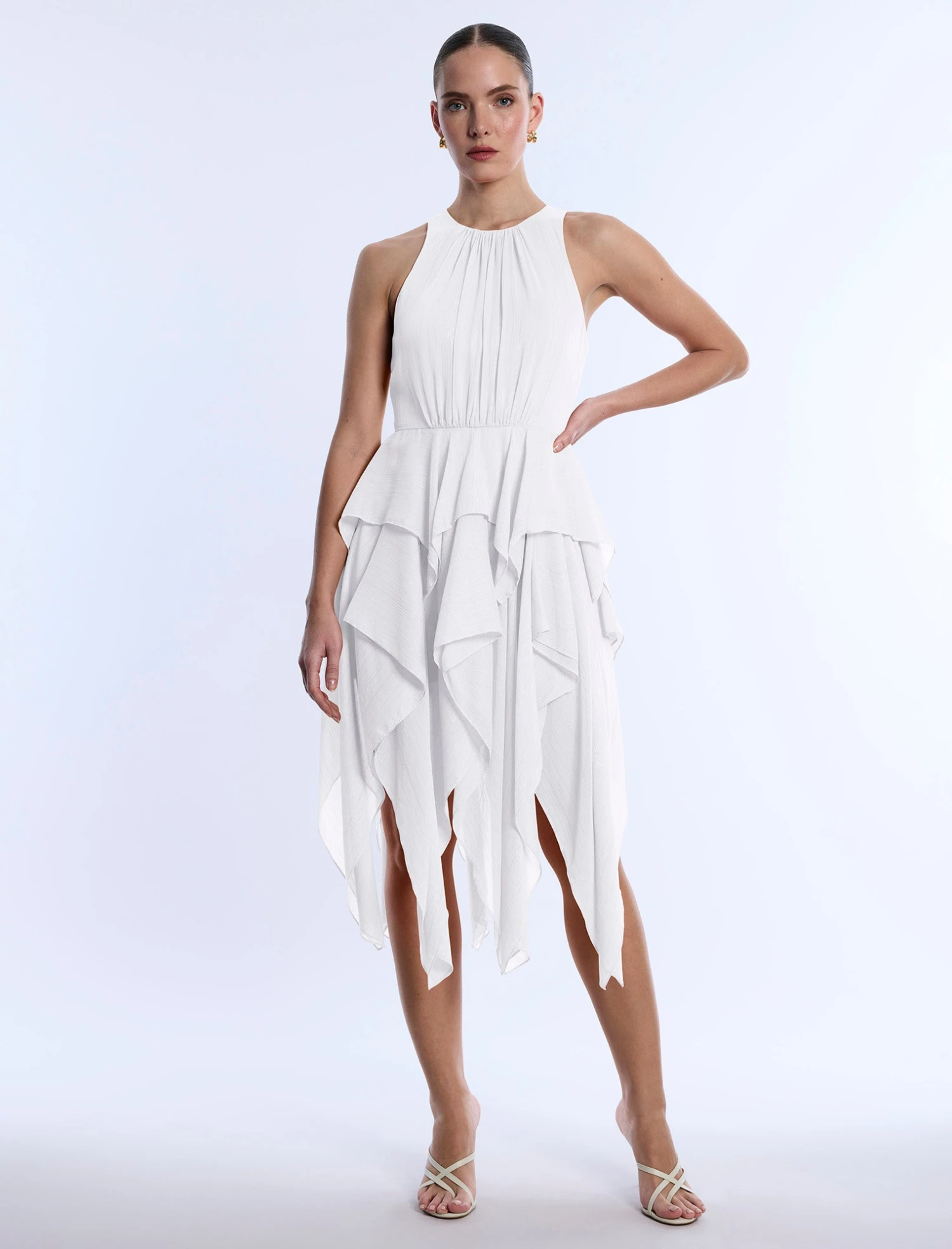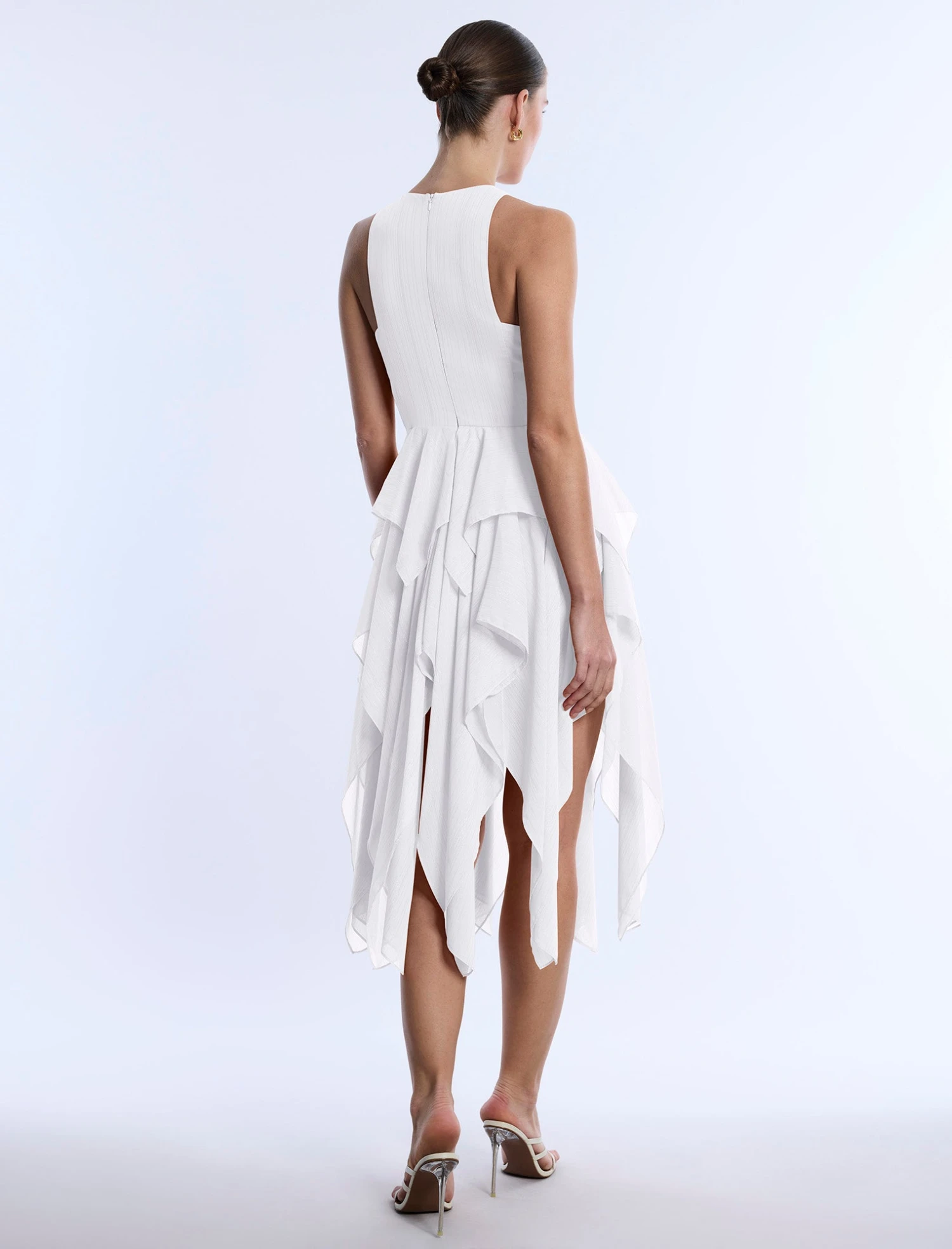 Ethereal midi dress crafted from lightweight fabric in a crisp chalk hue. Topped with a high neckline and delicate pleating. Done in a sleeveless, midi silhouette with cascading, layered handkerchief hems. Finished with a fitted waist and back zipper closure.