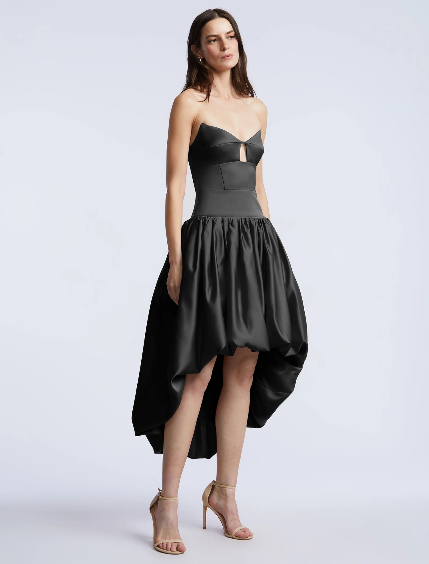 Strapless high-low gown with a sculpted bodice and subtle cutout detailing. Designed with a voluminous bubble skirt that creates dramatic shape and movement, balanced by a clean back zip closure. A bold silhouette made for grand entrances.