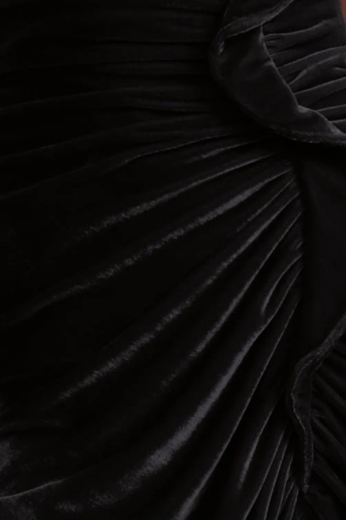 Strapless velvet midi dress in classic black with a soft draped finish. Designed with a sculpted ruched bodice and cascading ruffle detail that flows into a tulip-style hem. Sleek, sultry, and ready for all your after-dark invites.