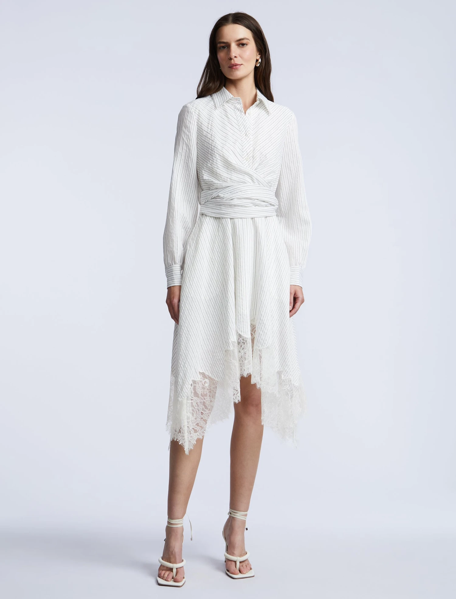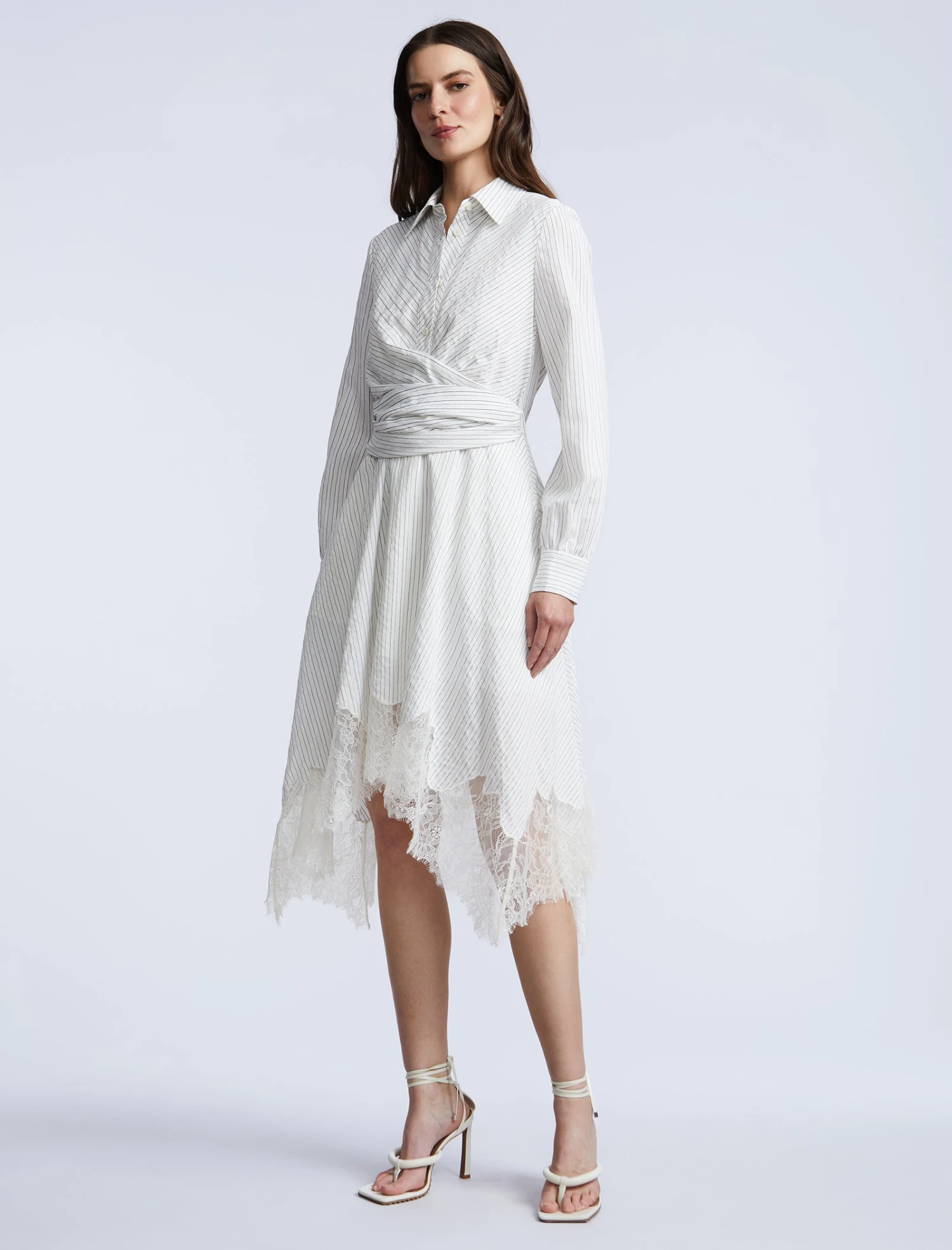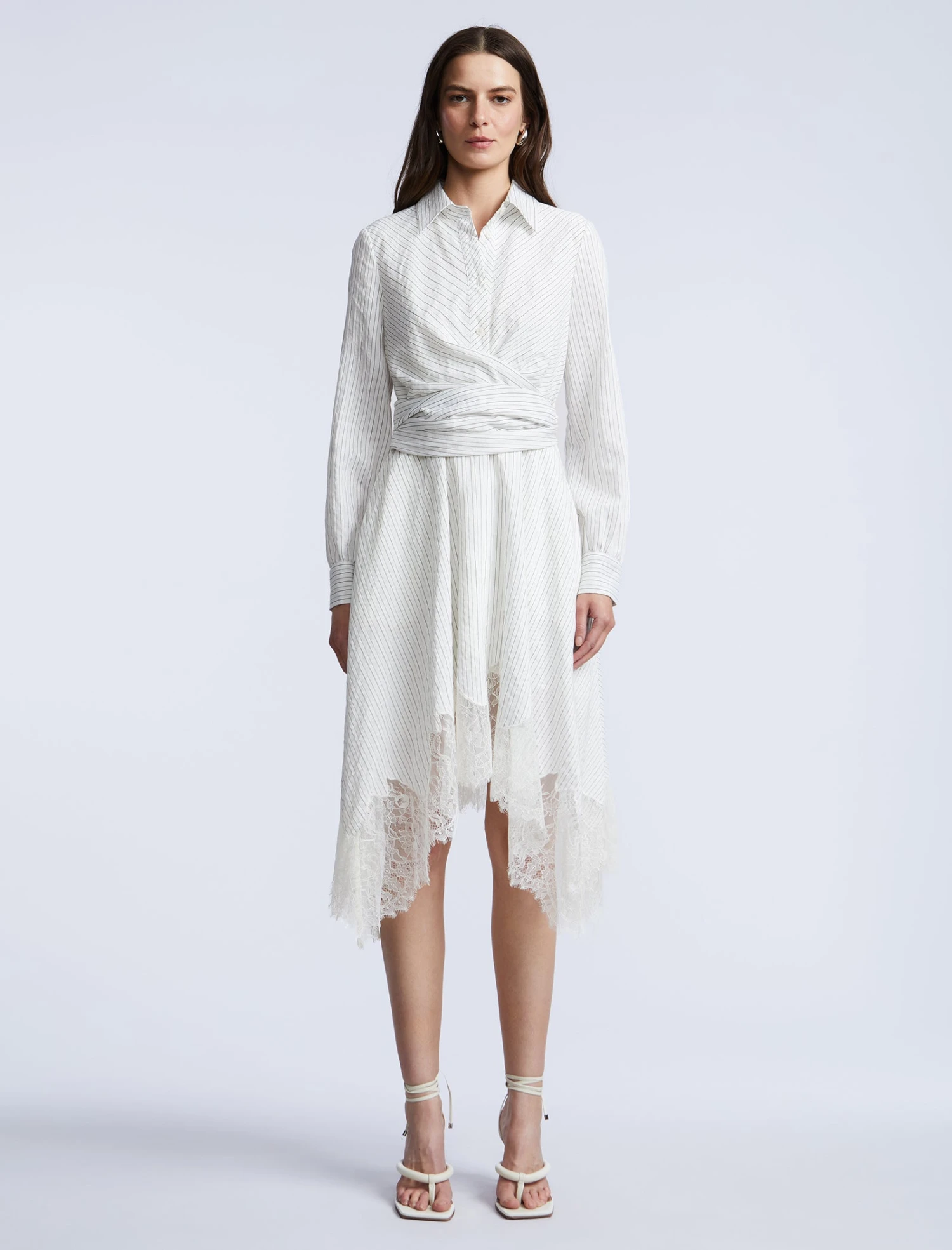 Button-down stripe shirtdress with a twist-front bodice and full-length sleeves, crafted in lightweight fabric with delicate lace-trimmed hem. The asymmetric handkerchief skirt creates a soft sense of movement, blending tailoring with romantic ease. Finished with subtle darting and a collared neckline for everyday polish.