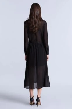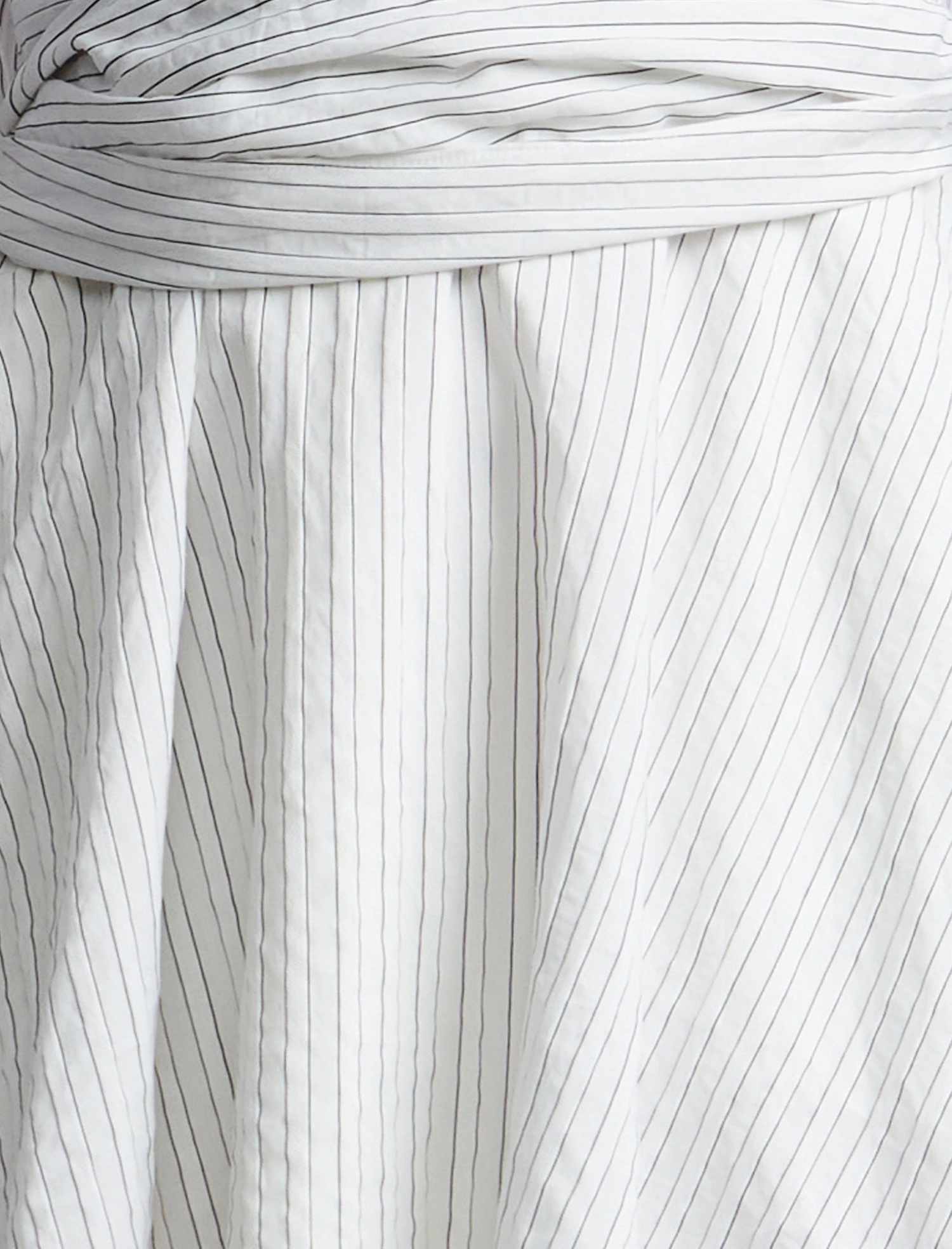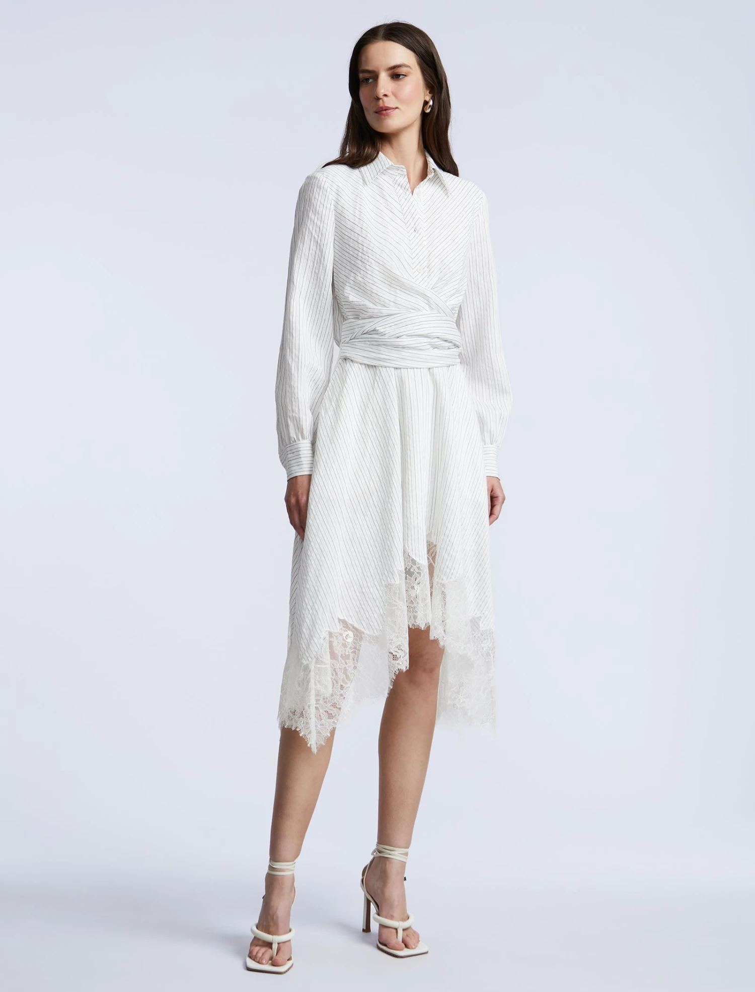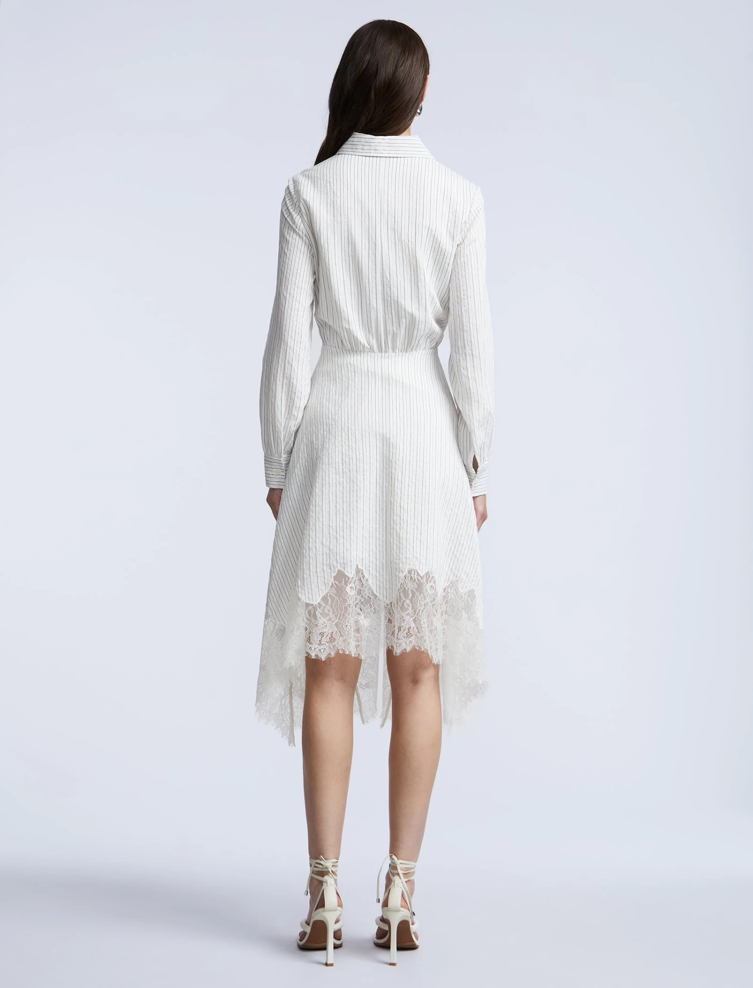 Button-down stripe shirtdress with a twist-front bodice and full-length sleeves, crafted in lightweight fabric with delicate lace-trimmed hem. The asymmetric handkerchief skirt creates a soft sense of movement, blending tailoring with romantic ease. Finished with subtle darting and a collared neckline for everyday polish.