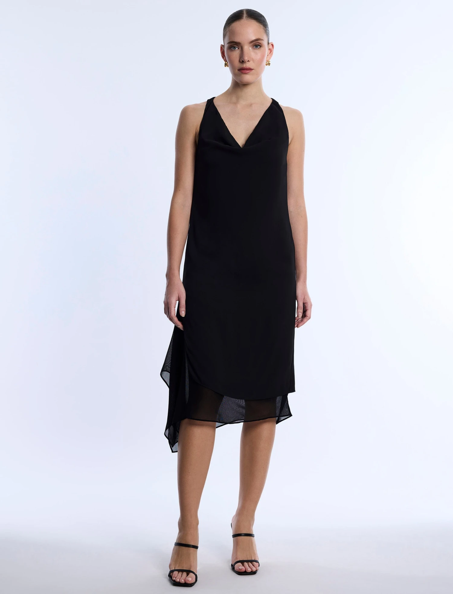 Chiffon midi dress designed with fluid movement and layered dimension. Features a draped cowl neckline and racer-style back with soft gathers. The asymmetrical hem adds a modern finish, while the clean silhouette skims the body. Fully lined and finished with a concealed back zip—ideal for destination weddings or elevated summer evenings.