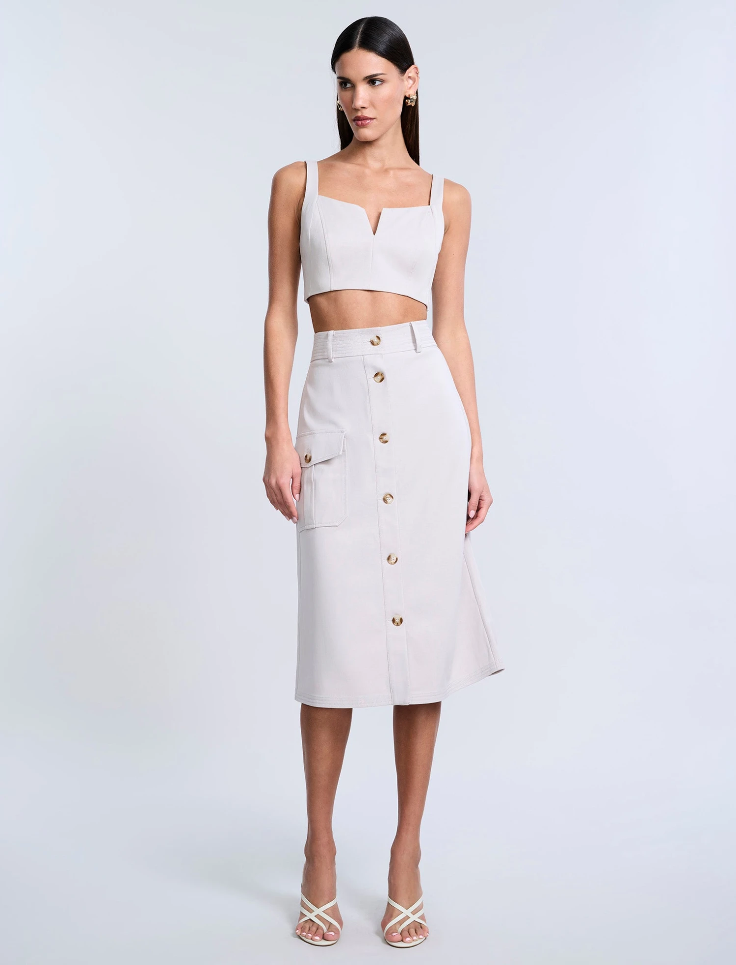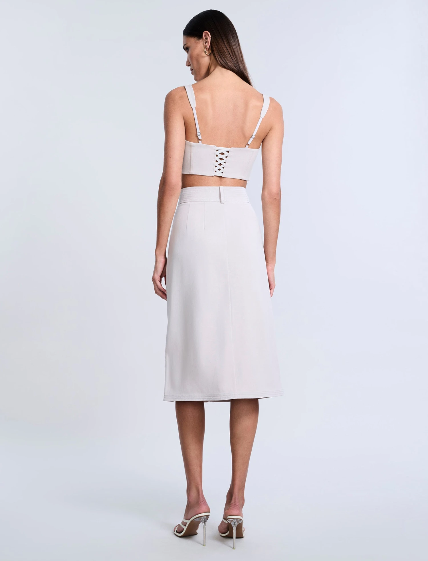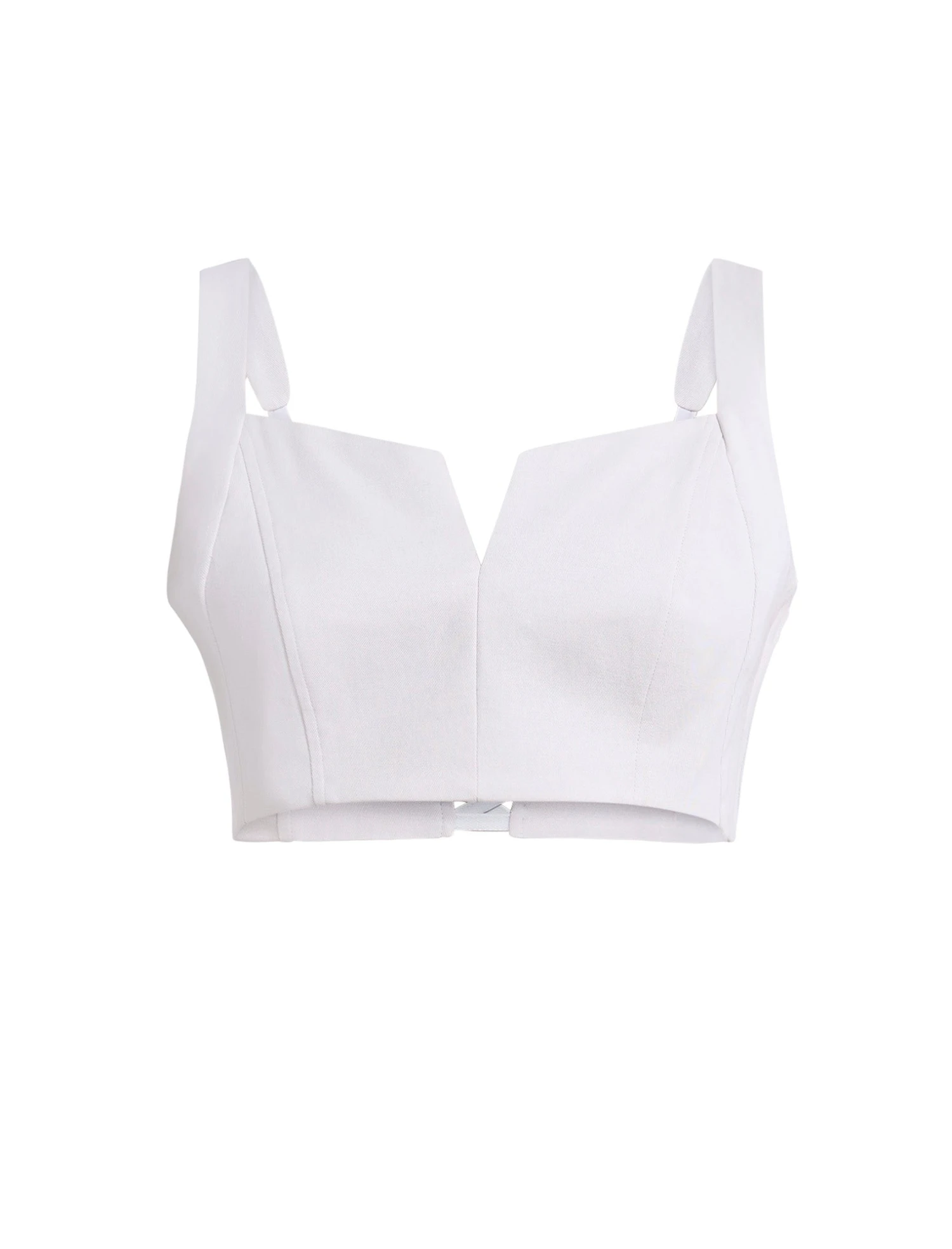 Structured bralette top crafted from woven fabric with a sleek, contoured fit. Designed with a notched neckline and adjustable straps for a customizable fit. Finished with a lace-up back and side zipper closure for added detail and support.