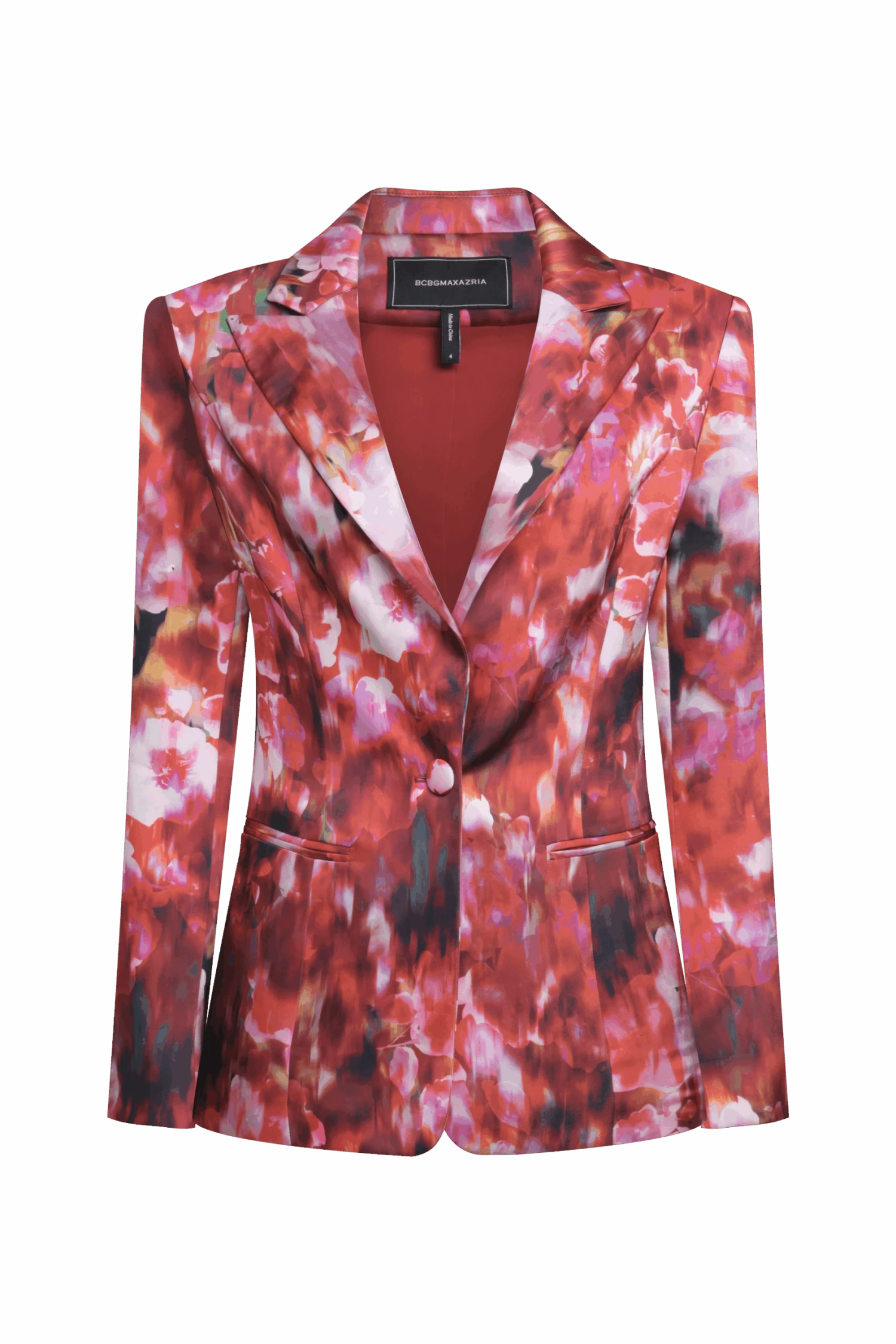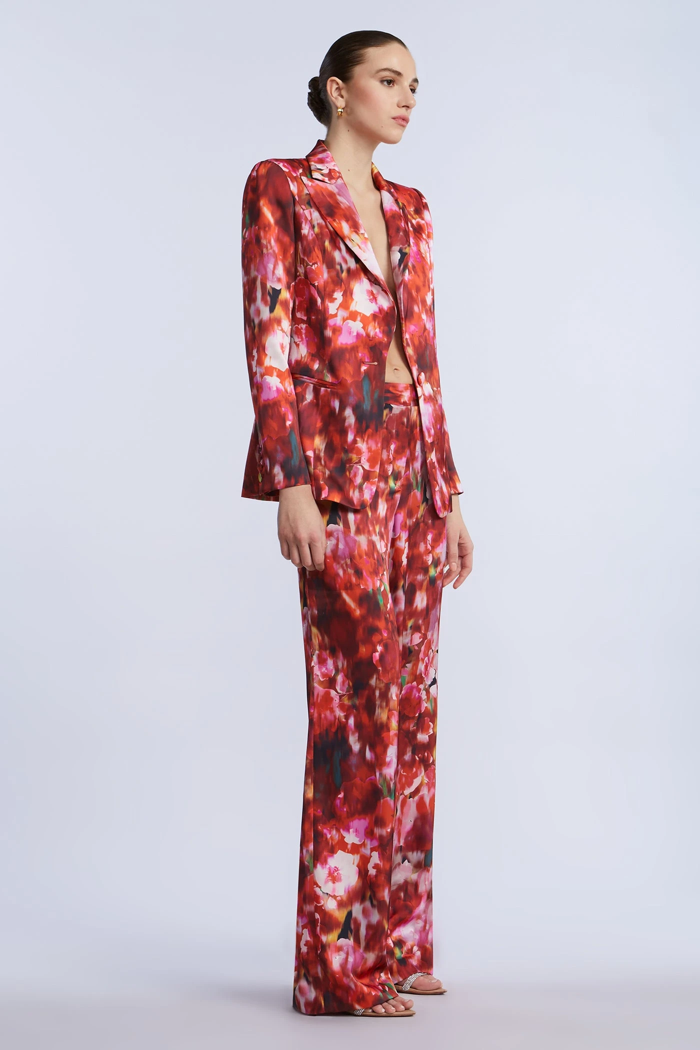Painted floral twill blazer in a vibrant blend of reds, pinks, and cream. Cut with a sharp single-summary silhouette and notched collar, it layers cleanly over its matching pant or stands alone with denim. A bold go-to for office or anywhere you want to make an entrance.