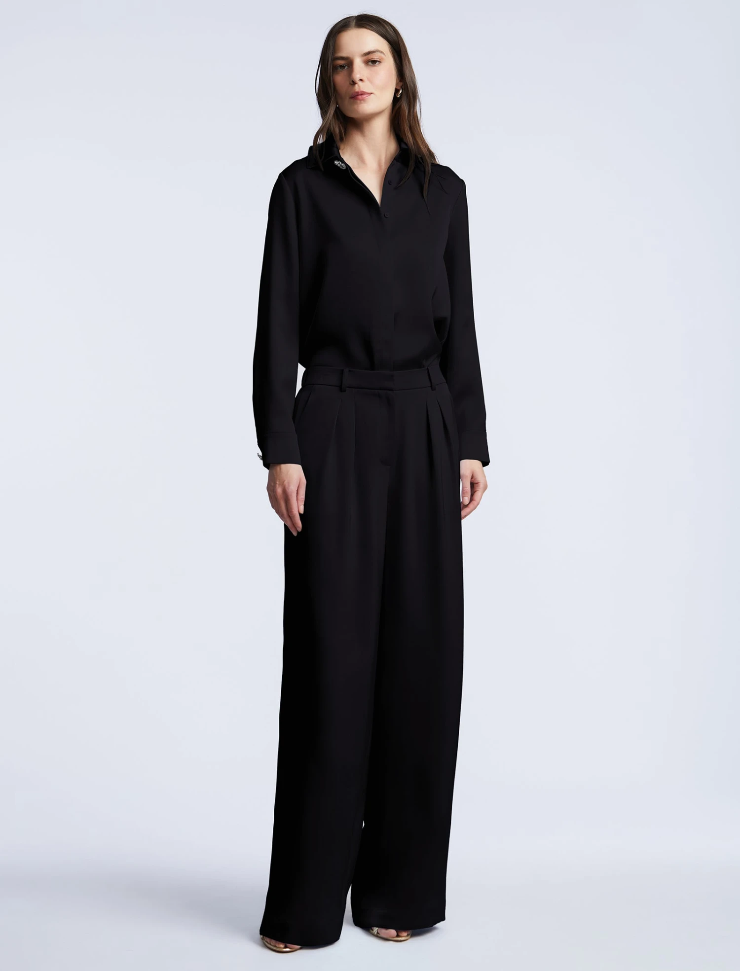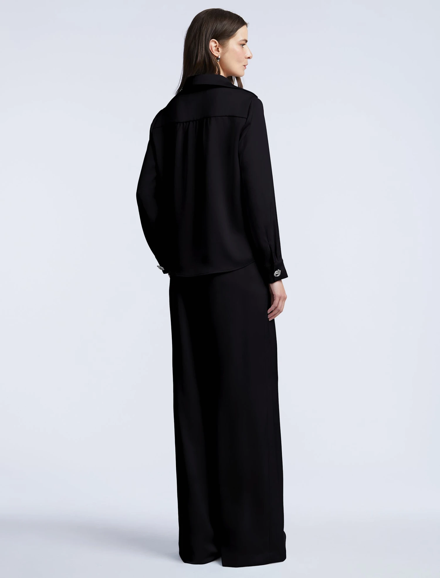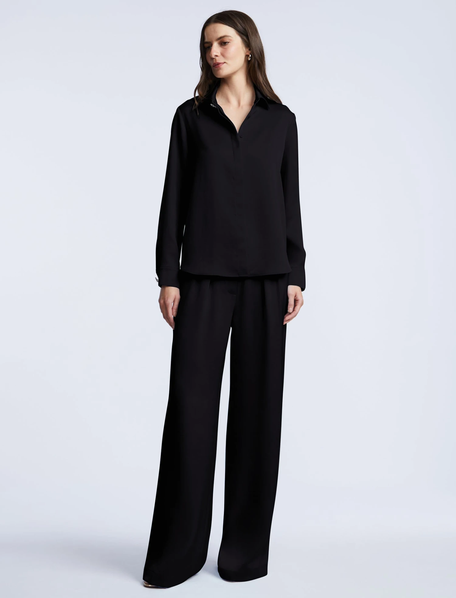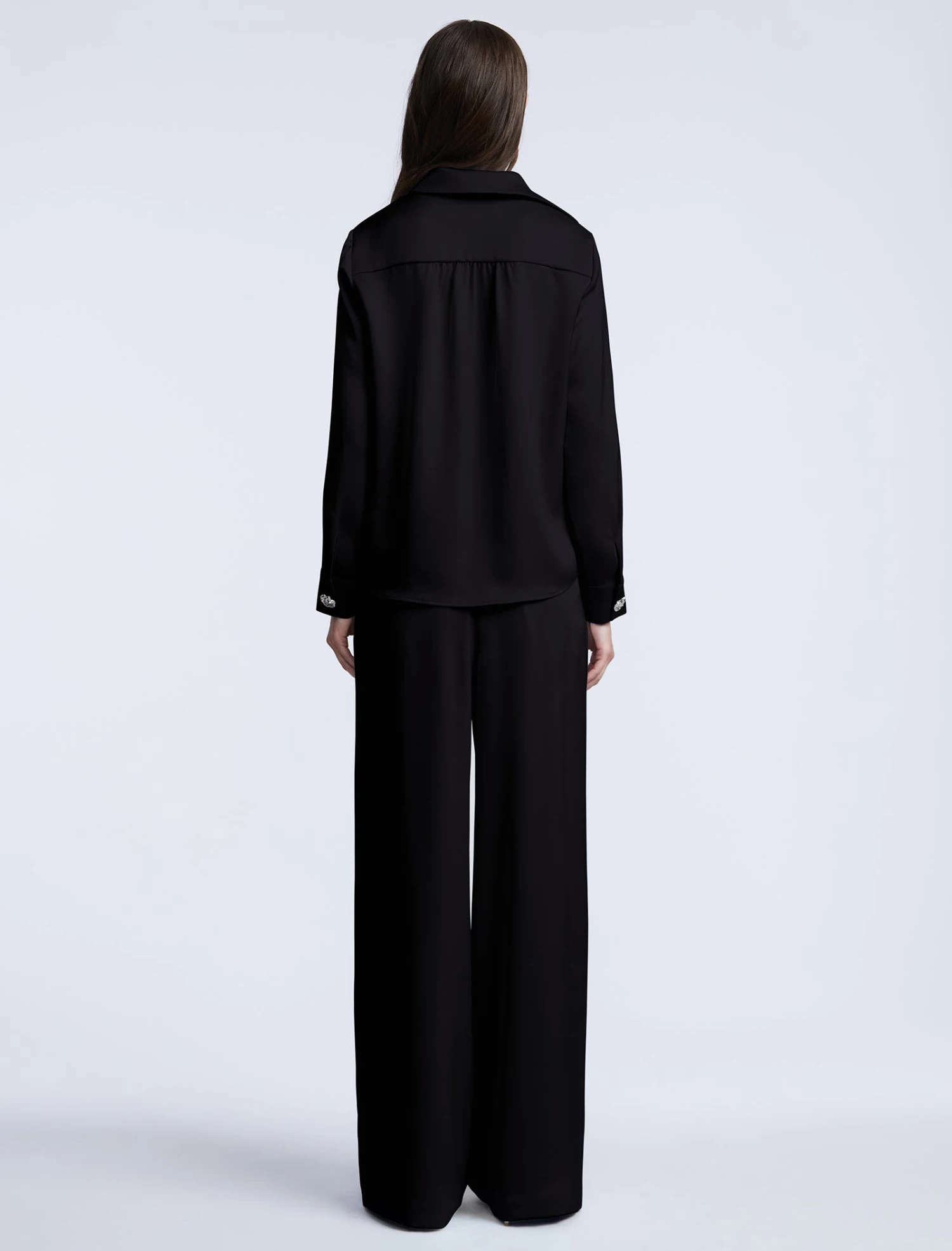 Black satin summary-down blouse with a clean collar and a smooth concealed placket. Cut in a relaxed silhouette with a curved hem and subtle back yoke pleats for added drape. Finished with long sleeves and minimal cuffs—your go-to piece for dinner dates and power meetings alike.