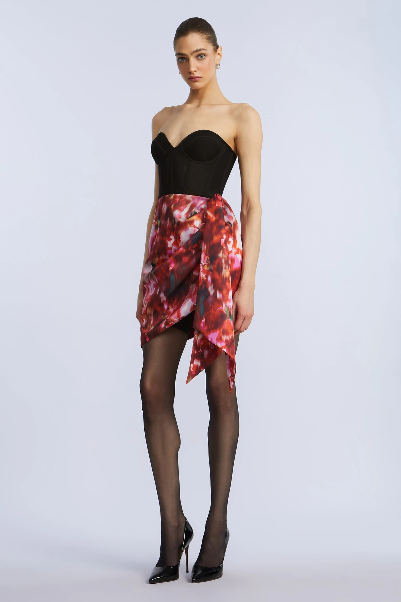 Painted floral mini skirt with a cascading asymmetric drape. Crafted in twill with a wrapped silhouette, it hugs the waist and flares into a soft angled hem. A playful piece for date nights.