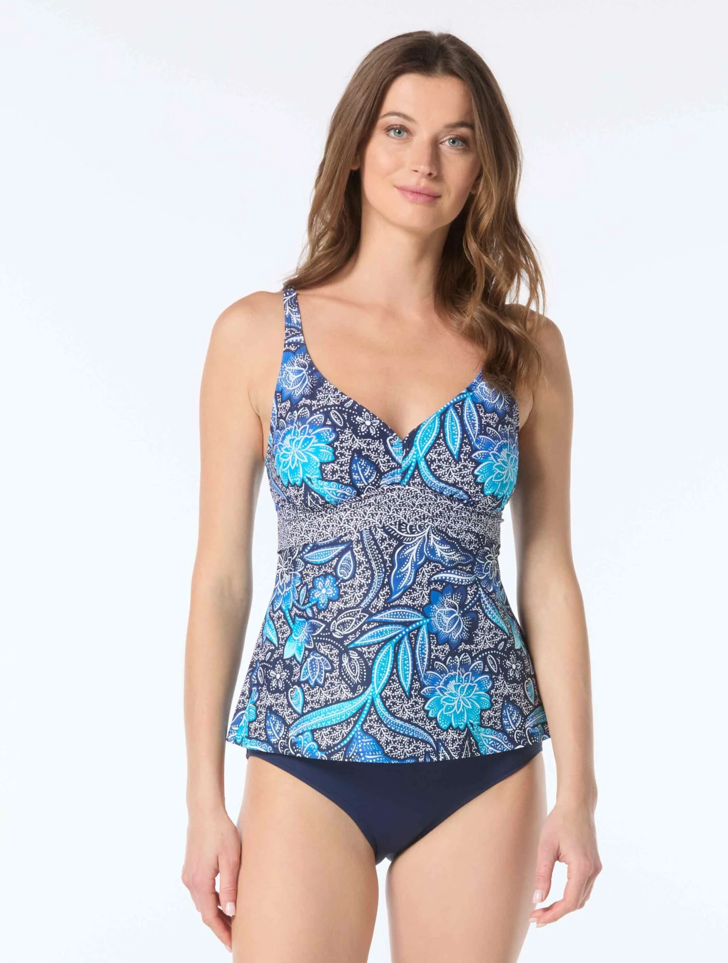 Hit the sand in style with a tankini top. A fitted silhouette with v-neckline and crossed band is a flattering style with a fashionable flair. The whimsical blend of florals is inspired by beautiful and intricately detailed tropical flowers. A contrast printed band is perfect for coordinating with printed or solid bottoms.