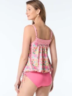 A slim fit tankini offers easy mobility for all your active needs. Wear it with shorts, swim skirts or leggings for just about any sport. A blend of bold flowers and geo print add a trendy, tropical touch.
