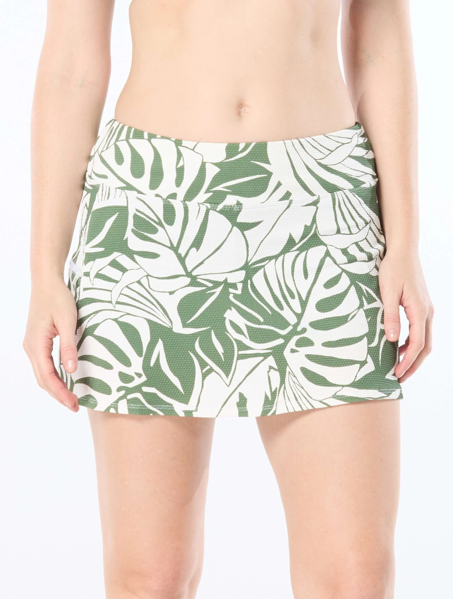The Beach House Emma Swim Skort is the swim bottom you’ll want to wear … everywhere! Feel confidently covered in this figure flattering fit with a no dig, comfort waistband and comfortable shorts underneath. A soft pique fabric adds a textured touch to a trendy tropical print while a functional zippered pocket provides room for cash or a key, no purse needed!