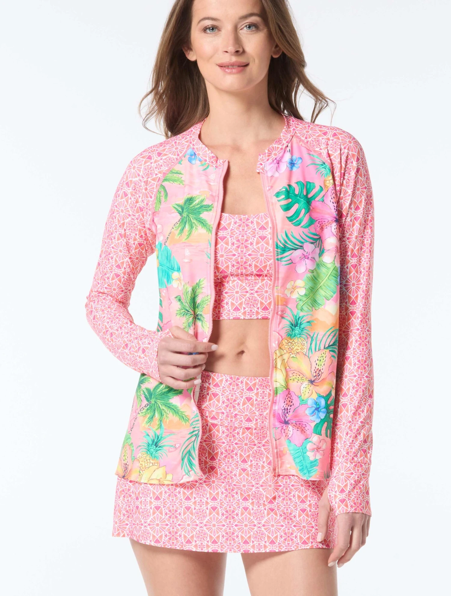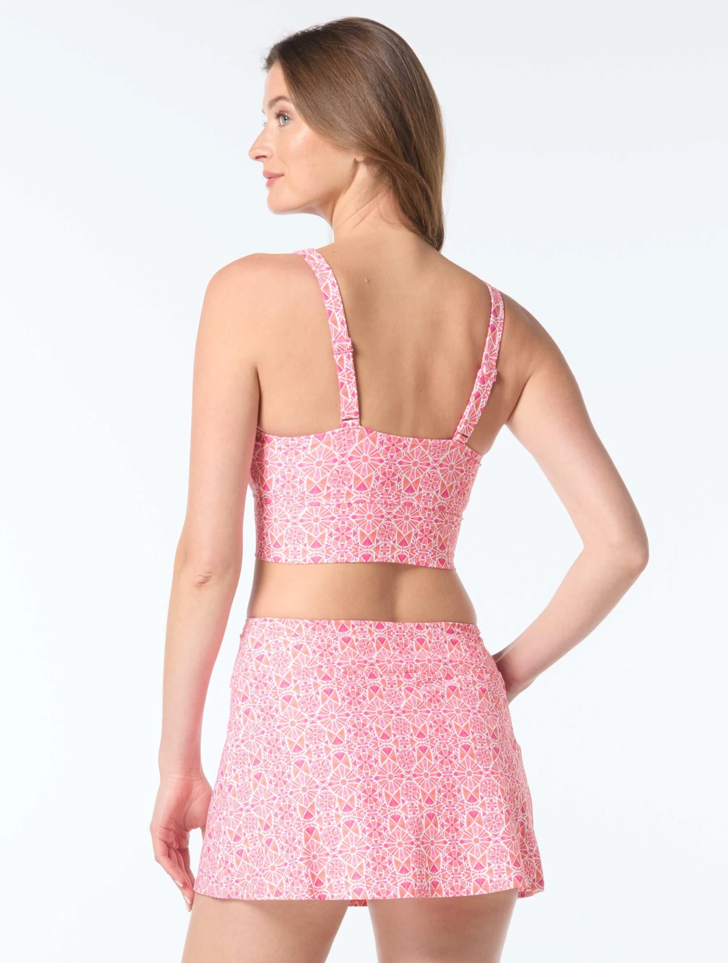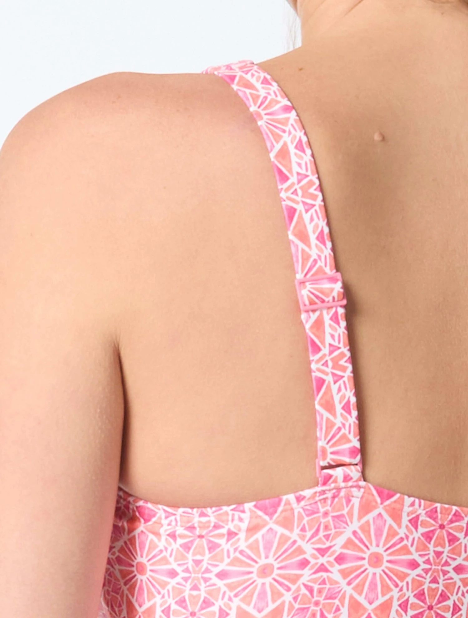 For a sleek and sporty style, this underwire bikini top is perfect as a swim or active option. Adjustable straps provide comfort and support. Pair it with bikini bottoms for the beach or swim skirt and rash guard for pickleball. An allover abstract tropical inspired print is flirty and feminine.