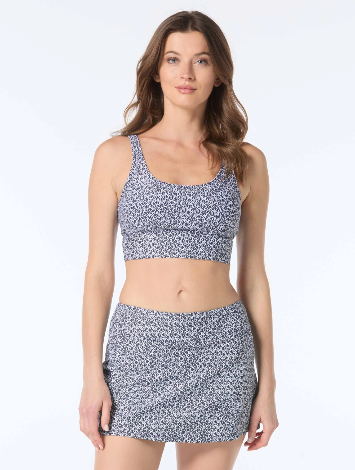 For a sleek and sporty style, this abstract, tropical print, underwire bikini top is perfect as a swim or active option. Adjustable straps provide comfort and support. Pair it with bikini bottoms for the beach or swim skirt and rashguard for pickleball.