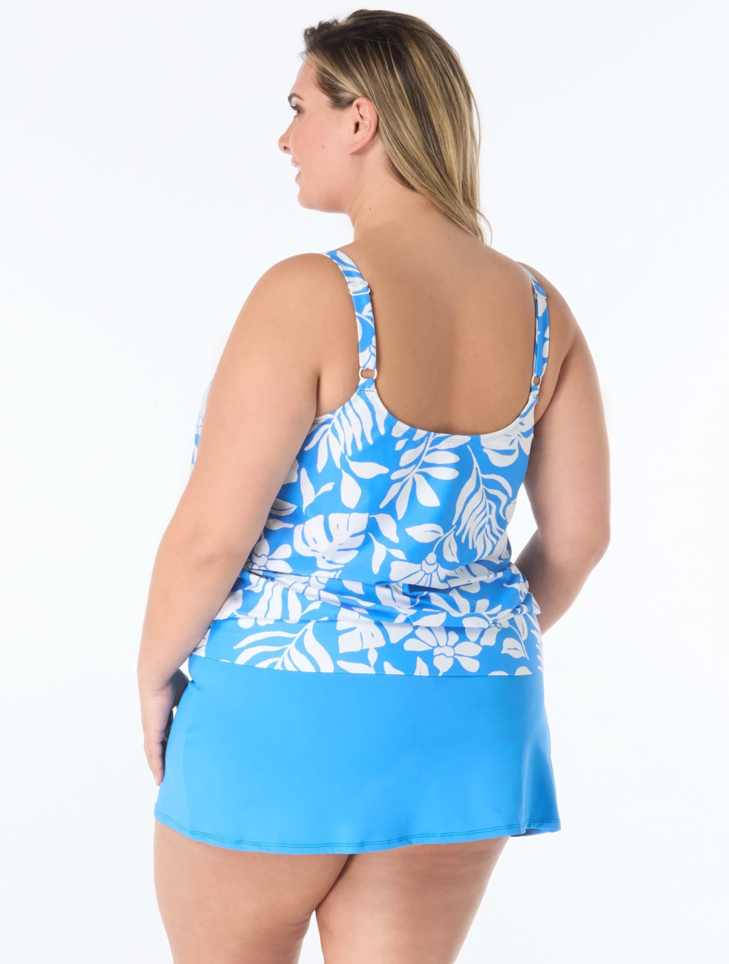 This plus size tankini top gives you feminine flare in a curve-contouring style. Soft cups provide shapely support while adjustable wide straps offer a customized, perfect fit! A colorful floral print is inspired by stunning sunset hues.