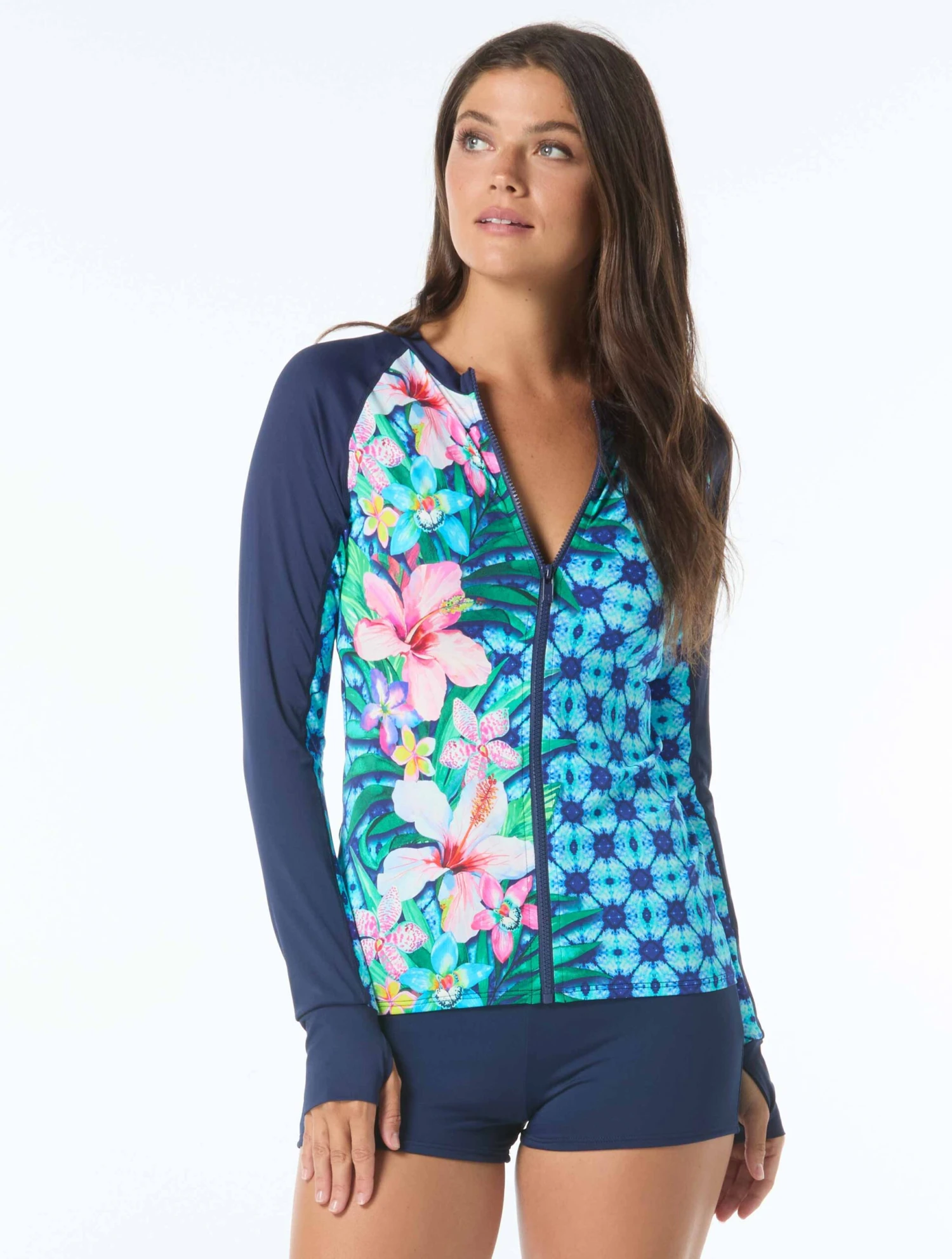 Designed to be worn over your swim top, this rash guard provides extra coverage from the sun. A lightweight fabric, keeps you cool and comfortable. A blend of bold flowers and geo print add a trendy, tropical touch.