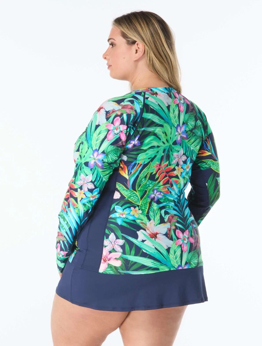 Designed to be worn over your swim top, this plus size rash guard provides extra coverage from the sun. A lightweight fabric, keeps you cool and comfortable. A tropical floral print adds a trendy touch.