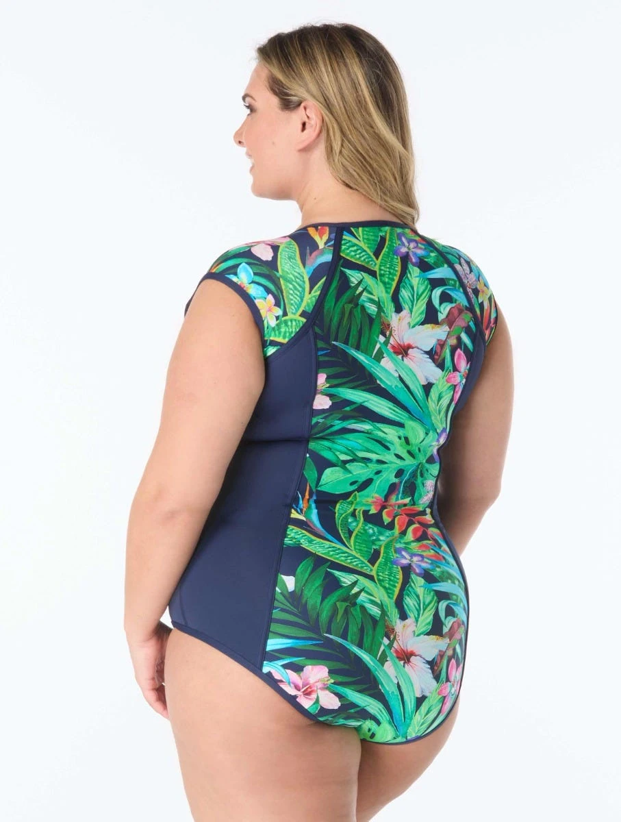 Supportive and sleek, get a two-for-one option with this plus size swimsuit featuring a zip front one piece and a separate sport bikini top. Contrast sides with a tropical print adds a cool touch.