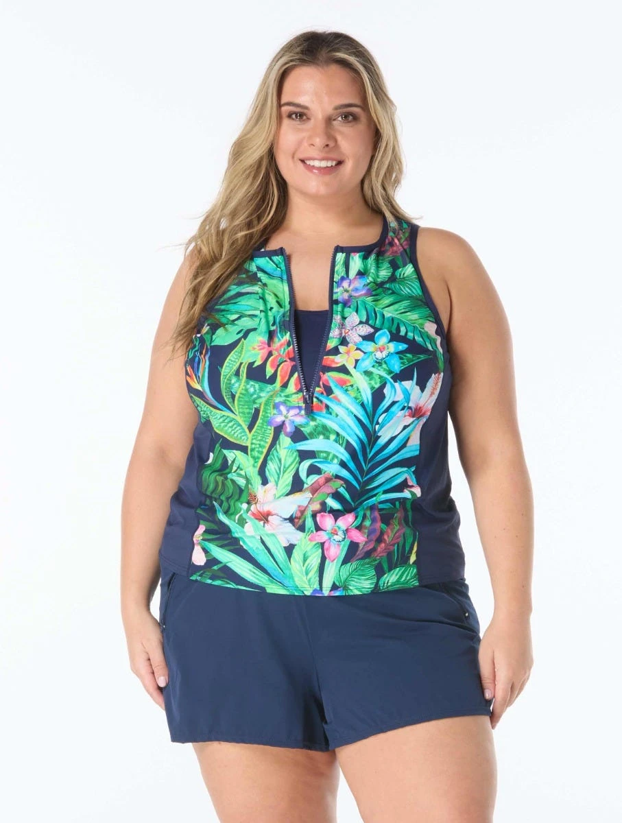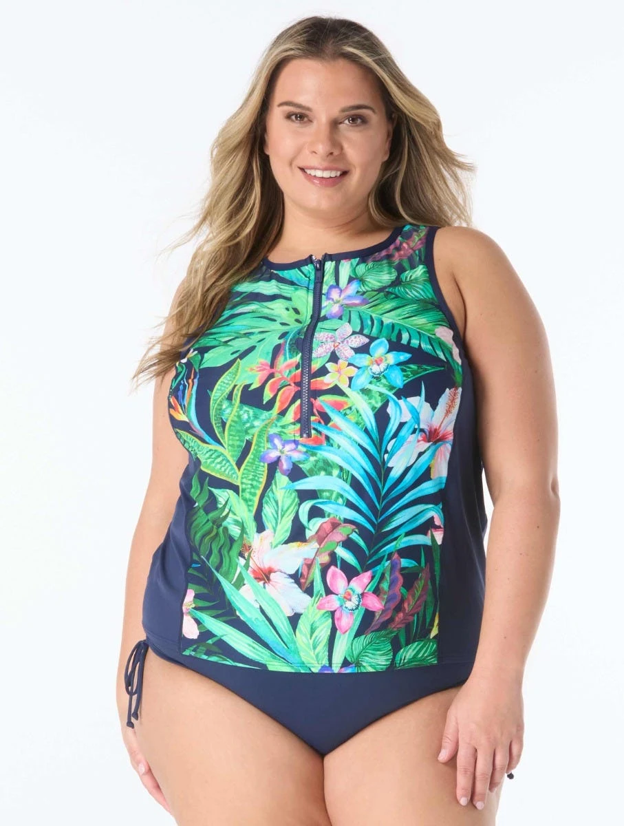 Get a sweet and sporty look with this tropical print plus size top. Tankini length offers mid section coverage with a comfortable yet functional front zipper neckline.