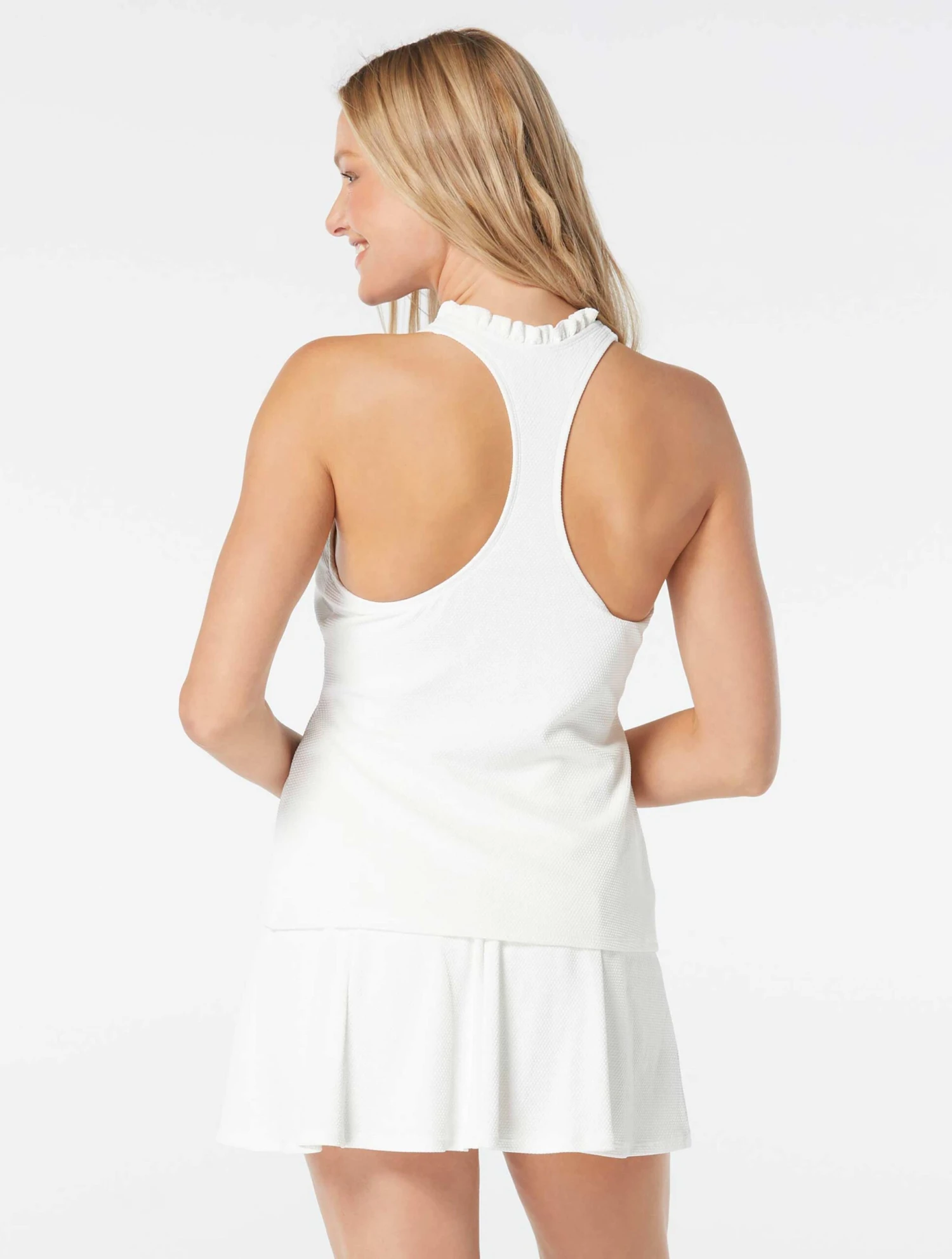 Pretty and piqued! The Beach House Swim Nina Ruffled Trim Textured Tankini Top features a pique textured fabric in classic solids, with a ruffle trim neckline, for a timeless stylish silhouette. Pair it with a swim skort for your active morning or an afternoon dip in the pool. Beach House swimwear is designed with high-end fabrics that bend with you for extra comfort, easy fit and shape retention.