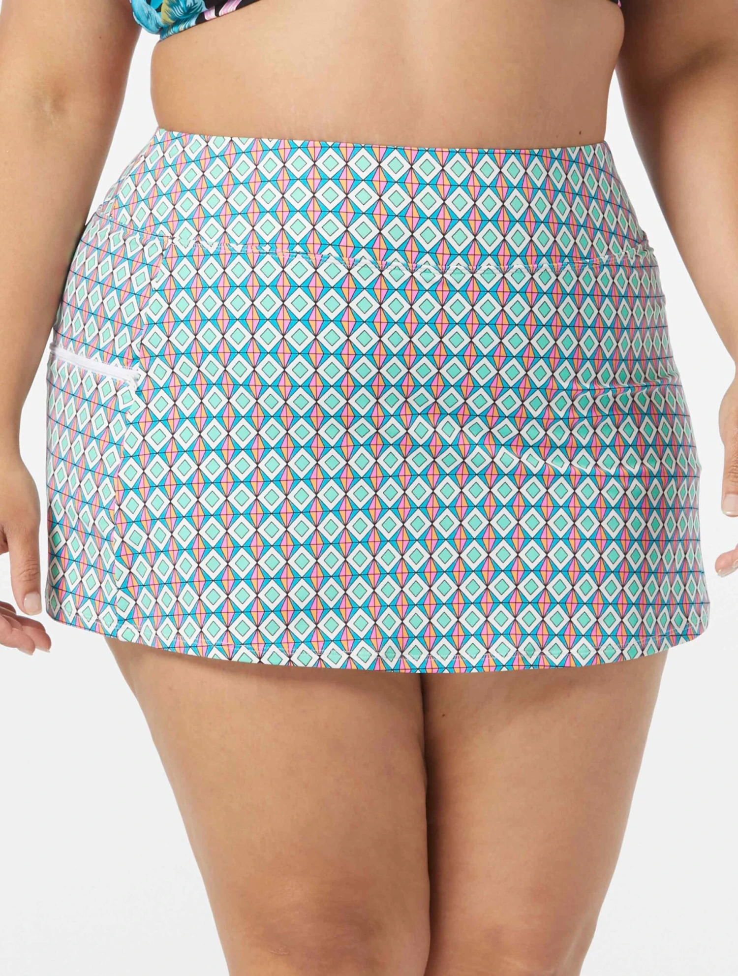 For a comfortable fit the best-selling Beach House Plus Size Emma Pull On Swim Skort in a vibrant, abstract print is a must-have! Shorts are layered underneath a skirt to offer confident coverage and a figure-flattering fit. A trendy and functional zippered pocket provides room for cash or a key, no purse needed! Beach House swimwear is designed with high-end fabrics that bend with you for extra comfort, easy fit and shape retention.