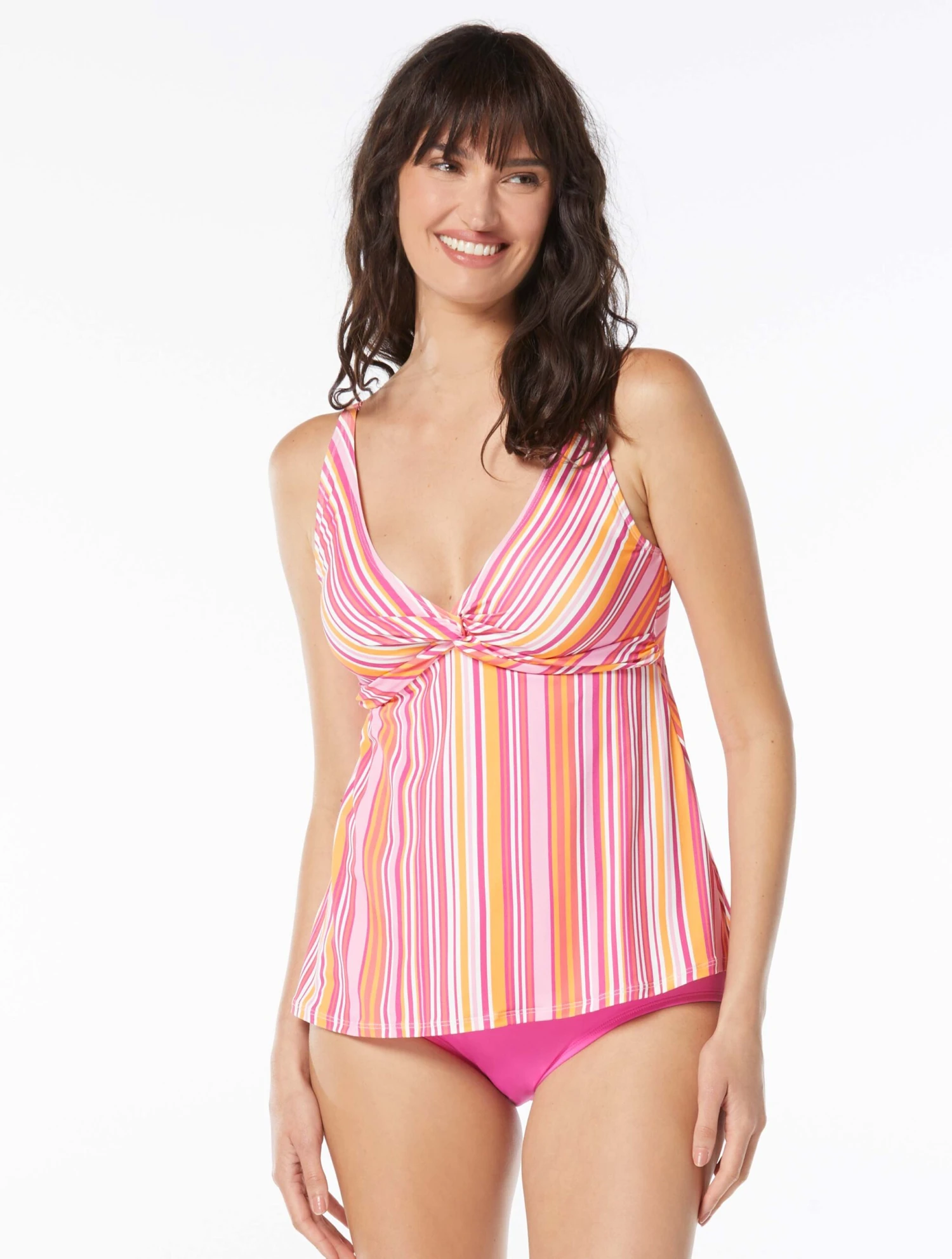The Beach House Swim Willow Underwire Tankini Top flatters your body with a flowy silhouette in a colorful stripe print and twisted details. Pair it with a coordinating solid bikini bottom or wear it with jeans to go from a day at the beach to lunch at the golf course.