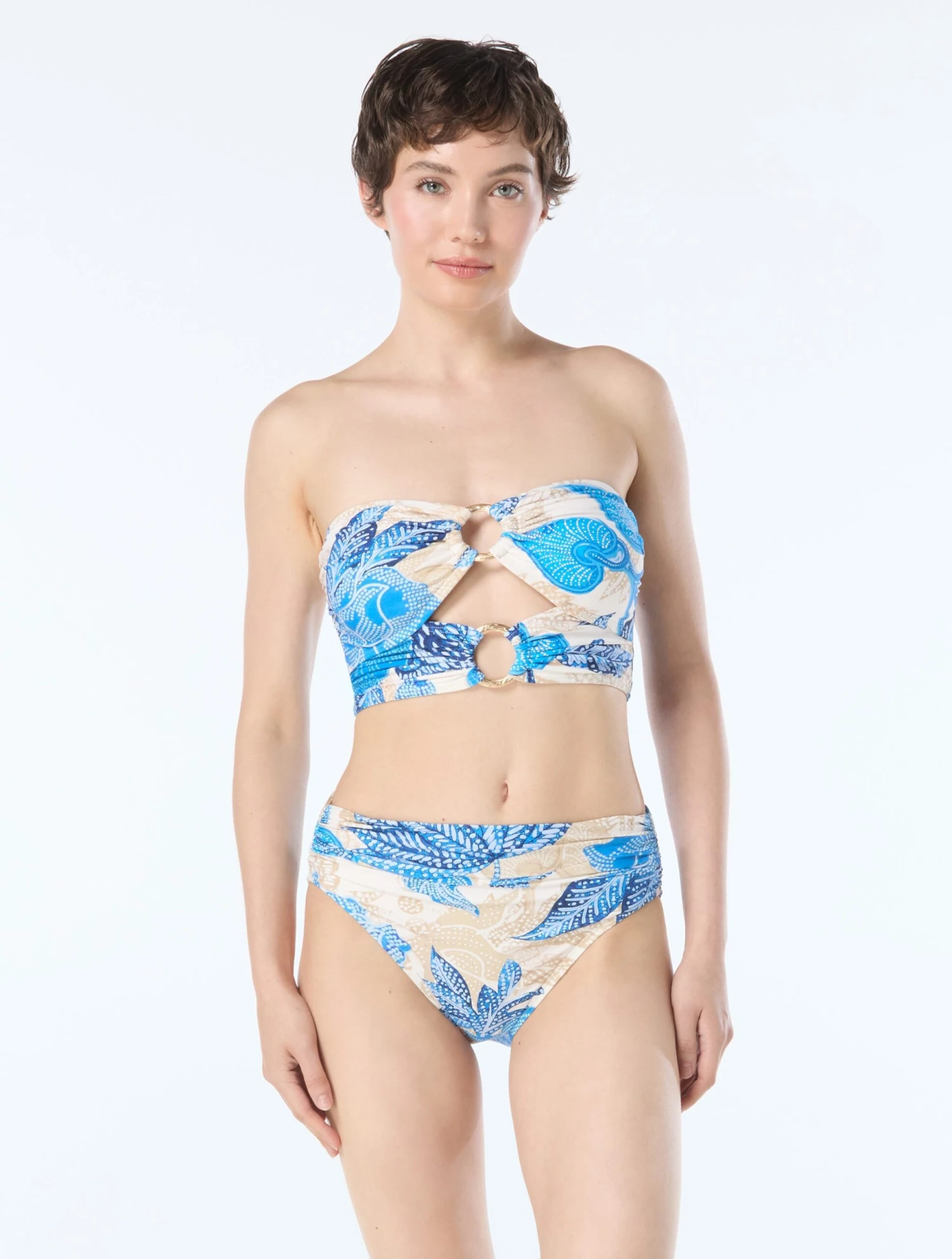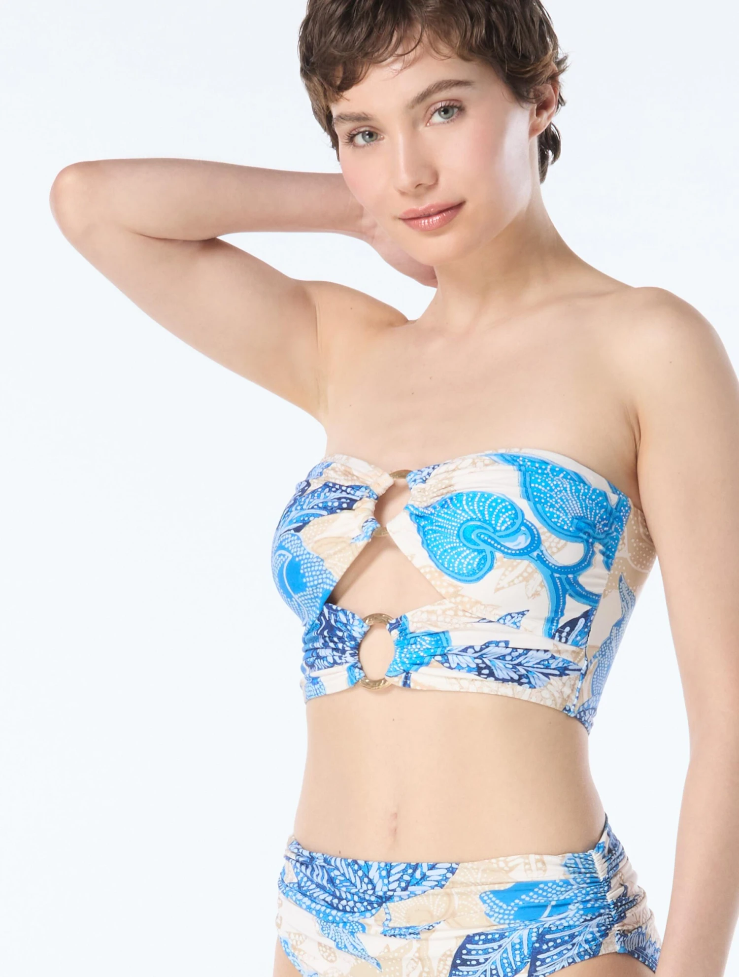 A little longer than a bikini but still just as sexy. This bandeau crop top features a cut out front with luxe ring details. Splashed with a stunning, abstract leaf print.